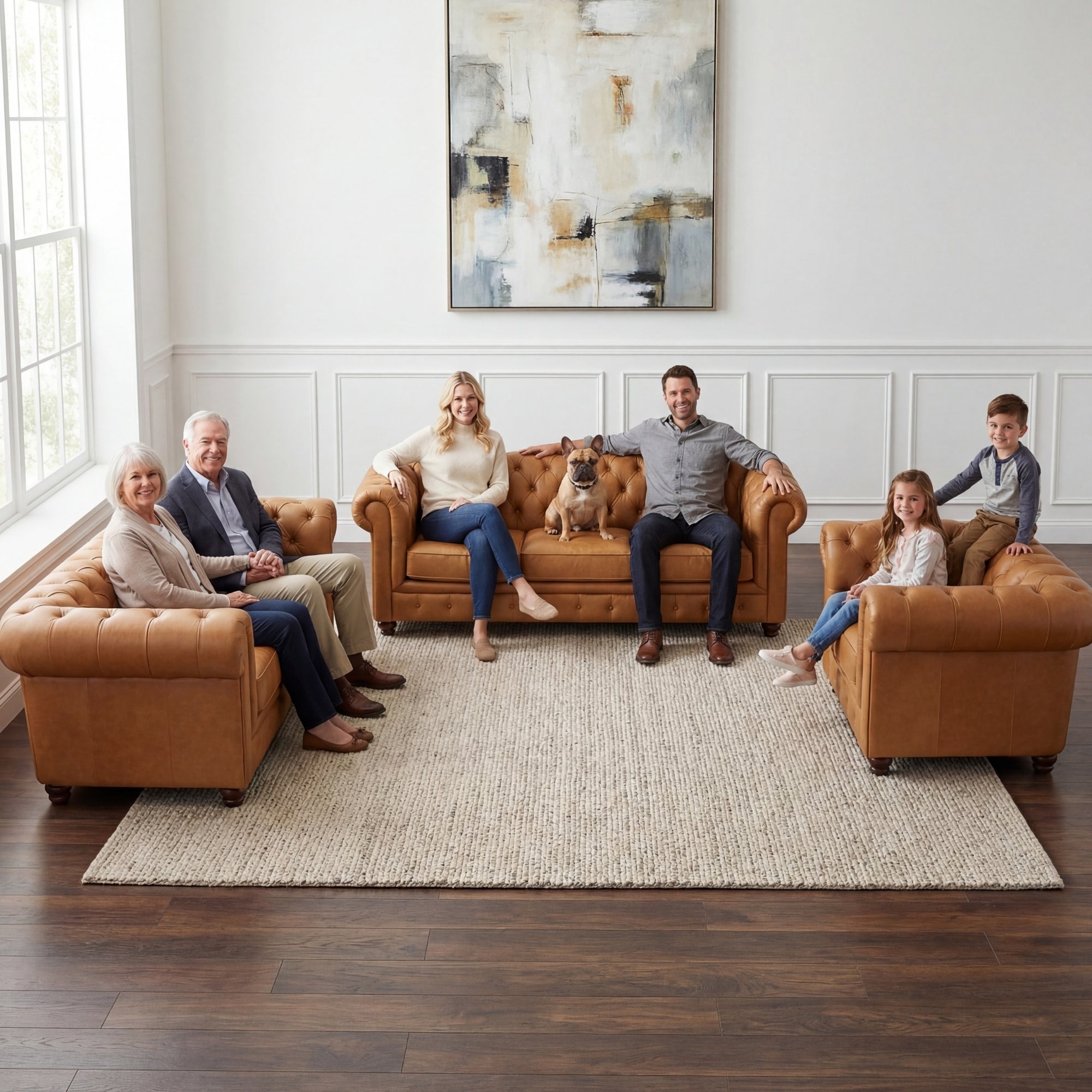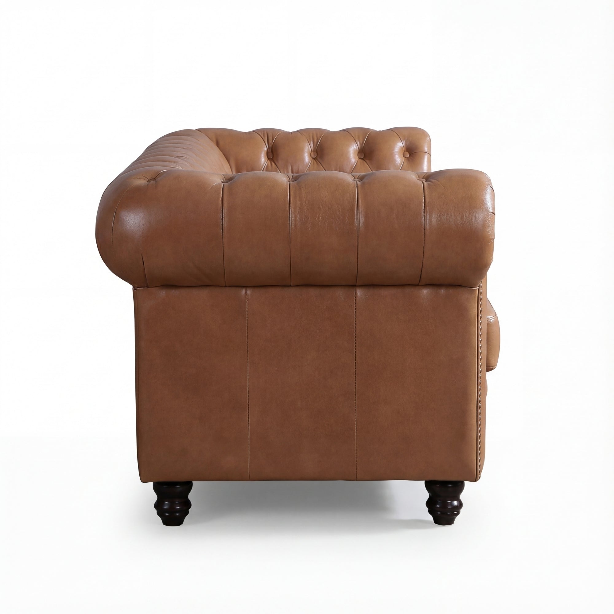 This 3+2+1-seater sofa set in antique tan creates a cosy space in your living area. The sofa, designed in a classic chesterfield style features button tufting, rolled arms and stud details. The set beautifies any interior decor style due to its colour and evergreen design. Upholstered in top grain full leather, the sofas give a nice look. Their structural frame is made of sustainably harvested Malaysian Hardwood, a sturdy solid wood. The high-density foam and zig-zag springs ensure the best seating support. Solid wood legs in dark walnut colour give it a strong base. The sofa is durable as well. The frame has a five-year warranty; the foam and springs have a three-year warranty; the leather and stitching have a one-year warranty; and all other parts have a one-year warranty.