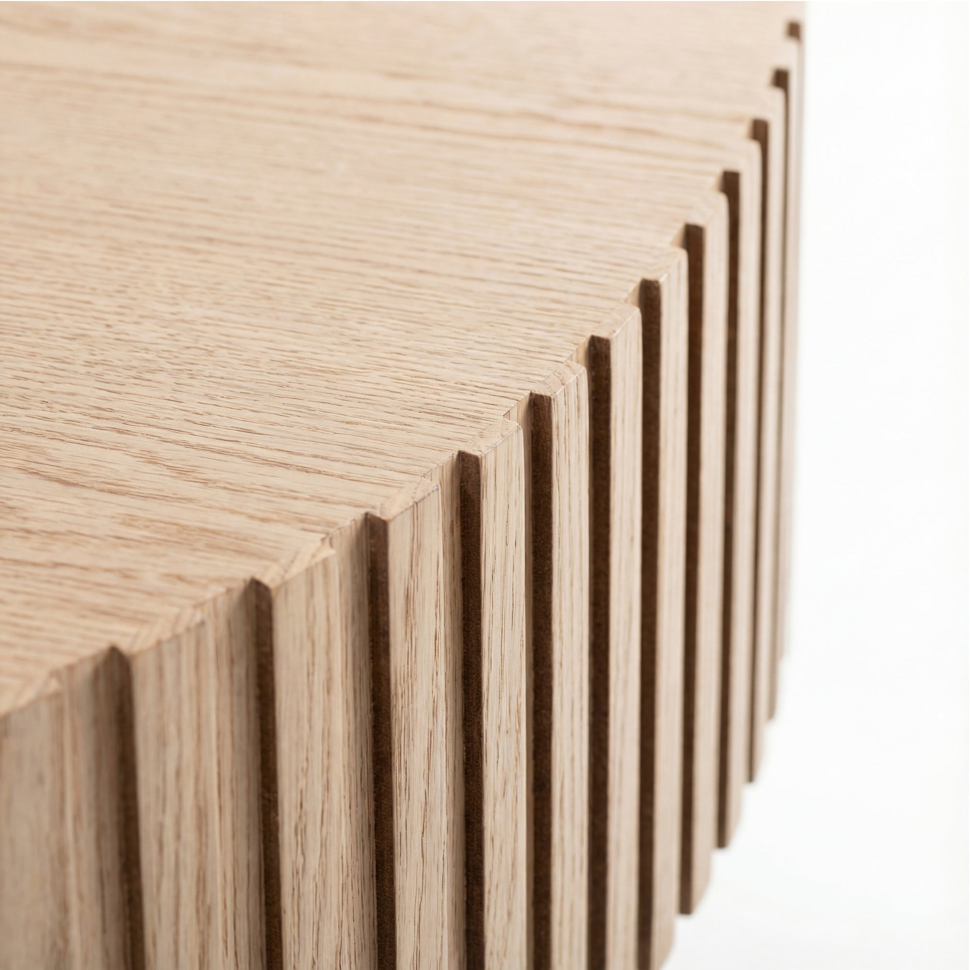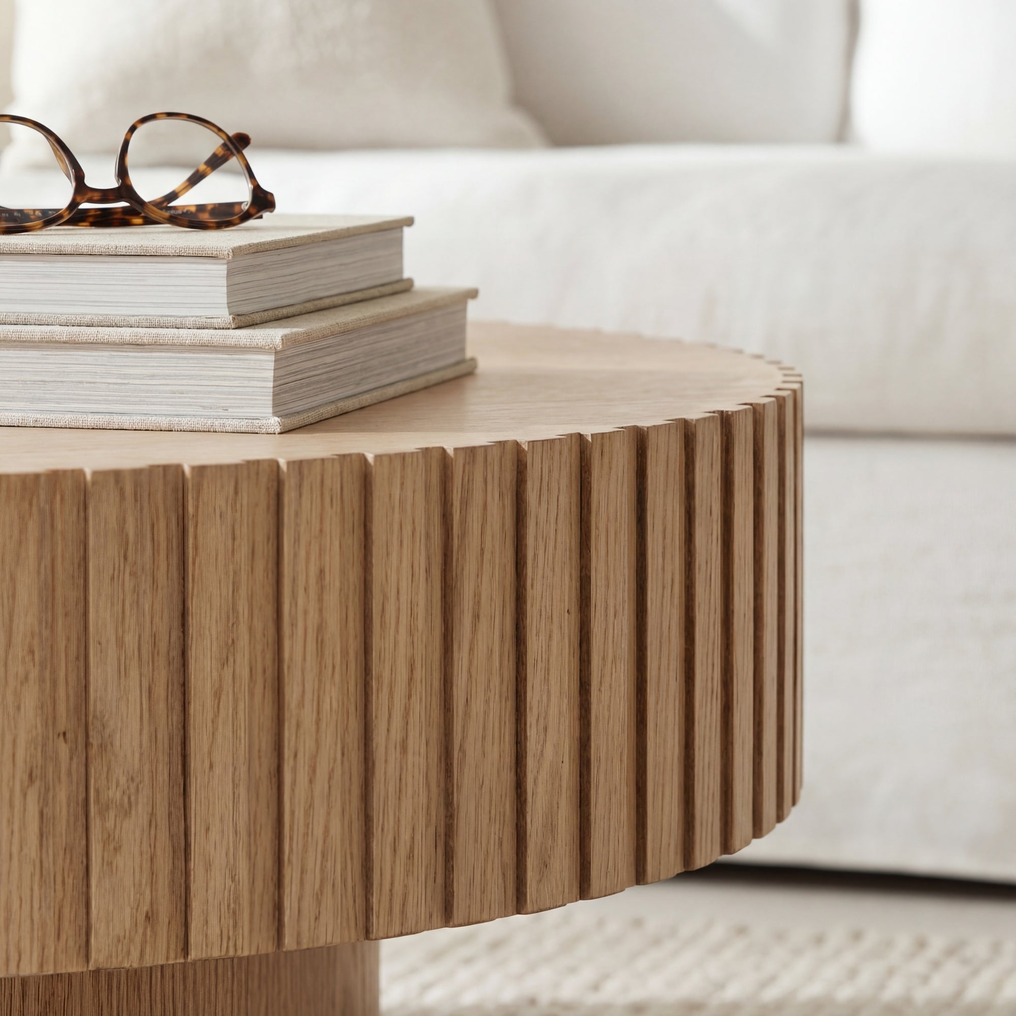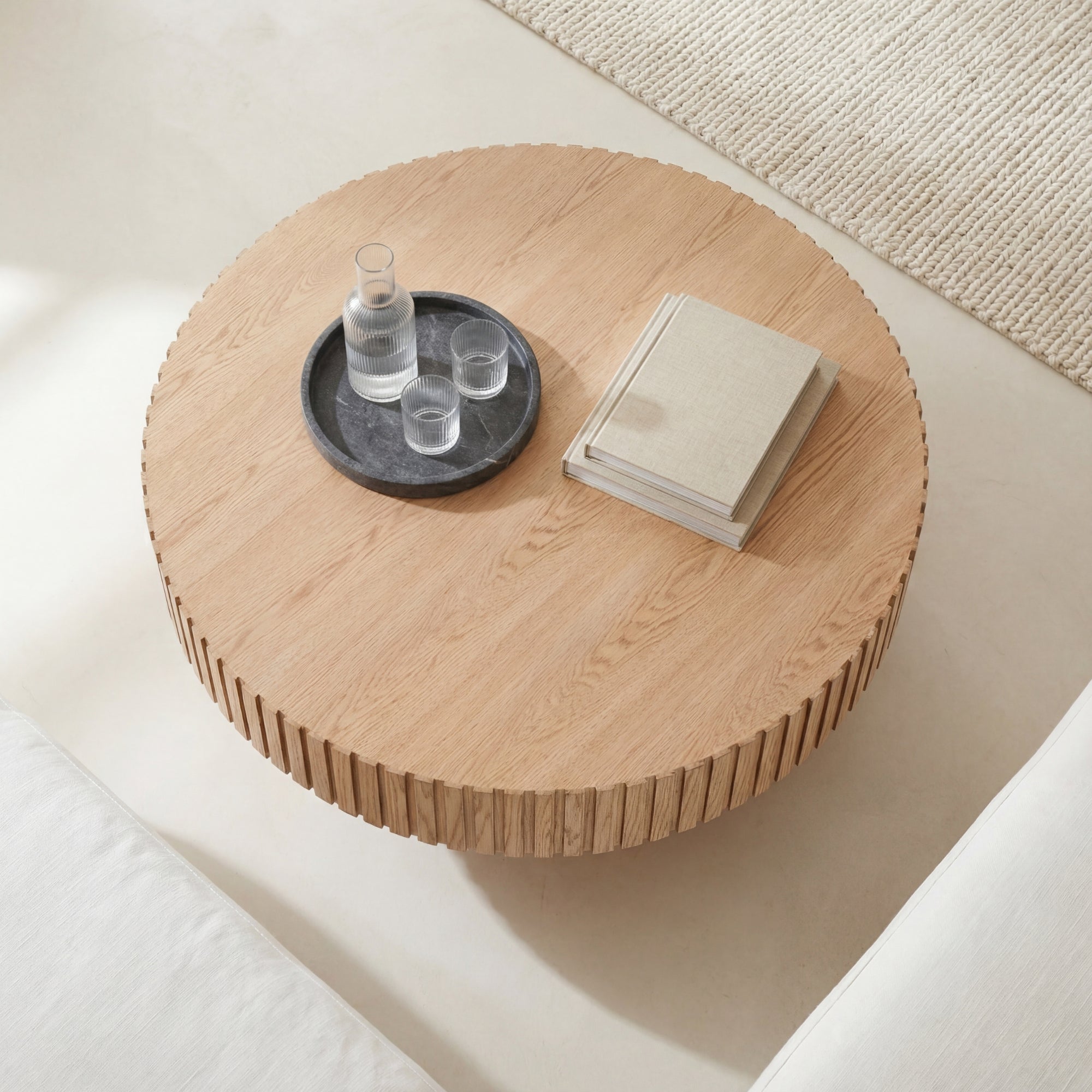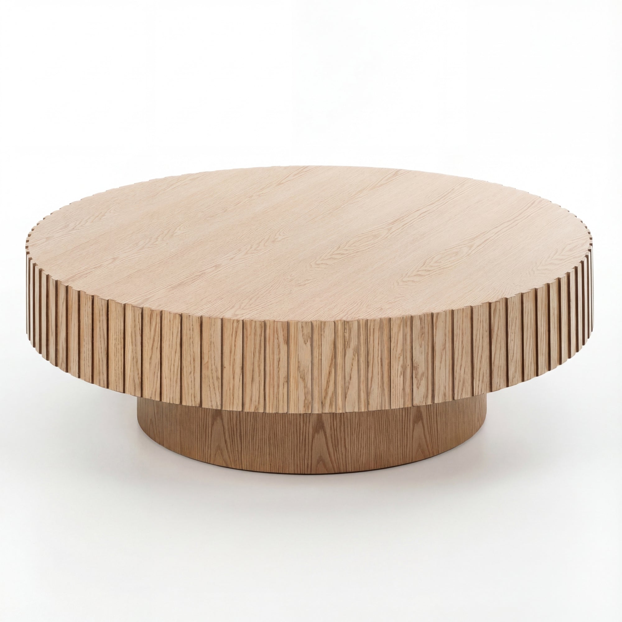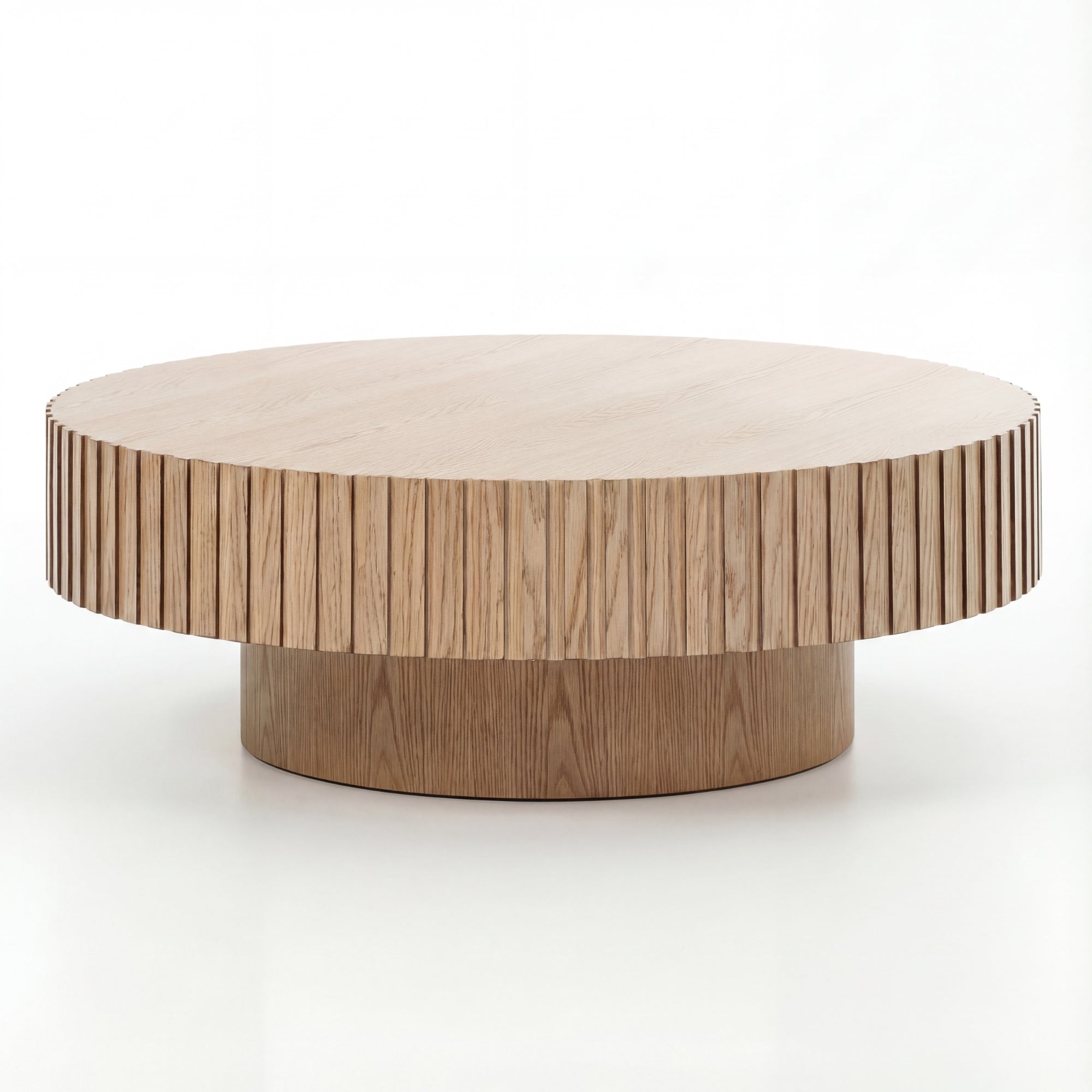 - Round tabletop and round legs with grooved pattern