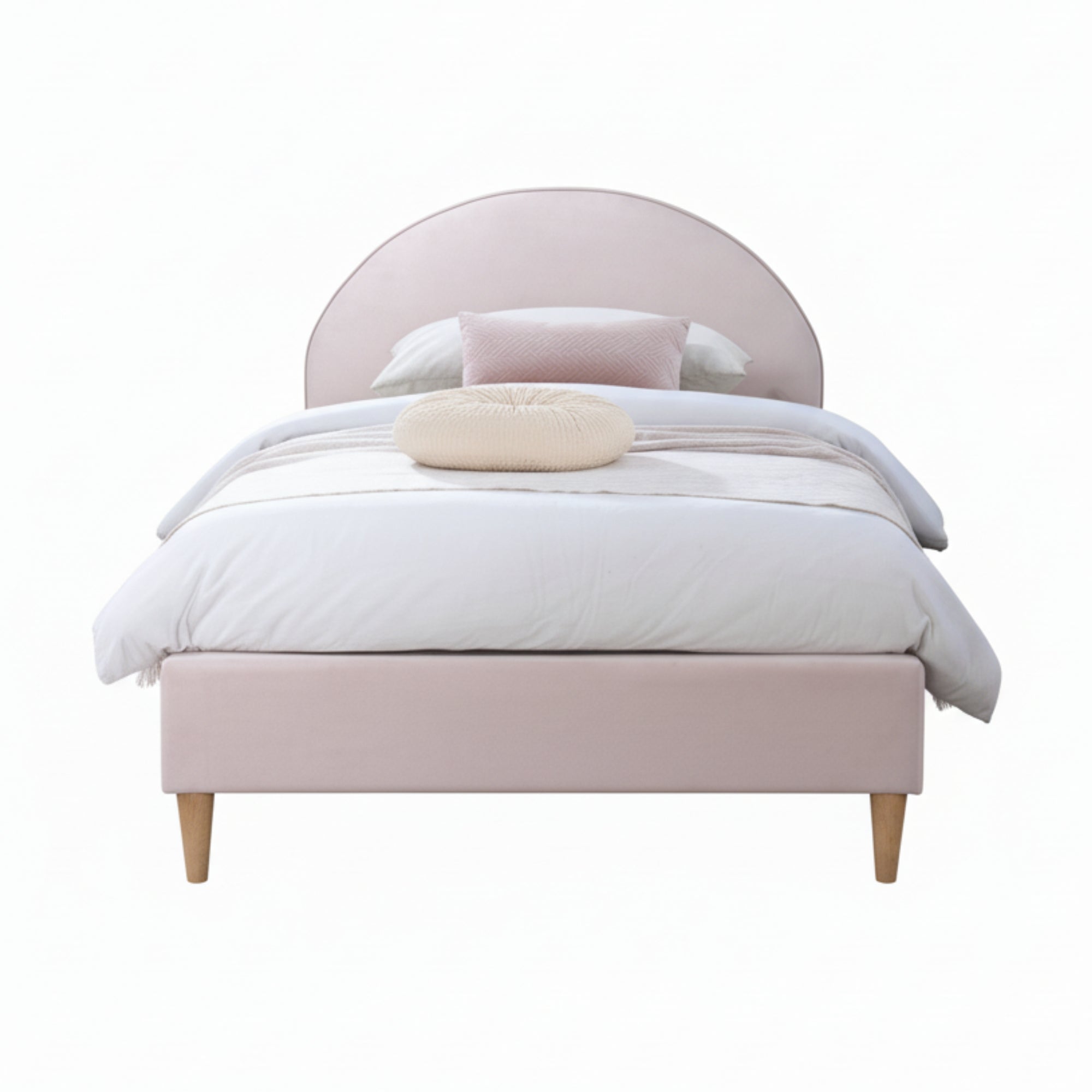 Transform your child’s bedroom or guest space with this Velvet Pink Single Bed. Its arched headboard with elegant piping details adds a stylish touch, while the fully upholstered frame ensures a cozy feel. The foam-padded headboard provides extra comfort for lounging or reading, and the tapered rubberwood legs in a natural finish create a beautiful contrast. Designed for durability, this bed supports up to 150 kg, making it a practical and attractive addition to any home.