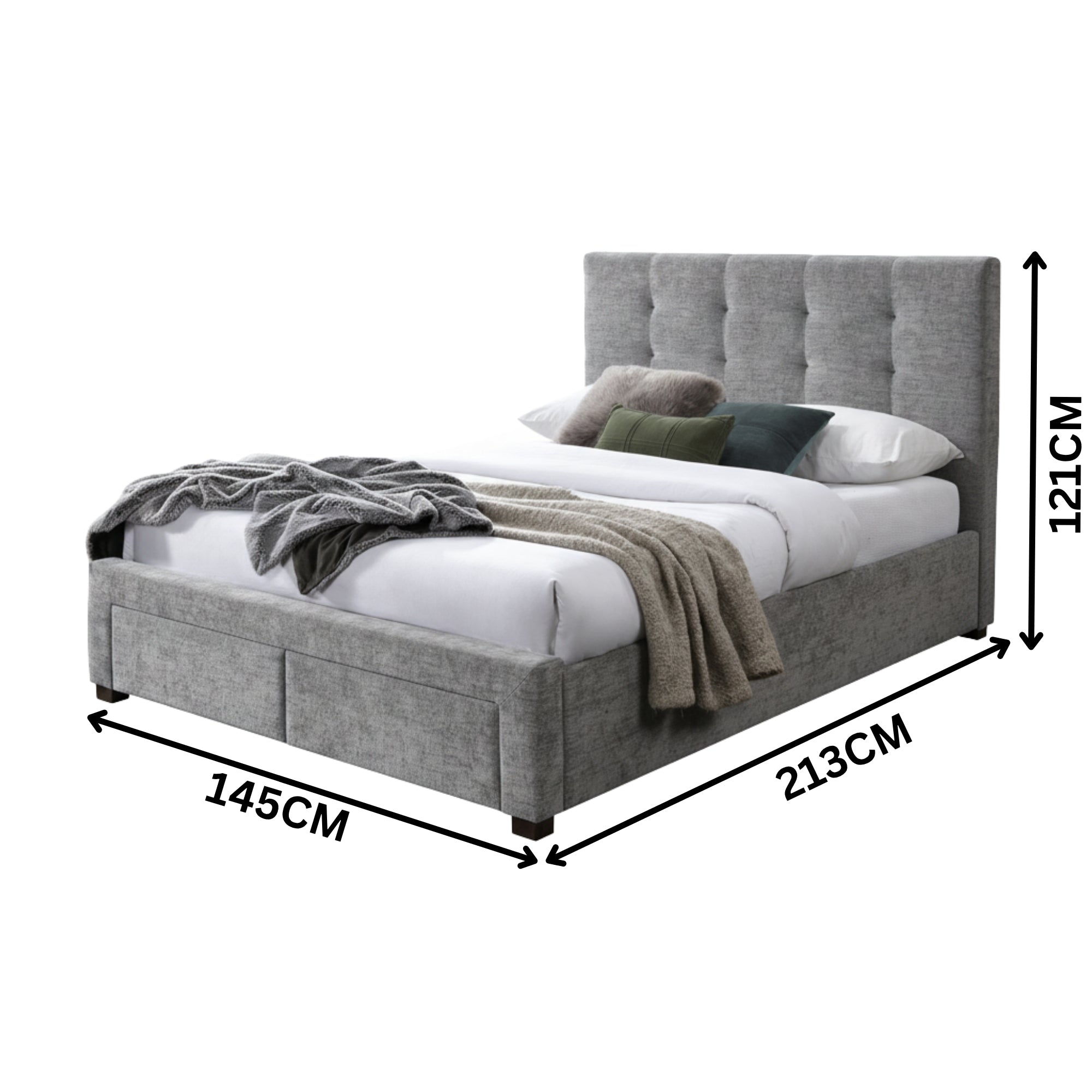 Introduce comfort, functionality, and modern charm to your bedroom with this 2 Drawer Double Bed in Light Grey Colour. Designed to blend elegance with practicality, this bed offers a perfect balance of style, durability, and storage efficiency - ideal for contemporary Australian homes. The bed features a beautiful grid-patterned bedhead, adding a refined touch to your room while maintaining a minimalist aesthetic. The two built-in drawers in the footend provide convenient storage for linens, blankets, and other bedroom essentials - keeping your space tidy and clutter-free. Upholstered in soft-touch polyester fabric in an elegant light grey tone, this bed brings warmth and sophistication to any decor style. The rubberwood legs paired with a strong slatted base and central support beam ensure reliable strength and lasting comfort for years of use. With a 300kg maximum weight capacity and thoughtful craftsmanship, this bed offers both everyday functionality and exceptional value for money.