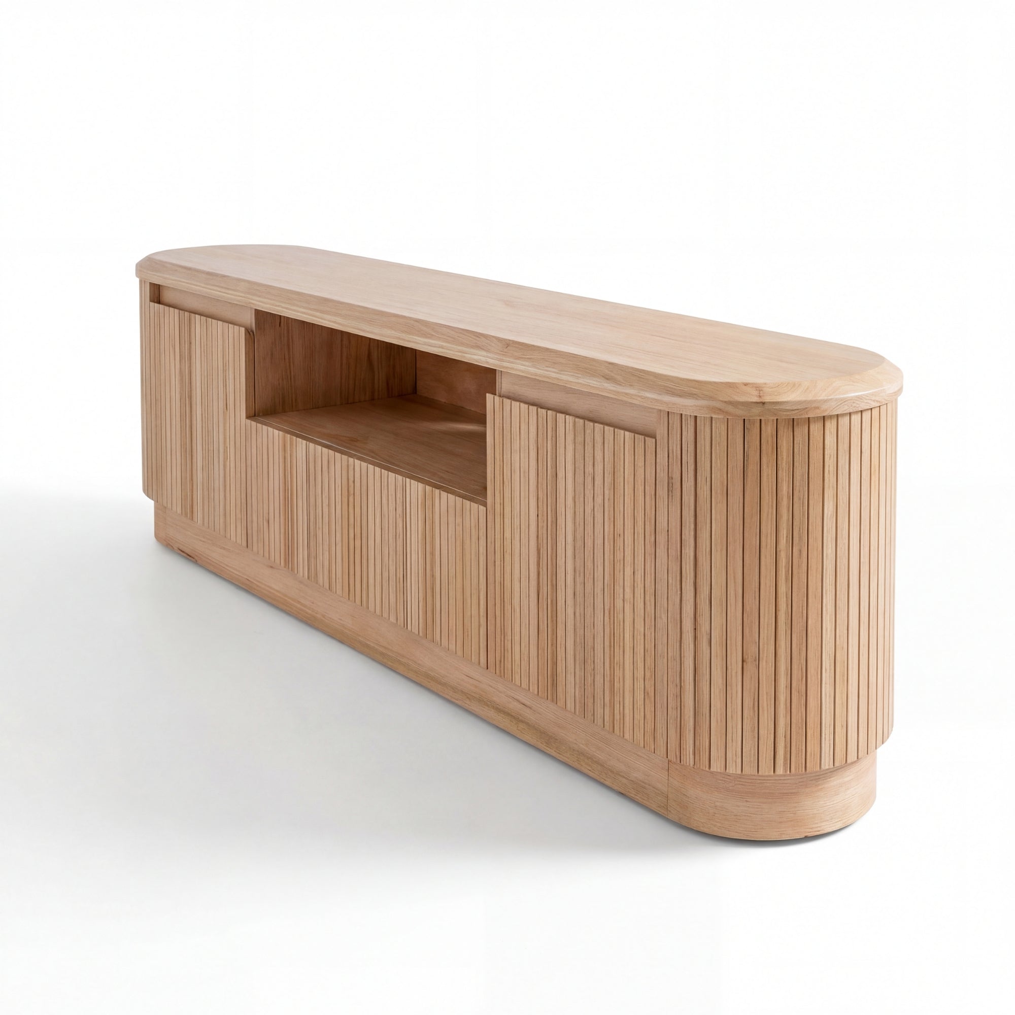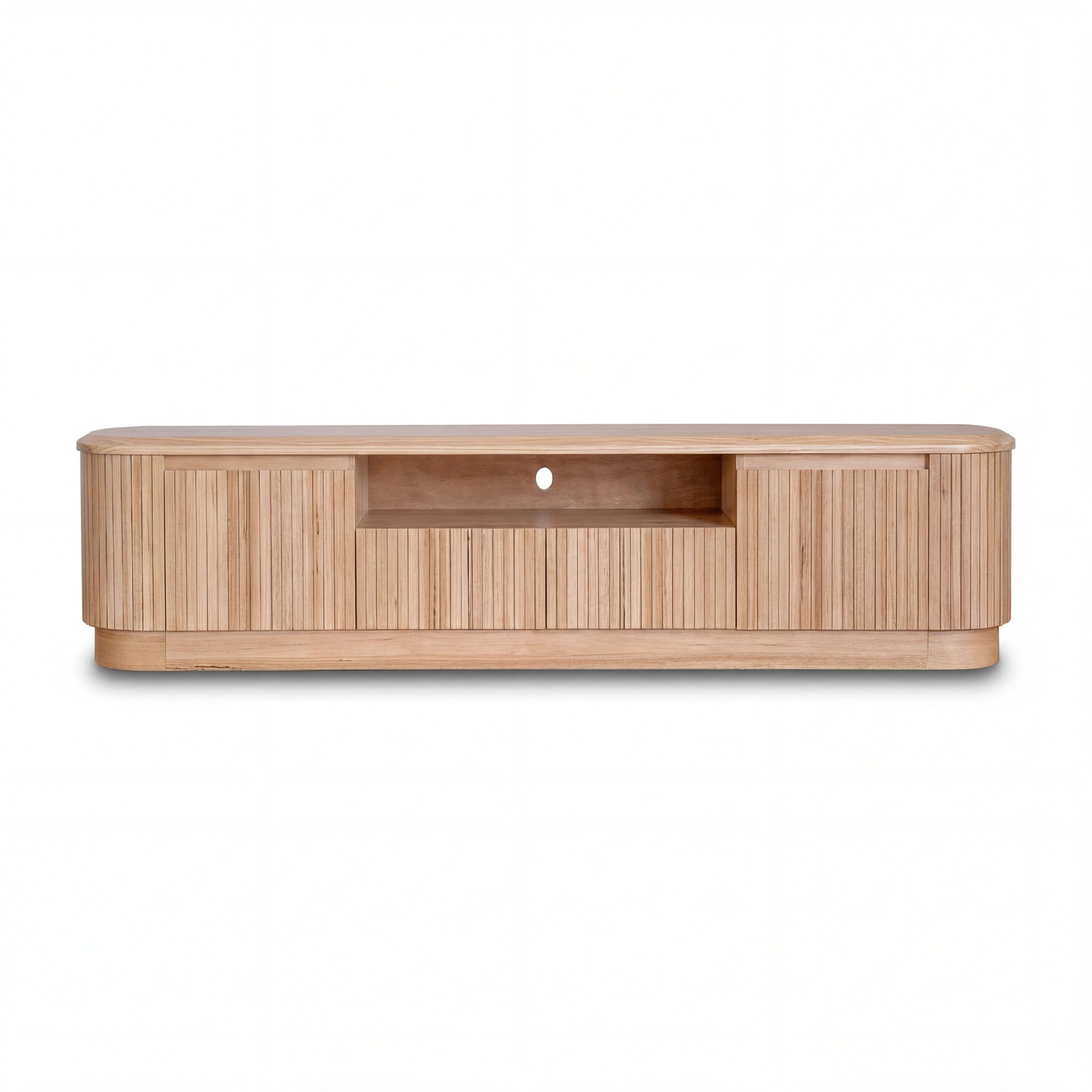 Bring a touch of modern elegance to your living space with this natural ash wood Entertainment TV Unit. Featuring a sleek oval frame with a vertical wood slat design, it blends contemporary aesthetics with practical functionality. The elevated top creates an open compartment, while two drawers and two door cabinets provide ample storage. Designed for convenience, it includes an appliance hole for easy cable management and comes fully assembled for hassle-free use.