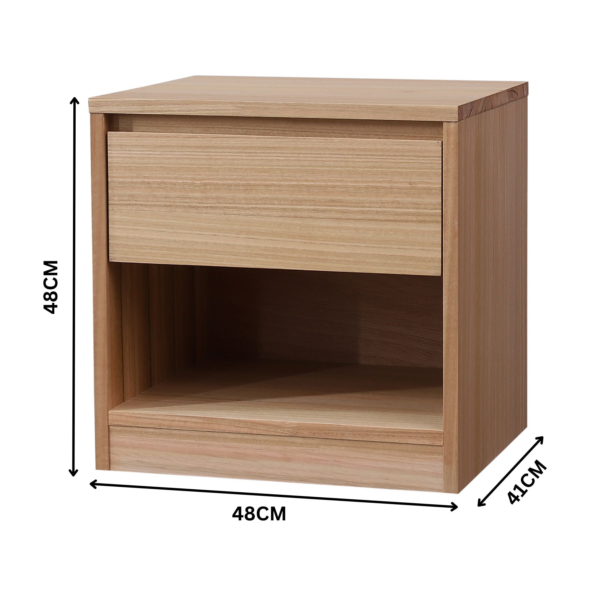 This bedside table designed in a contemporary style gives a cool look to your bedroom. The bedside table has 1 drawer and 1 spacious niche. The drawer is handle-less and has full metal extension runners. It is made of sustainably harvested Solid Messmate and Blue Gum Veneer. The wood combination is known for its amazing strength, durability, and shock-resistance. The bedside in a natural colour matches effortlessly with a variety of interior decor styles and themes, and a one-year warranty is included with the fully assembled furniture piece. Furniture with dimensions of W48 x D41 x H48 CM.
