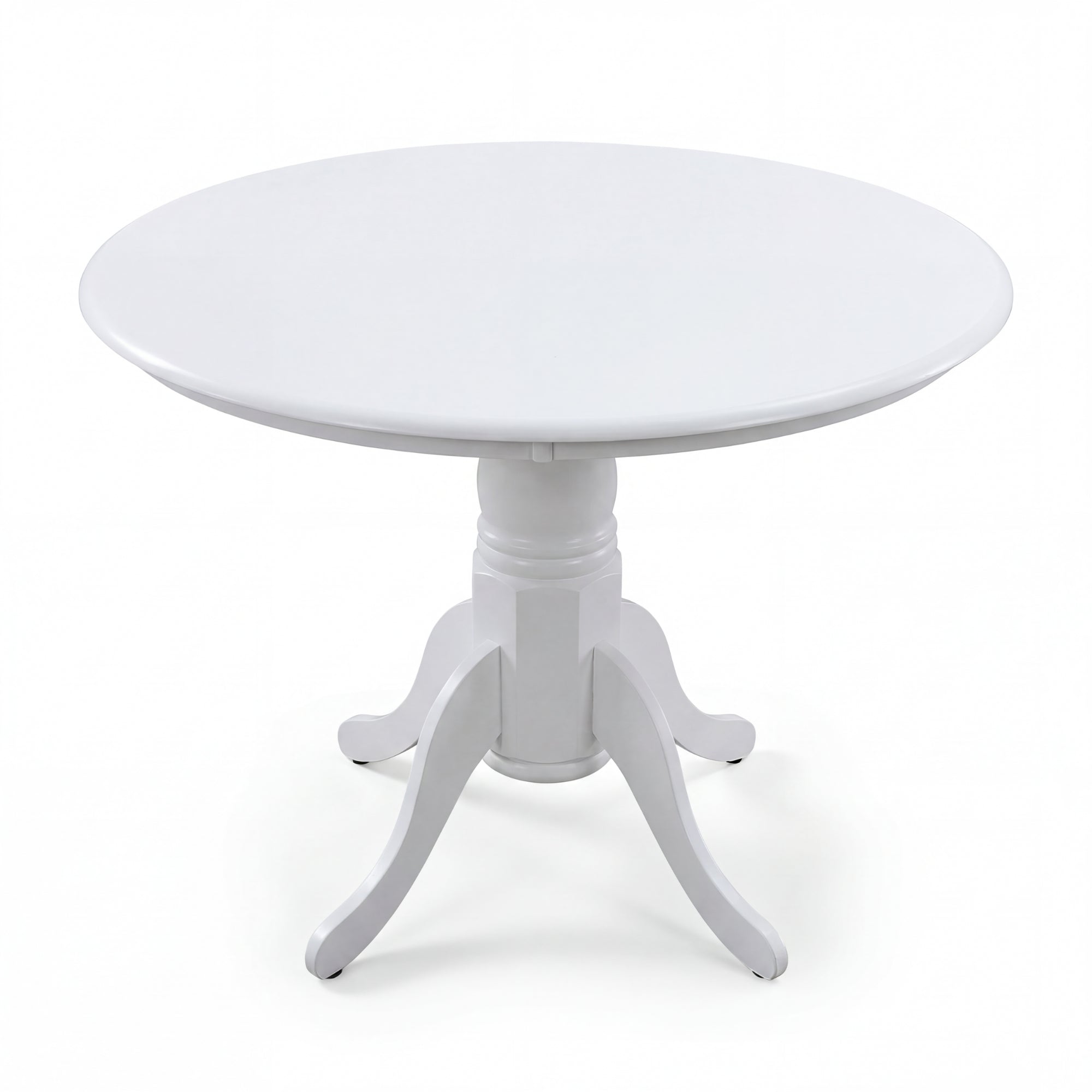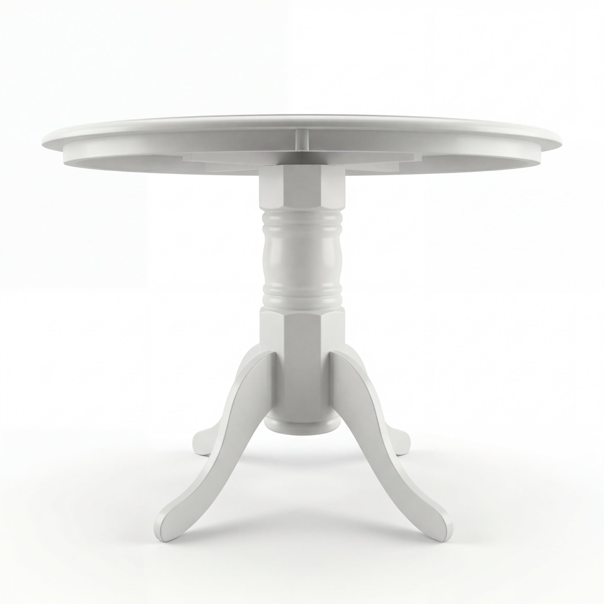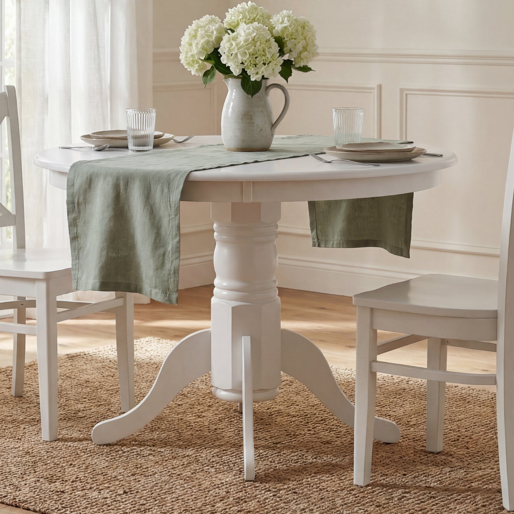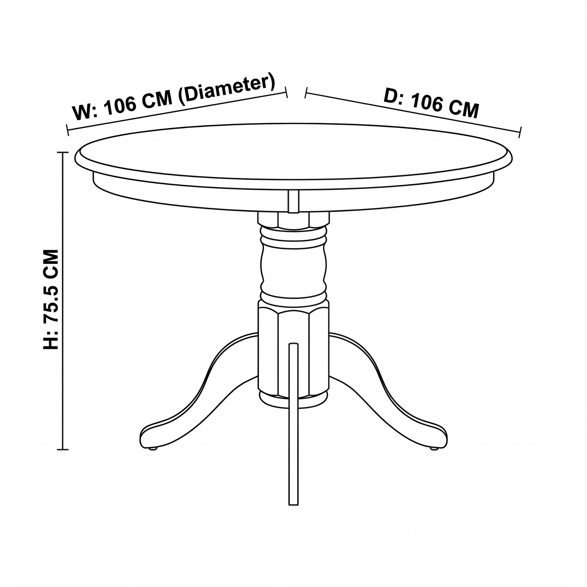 A dining table featuring fine-finishing, elegant lines that speak volumes in terms of design, looks, and aesthetics. This 4-seater round dining table is designed in the country style to give your living area a completely fresh look. The table is made of sustainably harvested rubberwood and is just ideal for small to medium dining spaces. The wood gives the furniture piece an impressive quality and great strength. When placed in the dining area, the white-coloured table with a carved pedestal base looks stunning. A one-year warranty is included with the simple-to-assemble dining table.