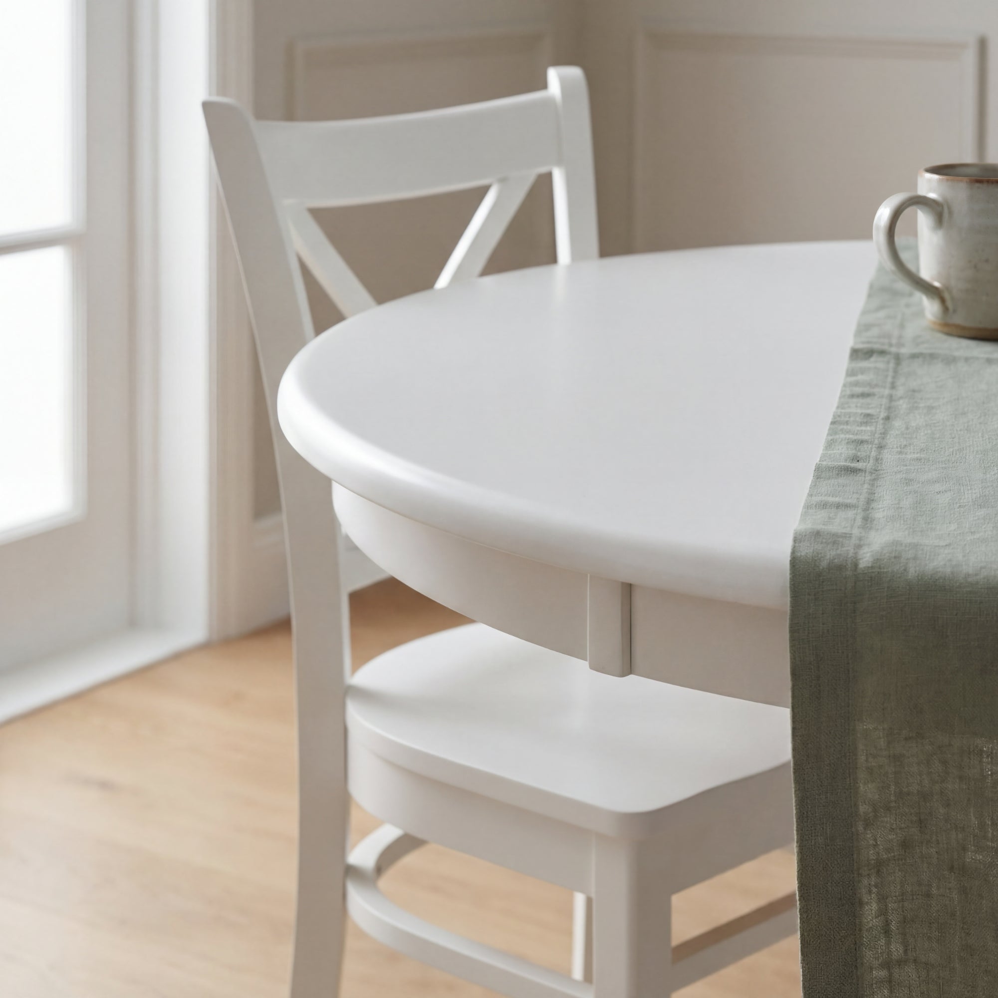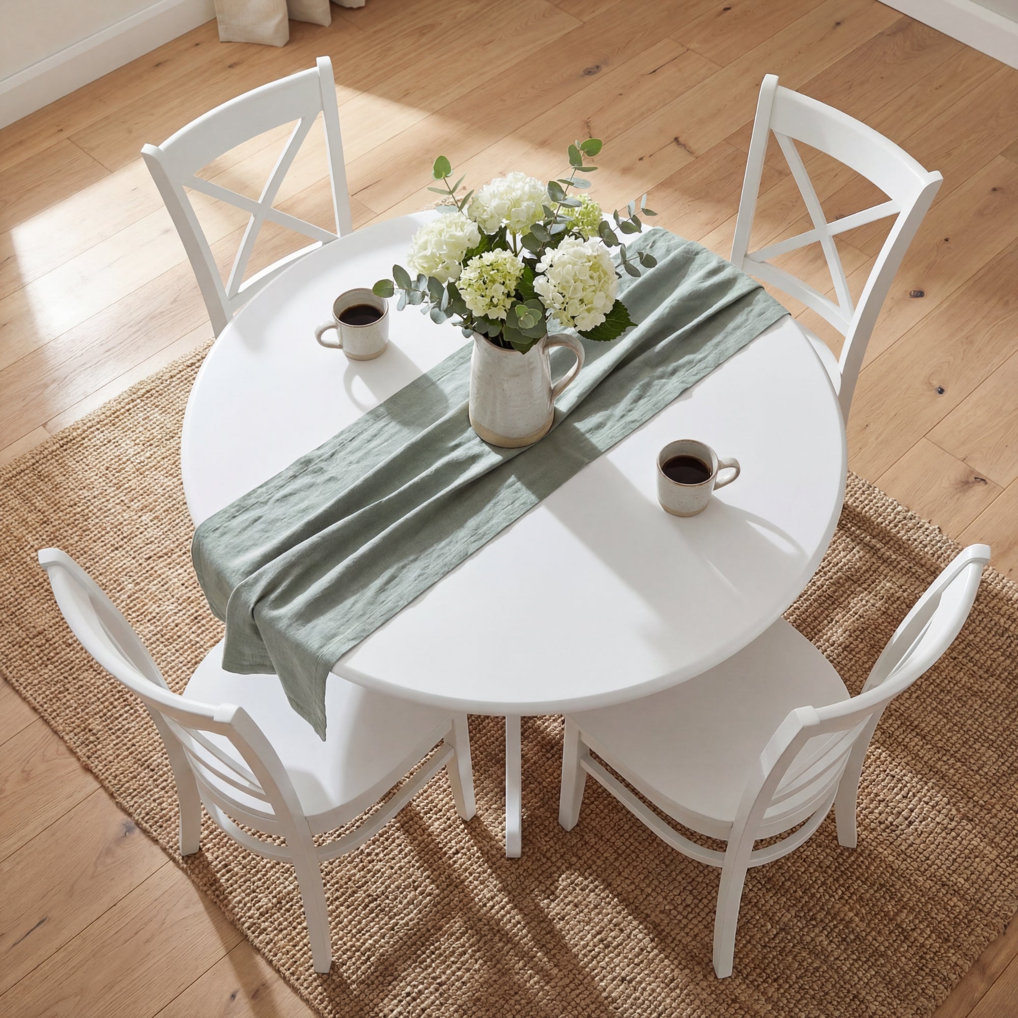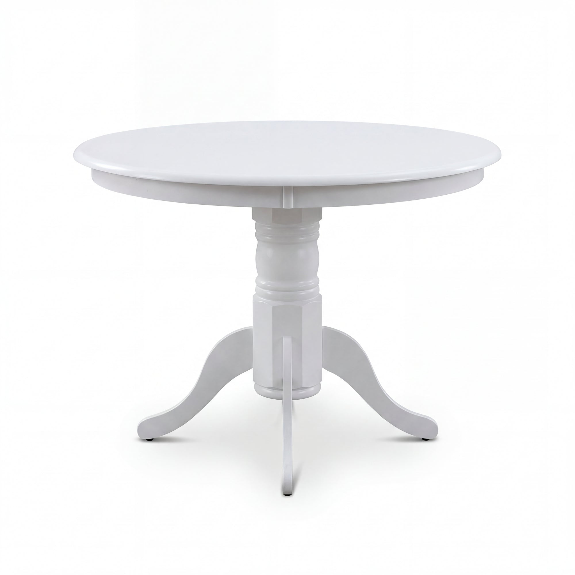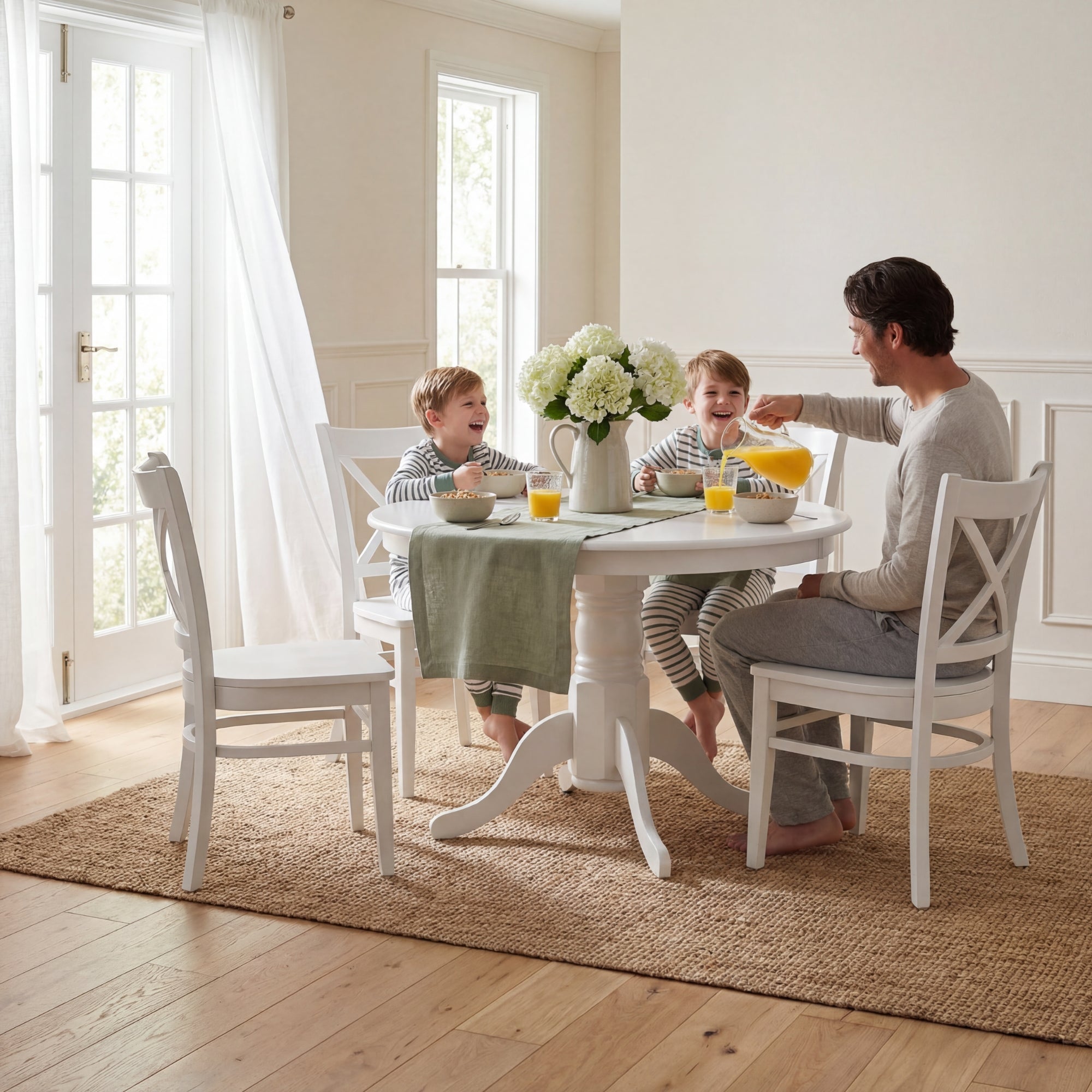 A dining table featuring fine-finishing, elegant lines that speak volumes in terms of design, looks, and aesthetics. This 4-seater round dining table is designed in the country style to give your living area a completely fresh look. The table is made of sustainably harvested rubberwood and is just ideal for small to medium dining spaces. The wood gives the furniture piece an impressive quality and great strength. When placed in the dining area, the white-coloured table with a carved pedestal base looks stunning. A one-year warranty is included with the simple-to-assemble dining table.