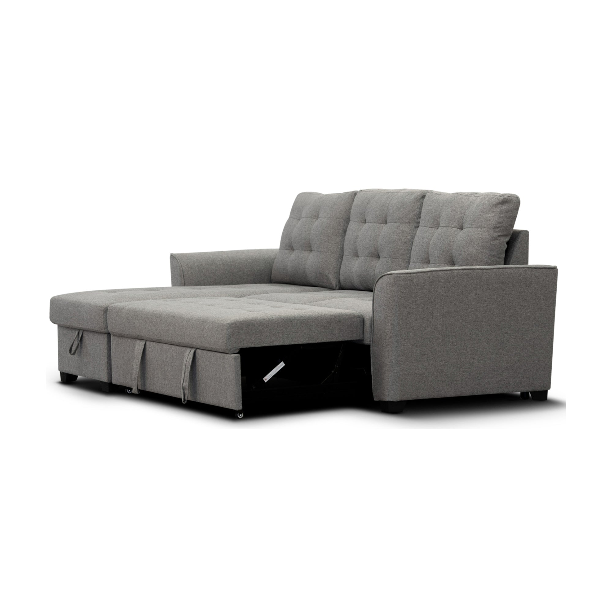 Upgrade your living space with this 2-Seater Sofa Bed with Reversible Storage Chaise in Grey, a smart fusion of modern design and practical functionality. This versatile sofa transforms effortlessly from a stylish lounge to a comfortable bed, making it perfect for compact apartments or guest spaces. Featuring a pull-out sofa bed and lift-top storage chaise, it offers the ideal balance of comfort, convenience, and space-saving innovation. The reversible chaise allows flexible configuration to suit your room layout, whether left-hand or right-hand facing. Upholstered in high-performance 100% polyester fabric with elegant button tufting, this piece brings both style and durability to your home.