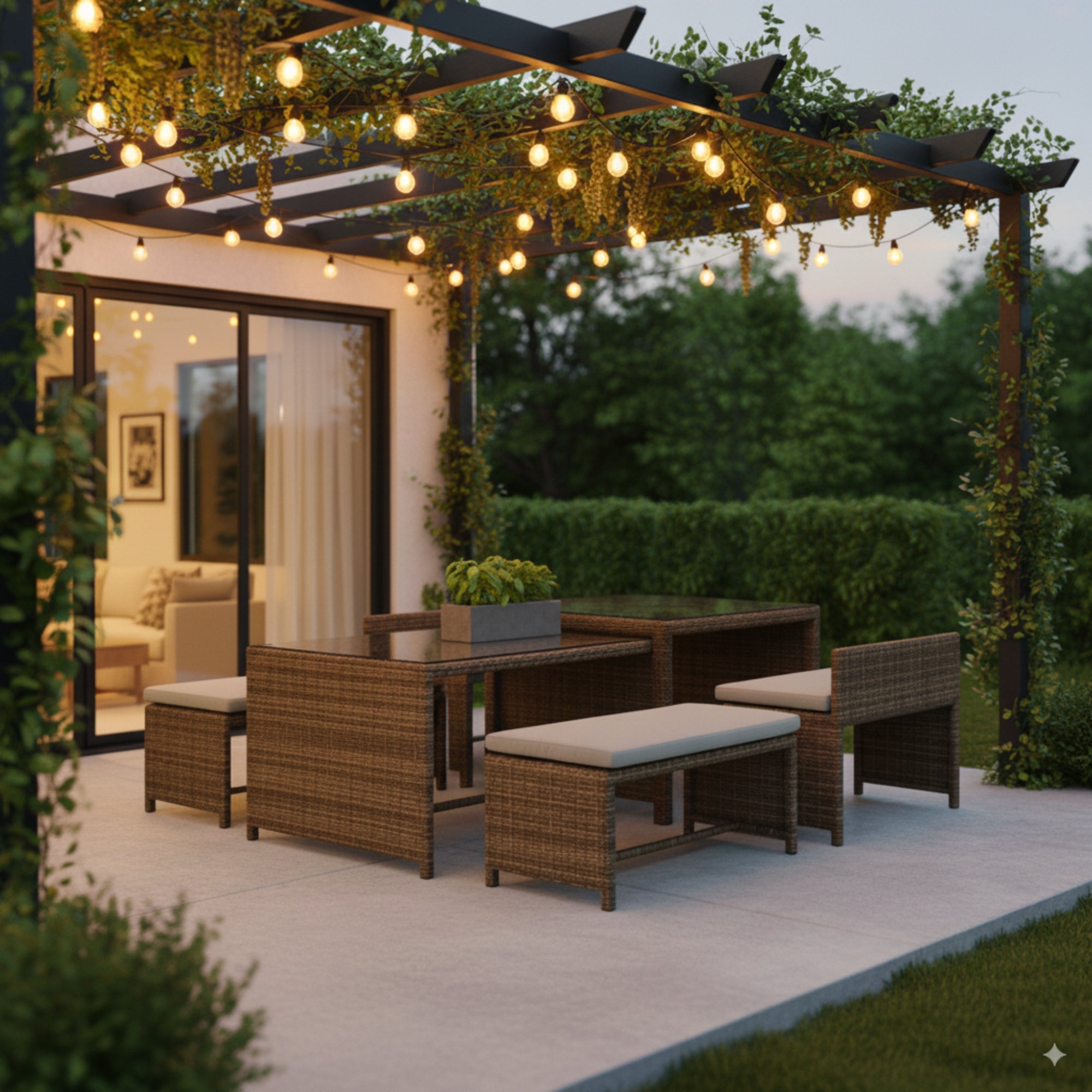 Bring versatility and comfort to your outdoor dining with this 6pc dining bench set in brown colour. Designed with a smart space-saving approach, this set includes two nested dining tables, two backless benches, and two benches with back support. When not in use, the smaller table and benches fit neatly under the larger dining table, keeping your outdoor area organised and clutter-free. Crafted with a sturdy aluminium frame wrapped in durable PE wicker, this set is built to endure Australia's outdoor conditions. The tempered glass tabletop offers a sleek, low-maintenance finish, while the 5mm thick seat cushions - upholstered in weatherproof, water-repellent, and UV-protected polyester - ensure comfort and longevity. Perfect for patios, courtyards, or garden dining areas, this set combines practicality, comfort, and modern outdoor style.