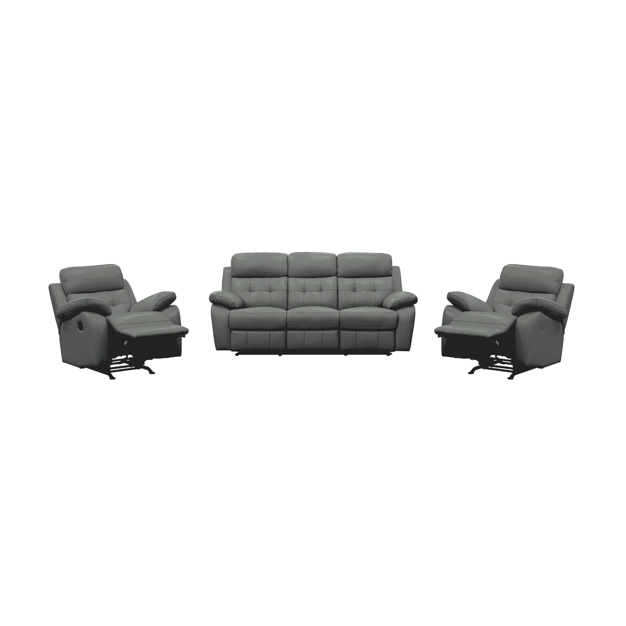 Upgrade your living space with this 3RR + R + R Lounge Set in Grey, a plush leather suite designed for ultimate comfort and style. The set includes 1pc 3-seater recliner and 2pc 1-seater recliners, each featuring manual recliner action for personalized relaxation. With generous seating, padded armrests, and supportive back cushions, this lounge set provides excellent neck and lumbar support. The tufted back and detailed stitching enhance its modern aesthetic, while the durable plywood frame and premium seating support ensure long-lasting performance. Ideal for living rooms or entertainment spaces, this lounge set combines luxury, comfort, and durability in a sleek grey finish.