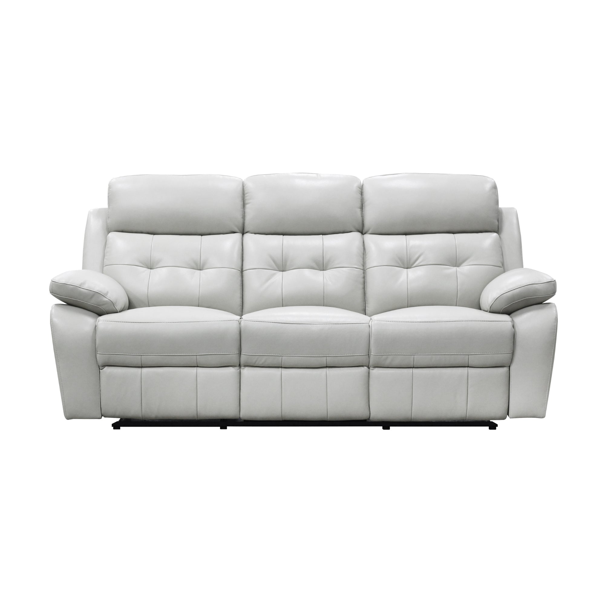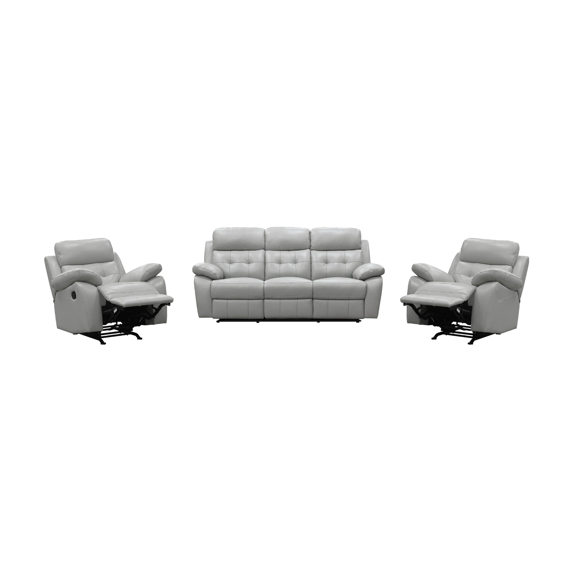 Upgrade your living space with this 3RR + R + R Lounge Set in Silver, a plush leather suite designed for ultimate comfort and style. The set includes 1pc 3-seater recliner and 2pc 1-seater recliners, each featuring manual recliner action for personalized relaxation. With generous seating, padded armrests, and supportive back cushions, this lounge set provides excellent neck and lumbar support. The tufted back and detailed stitching enhance its modern aesthetic, while the durable plywood frame and premium seating support ensure long-lasting performance. Ideal for living rooms or entertainment spaces, this lounge set combines luxury, comfort, and durability in a sleek silver finish.