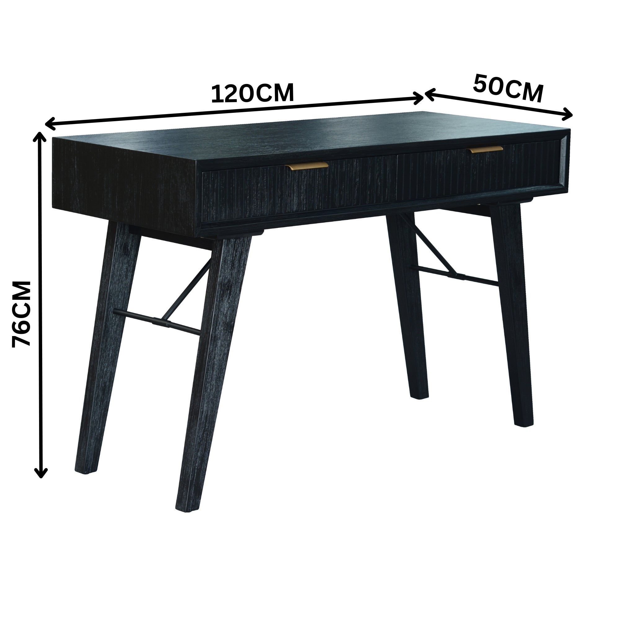 Add a touch of elegance and functionality to your hallway, living room, or bedroom with this 2 Drawer Desk. Expertly crafted from solid Acacia in a brushed black finish, this table combines traditional construction with modern design elements, featuring refined fluted detailing for visual appeal. The two solid timber drawers glide smoothly on full-extension metal runners, offering practical storage for keys, documents, or decor. Brushed gold metal handles provide a luxurious accent, while the table's sturdy frame ensures durability. Functional, stylish, and versatile, this console table is the perfect addition to any home decor.