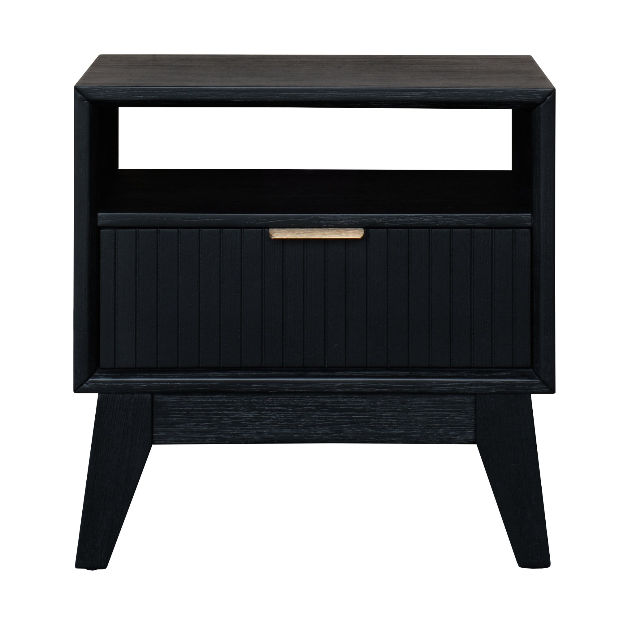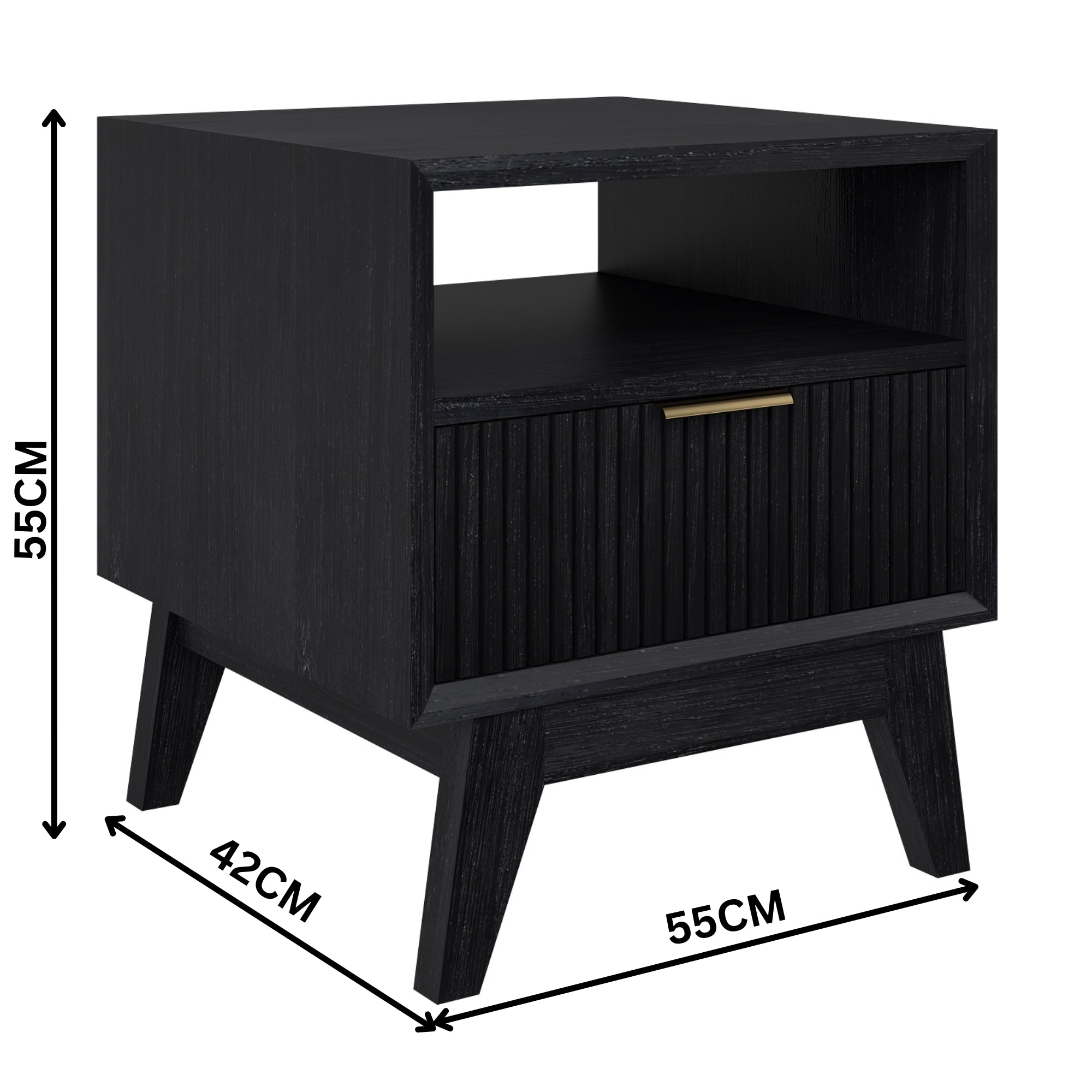 Elevate your living space with this 1 Drawer & Shelf Lamp Table, a stylish and functional addition to any room. Crafted from solid Acacia in a brushed black finish, it features fluted detailing for a touch of sophistication. The table offers a single drawer with full-extension metal runners for smooth access and a lower shelf for extra storage or display. Metal handles in brushed gold enhance the modern aesthetic, while the durable frame ensures long-lasting use. Perfect for placing beside sofas or beds, this lamp table combines practicality, style, and craftsmanship in one elegant piece.