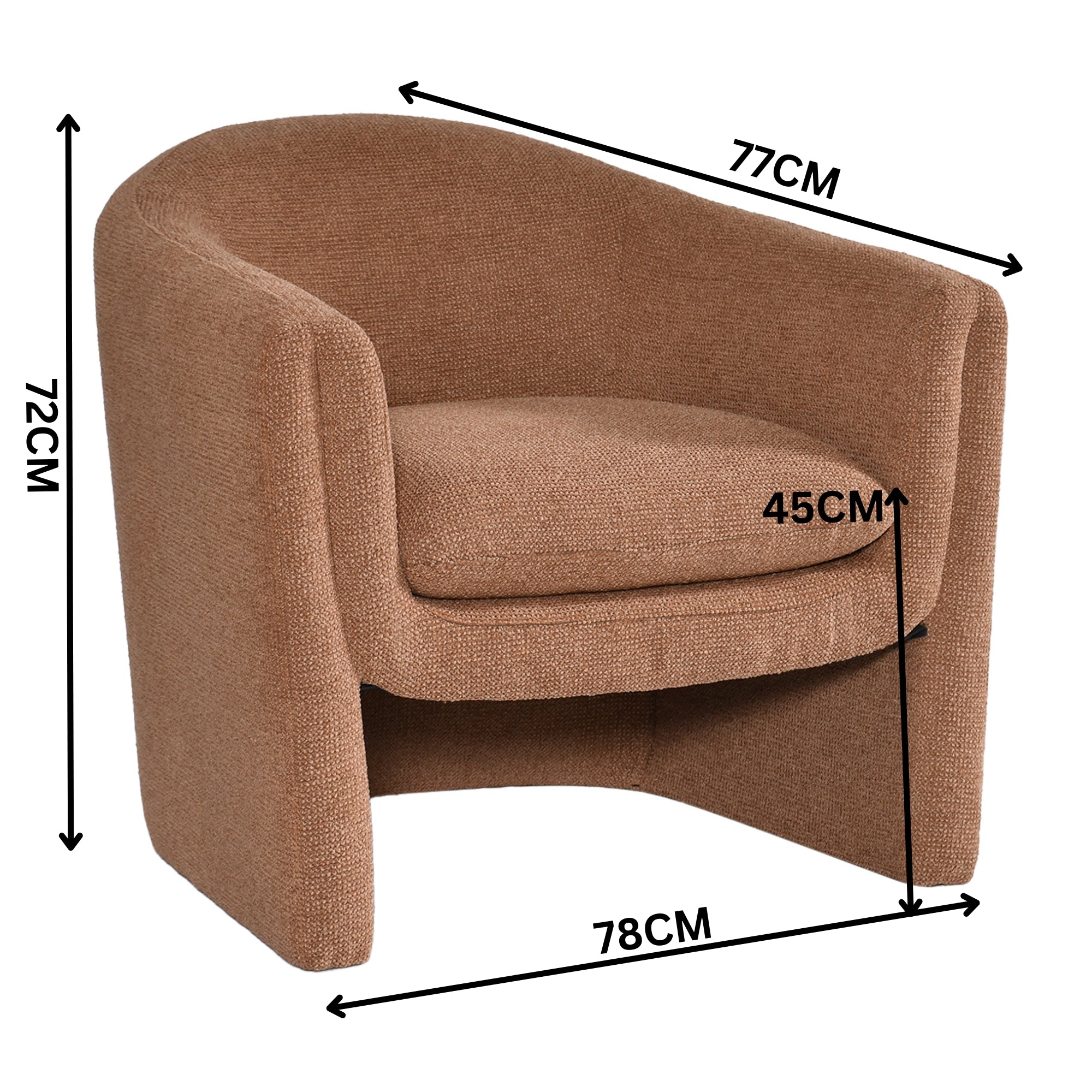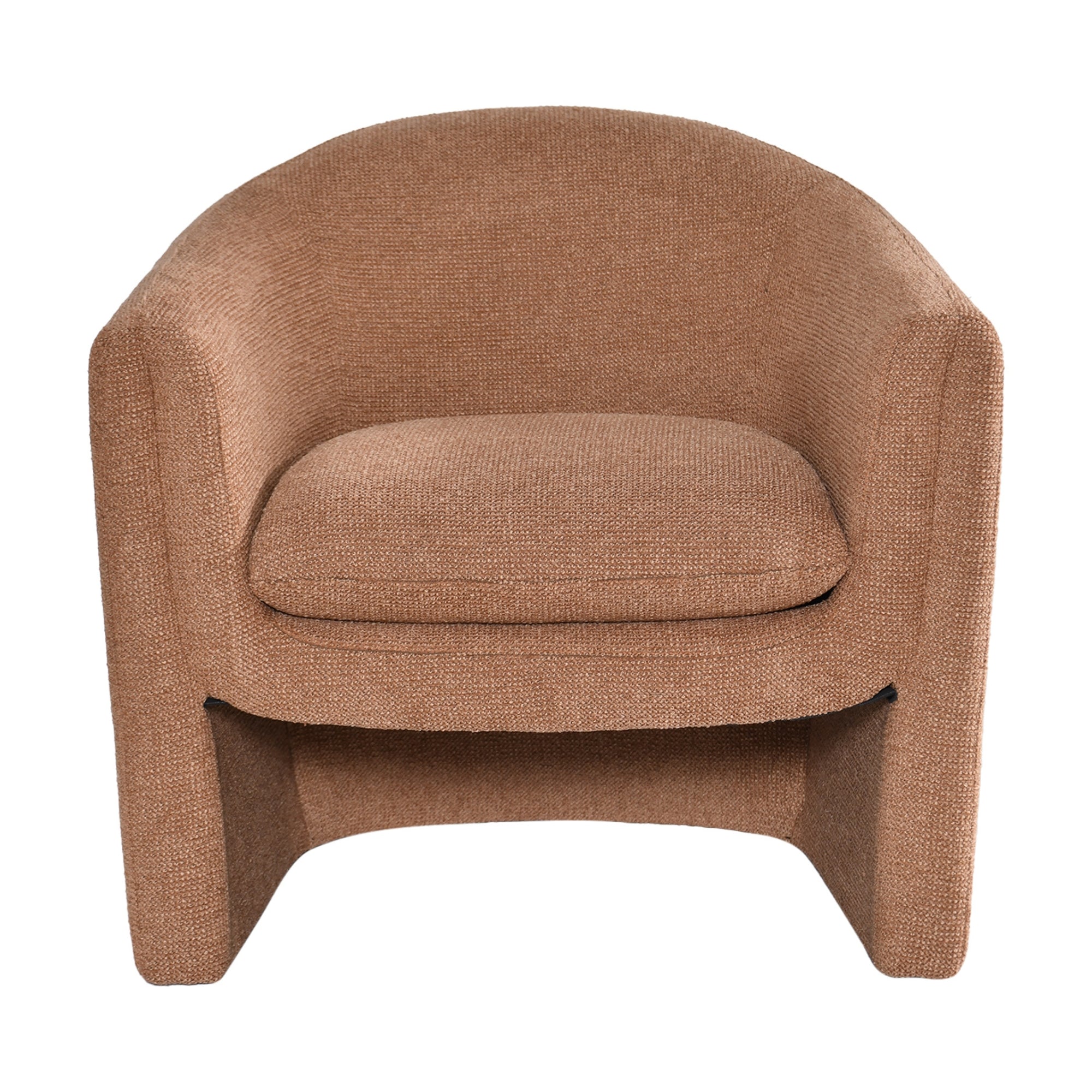 Elevate your living space with this Accent Chair in Cinnamon colour, where modern design meets effortless comfort. This stylish tub-style chair features a low-slung back and soft curved silhouette, creating an inviting look that complements both contemporary and classic interiors. Upholstered in a high-performance polyester fabric with a textured weave and soft feel, the chair combines everyday durability with a luxurious touch. The unique cut-out leg design adds visual appeal and a touch of modern artistry, making it a perfect statement piece for living rooms, bedrooms, or reading corners. Fully assembled for your convenience, this accent chair in a warm cinnamon colour offers understated elegance and comfort from the moment it arrives.