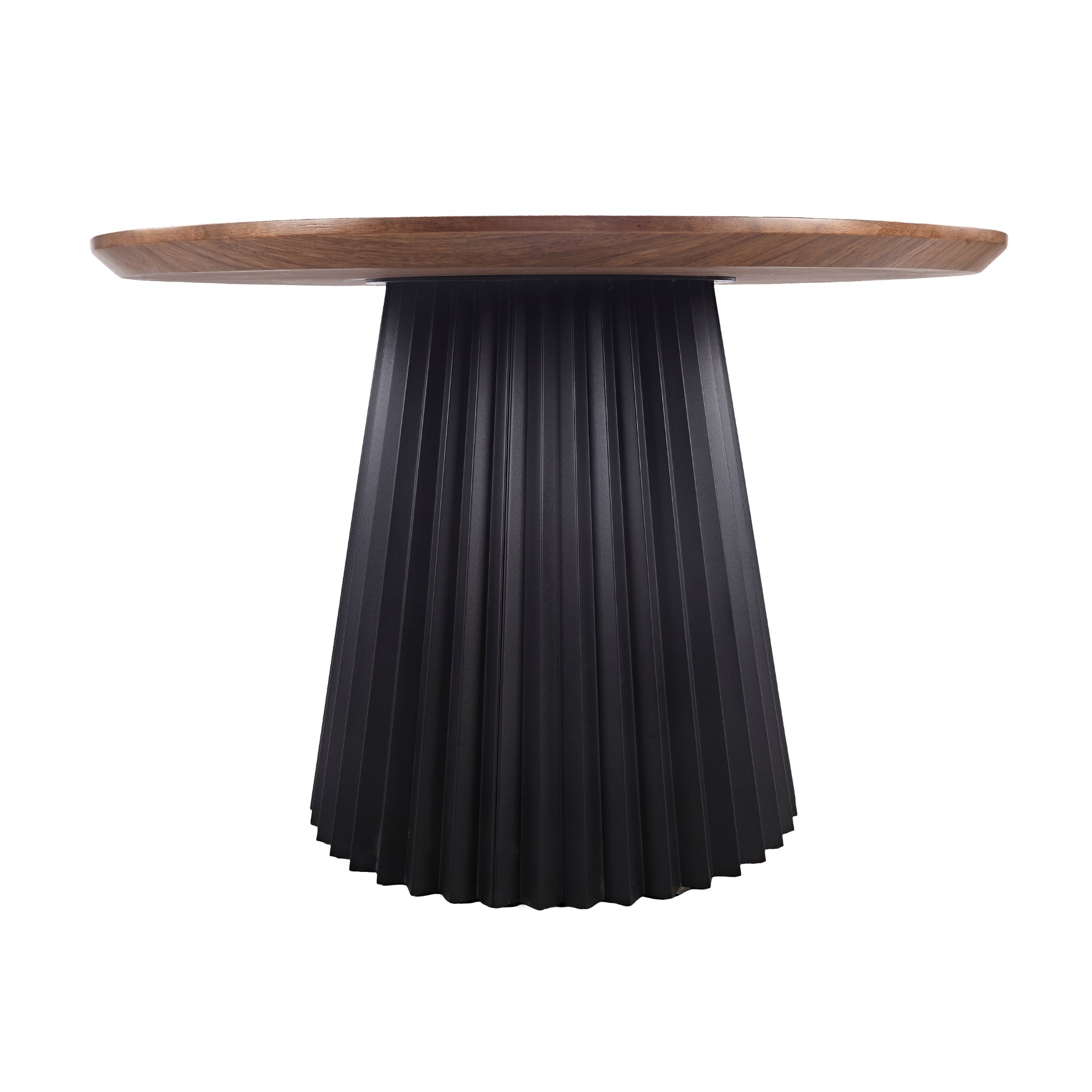 Elevate your dining space with this elegant 130cm Round Dining Table, designed to blend modern style with timeless appeal. The table features a two-tone design, combining a natural veneer top with a stunning radial grain pattern and a black powder-coated fluted metal base. Its round shape promotes easy conversation, making it ideal for family meals or dinner gatherings. Crafted with durable materials, this table not only offers visual sophistication but also long-lasting stability. Perfect for both casual dining and entertaining, it effortlessly complements a wide range of contemporary interiors.