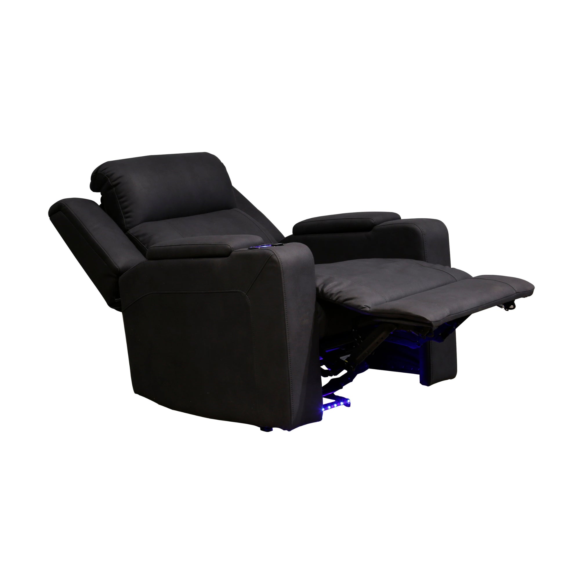 Experience next-level comfort and technology with this 1ER in Black Electric Recliner, designed to bring the cinema experience right into your living room. Upholstered in premium Rhino Suede fabric, this single recliner combines advanced functionality, luxurious comfort, and sleek aesthetics. Equipped with dual motors, the recliner allows independent adjustment of the headrest and footrest, offering personalized relaxation whether you're watching a movie, reading, or simply unwinding. The smart illuminated cupholder features convenient buttons to control recline functions, headrest position, lighting, and even includes a USB charging port for your devices. The blue base lighting adds a touch of ambient glow, creating an immersive theatre atmosphere at home. Built with a plywood structural frame and tempered steel mechanism, this recliner is durable, supportive, and made to last. Perfect for home theatres, living rooms, or media spaces, the 1ER ensures ultimate comfort with style.