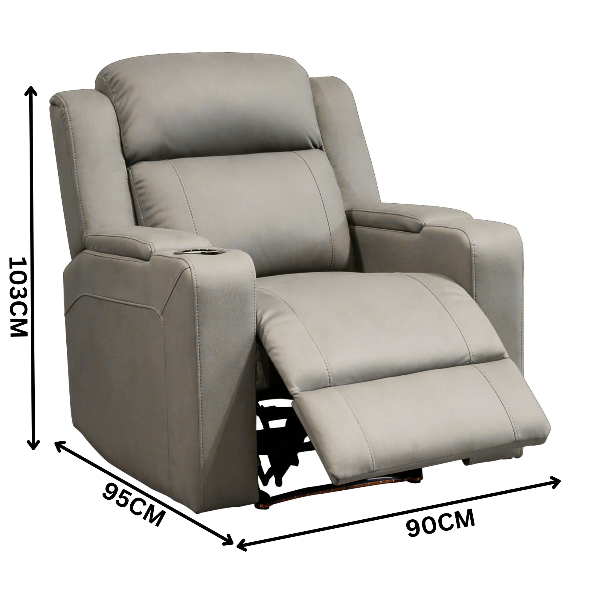 Experience next-level comfort and technology with this 1ER in Grey Electric Recliner, designed to bring the cinema experience right into your living room. Upholstered in premium Rhino Suede fabric, this single recliner combines advanced functionality, luxurious comfort, and sleek aesthetics. Equipped with dual motors, the recliner allows independent adjustment of the headrest and footrest, offering personalized relaxation whether you're watching a movie, reading, or simply unwinding. The smart illuminated cupholder features convenient buttons to control recline functions, headrest position, lighting, and even includes a USB charging port for your devices. The blue base lighting adds a touch of ambient glow, creating an immersive theatre atmosphere at home. Built with a plywood structural frame and tempered steel mechanism, this recliner is durable, supportive, and made to last. Perfect for home theatres, living rooms, or media spaces, the 1ER ensures ultimate comfort with style.