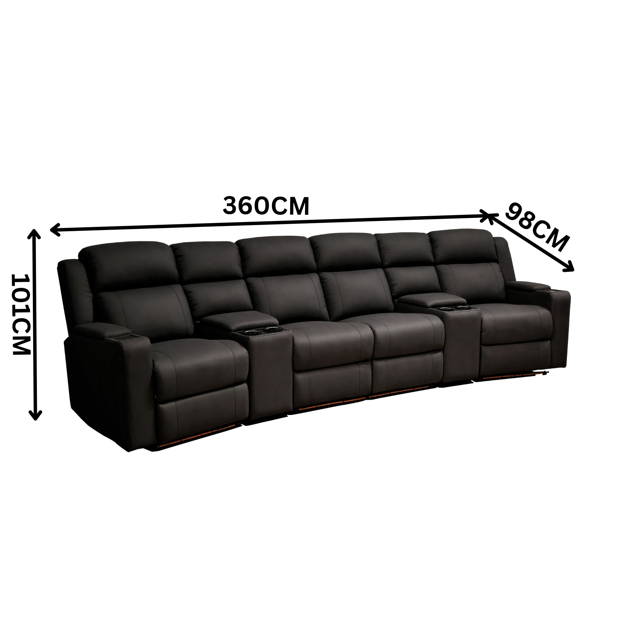 Transform your living room into the ultimate cinematic retreat with this Home Theatre (4ER + 2 Console) in Black Fabric. Designed for superior comfort and functionality, this luxurious theatre lounge includes two end electric recliners, two armless recliners, and two smart consoles, creating the perfect configuration for immersive entertainment. Upholstered in premium Rhino Suede fabric, the suite offers a smooth, soft-touch finish with long-lasting durability. The dual motor system allows independent control of the headrest and footrest, letting you find your ideal position for complete relaxation. The smart consoles feature touch lighting, hidden storage, USB charging ports, and illuminated cupholders with adjustable base lighting - combining modern technology with a theatre-like ambiance. Whether you're watching movies, gaming, or lounging in comfort, the Academy HT Lounge is crafted to elevate your home entertainment experience with its ergonomic support, ample storage, and sleek black design.