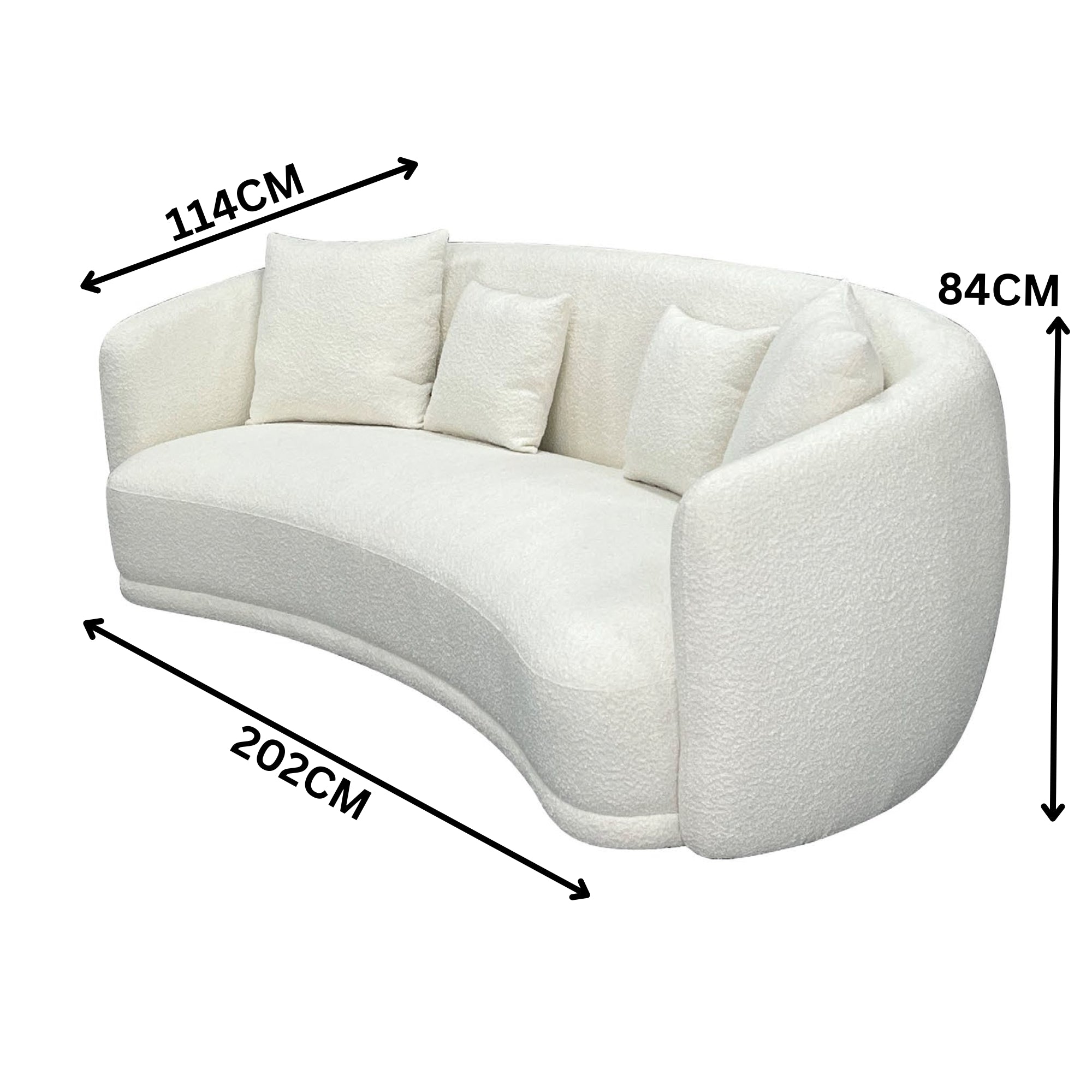 Bring home timeless style and comfort with this 2.5-Seater Sofa in White, a stunning blend of modern design and cozy luxury. Upholstered in soft, textured Boucle, fabric, this elegant sofa adds warmth and sophistication to any living space. Designed with contemporary curved edges and plush cushioning, it creates a welcoming retreat for relaxing, reading, or entertaining. The four matching scatter cushions enhance both comfort and visual appeal, while the rubberwood legs provide natural charm and sturdy support. Built with a strong plywood and LVL frame, this sofa ensures durability and stability for everyday use. The combination of S-spring, foam, and webbing support offers exceptional comfort and shape retention. With its on-trend white Boucle finish, this piece complements any decor style - from modern minimalism to cozy contemporary. Assembly is simple, requiring only the attachment of legs, making setup quick and effortless.