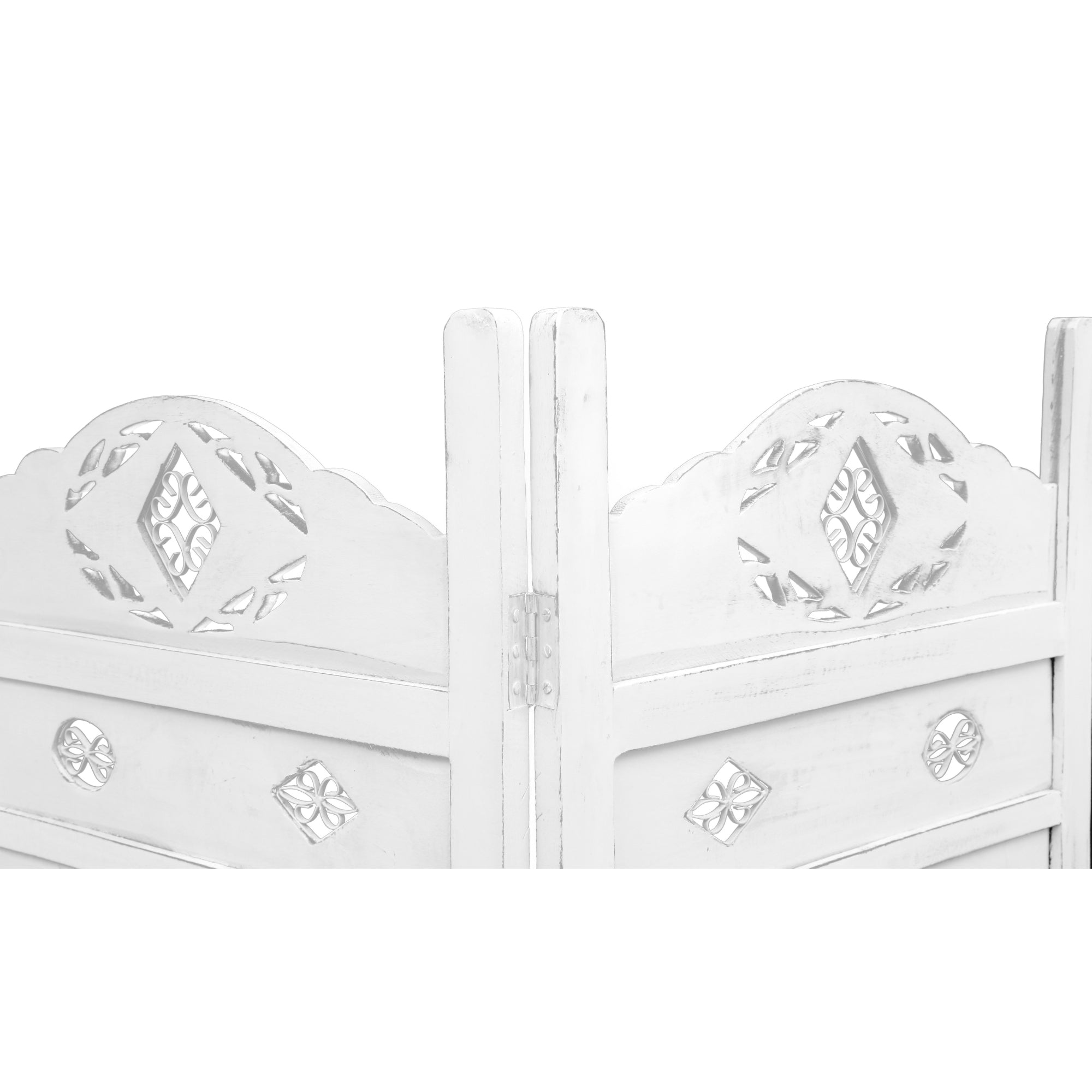 Effectively use the available space in your home with this room divider. The timber screen creates a private space in a room while also adding to its aesthetic appeal. The white colour screen is designed in an exotic pattern using sustainably harvested solid mango wood. This particular wood is well-known for its high water resistance, long durability, and beautiful texture. The traditional style timber screen with strong legs can extend up to 2 metres and serves as both a space-saving and a space-dividing furniture piece. The artistic work on the screen, which includes engraved iron Jali work at regular intervals, gives it a dazzling appearance, filling the entire area with positivity. The screen is divided into 4 panels that are easily foldable. Lightweight yet strong, the room divider uses high-performance metal hinges that can withstand daily use. This fully assembled timber screen comes with a one-year warranty.