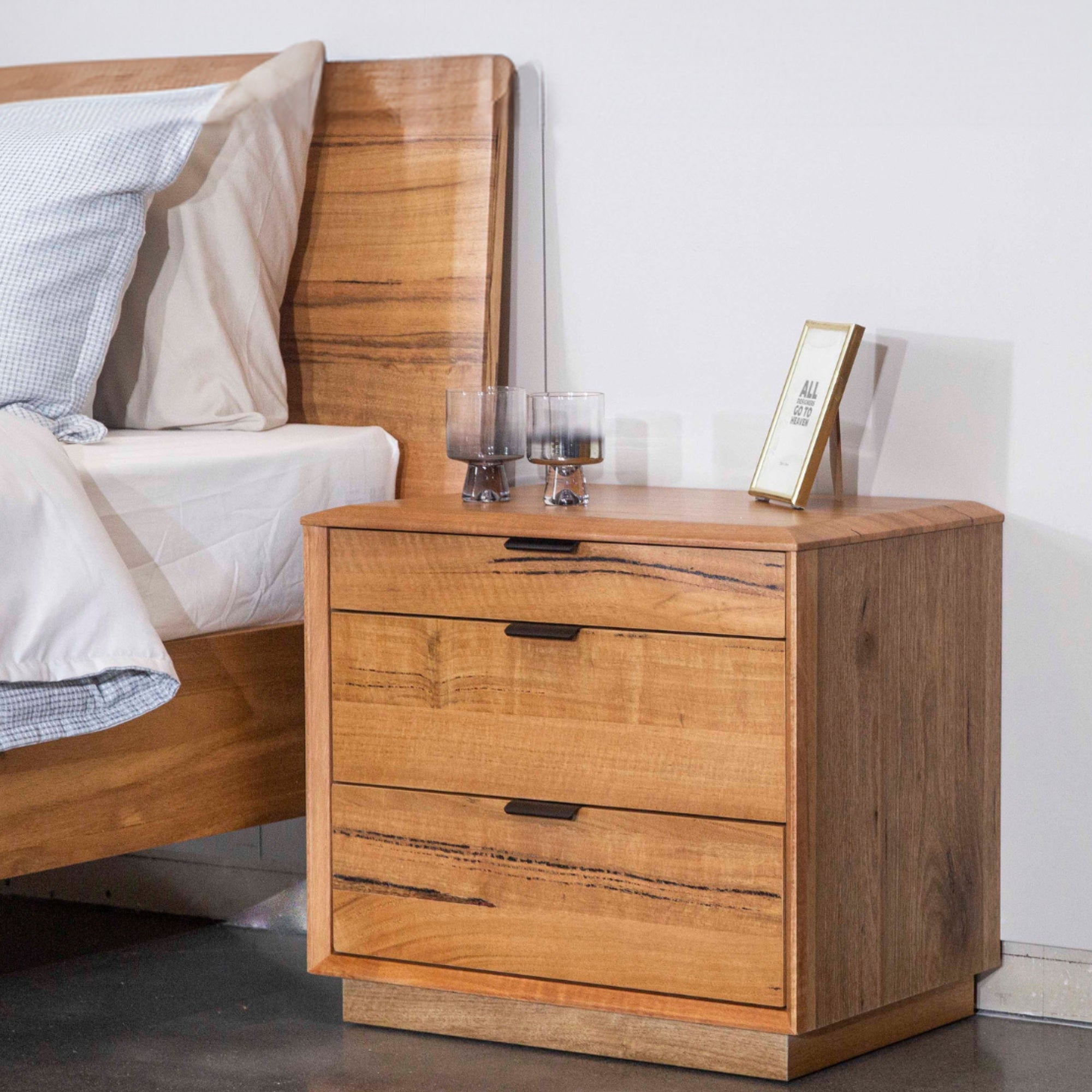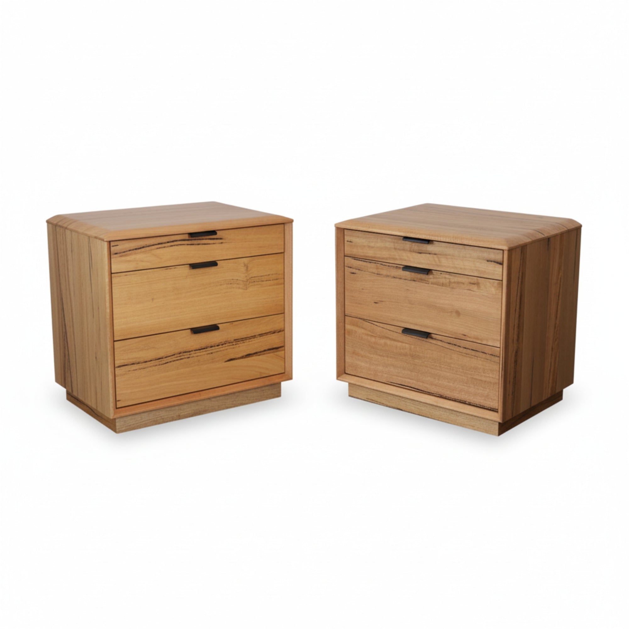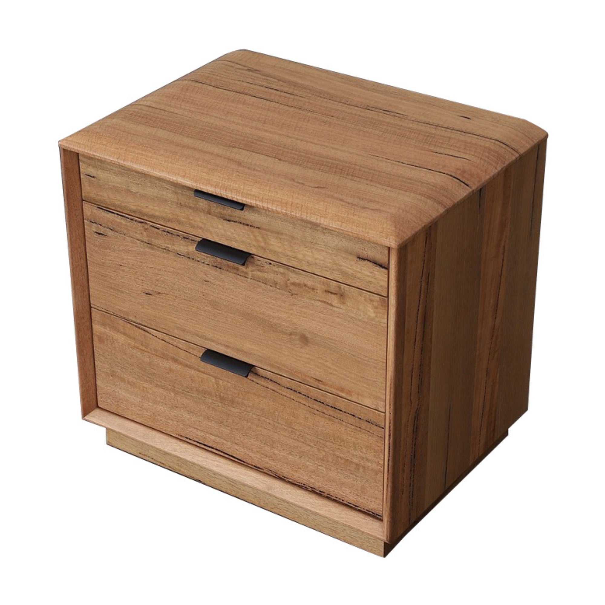 Designed in a traditional style, this 2pc set of 3-drawer bedside tables gives an elegant look to your bedroom. The drawers have black felt lining, metal handles and full extension metal runners. Their structural frame is made of sustainably harvested solid and veneer marri timber. Black metal handles make them look stunning. Standing strongly on solid wood base, the fully assembled furniture in natural colour goes well with a variety of interior decor styles, and they come with a one-year warranty. The bedside has dimensions of W58 x D40 x H52 CM.