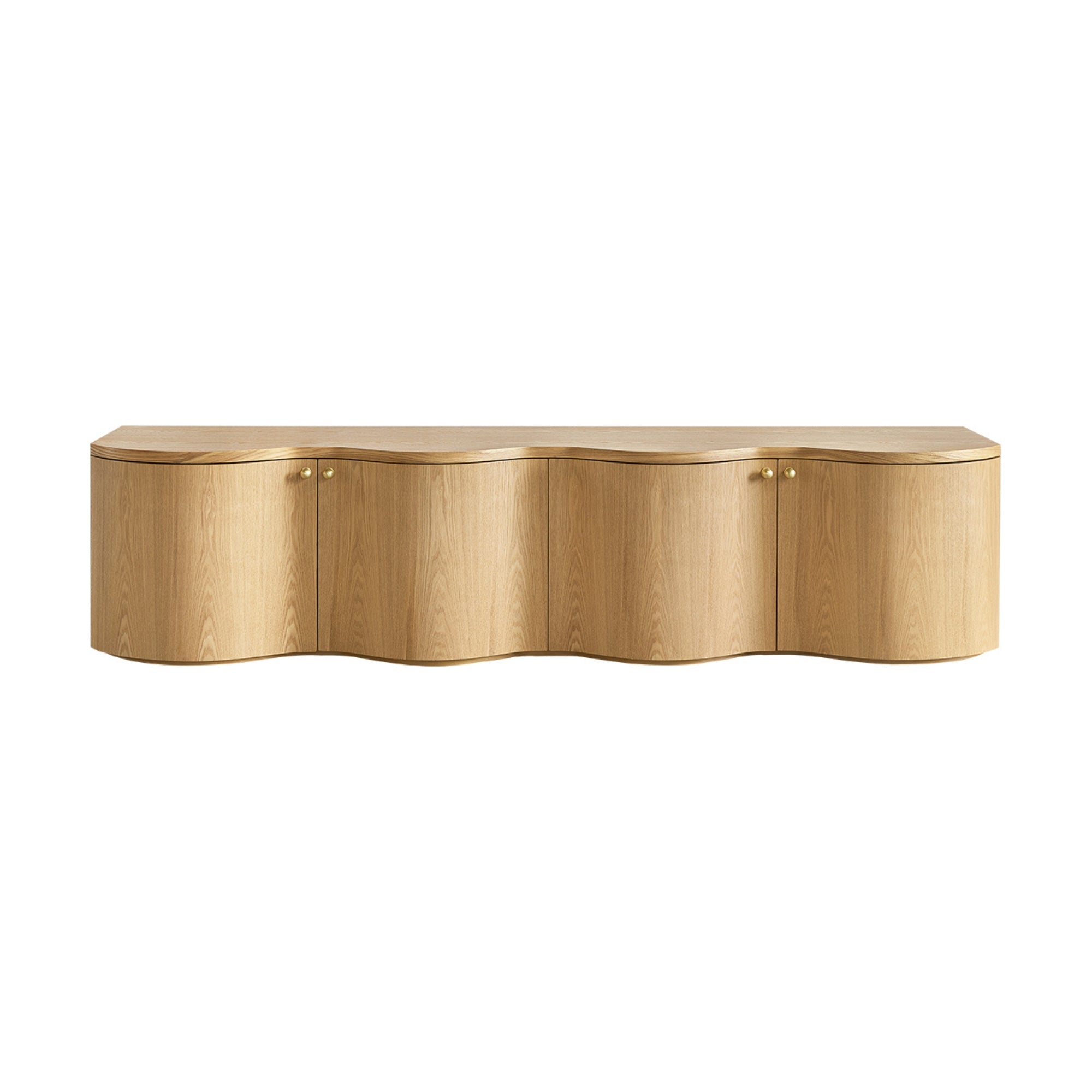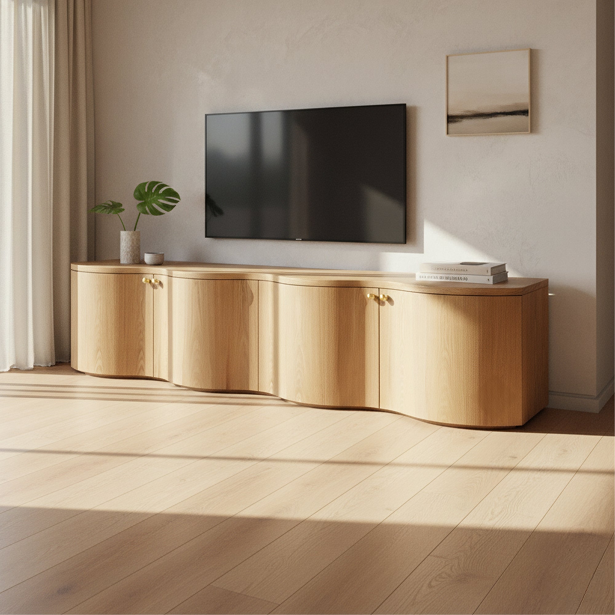 Enhance your living space with this 4-Door Entertainment Unit, designed for both style and function. Featuring a wave-inspired curved design and a natural veneer finish, this unit blends modern elegance with natural wood aesthetics. The brass cabinet handles add a touch of luxury, while the four spacious cabinets offer ample storage for all your media essentials. Crafted from MDF wood, this ETU ensures durability and long-lasting appeal.