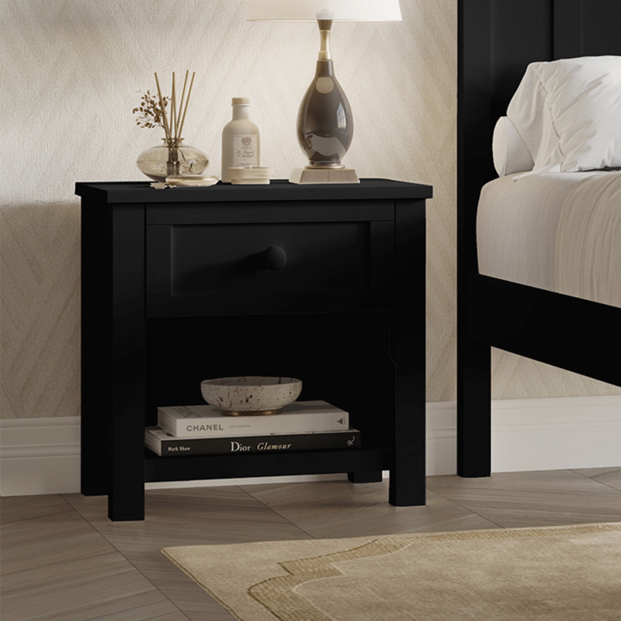 Designed in a coastal style, this 1-drawer, 1 shelf bedside table gives an elegant look to your bedroom. The drawer has solid timber button handle and full extension metal runners. Its structural frame is made of sustainably harvested rubberwood and MDF. Standing strongly on solid wood legs, the fully assembled furniture in black goes well with a variety of interior decor styles, and it comes with a one-year warranty. It has dimensions of W40 x D53 x H54 CM.
