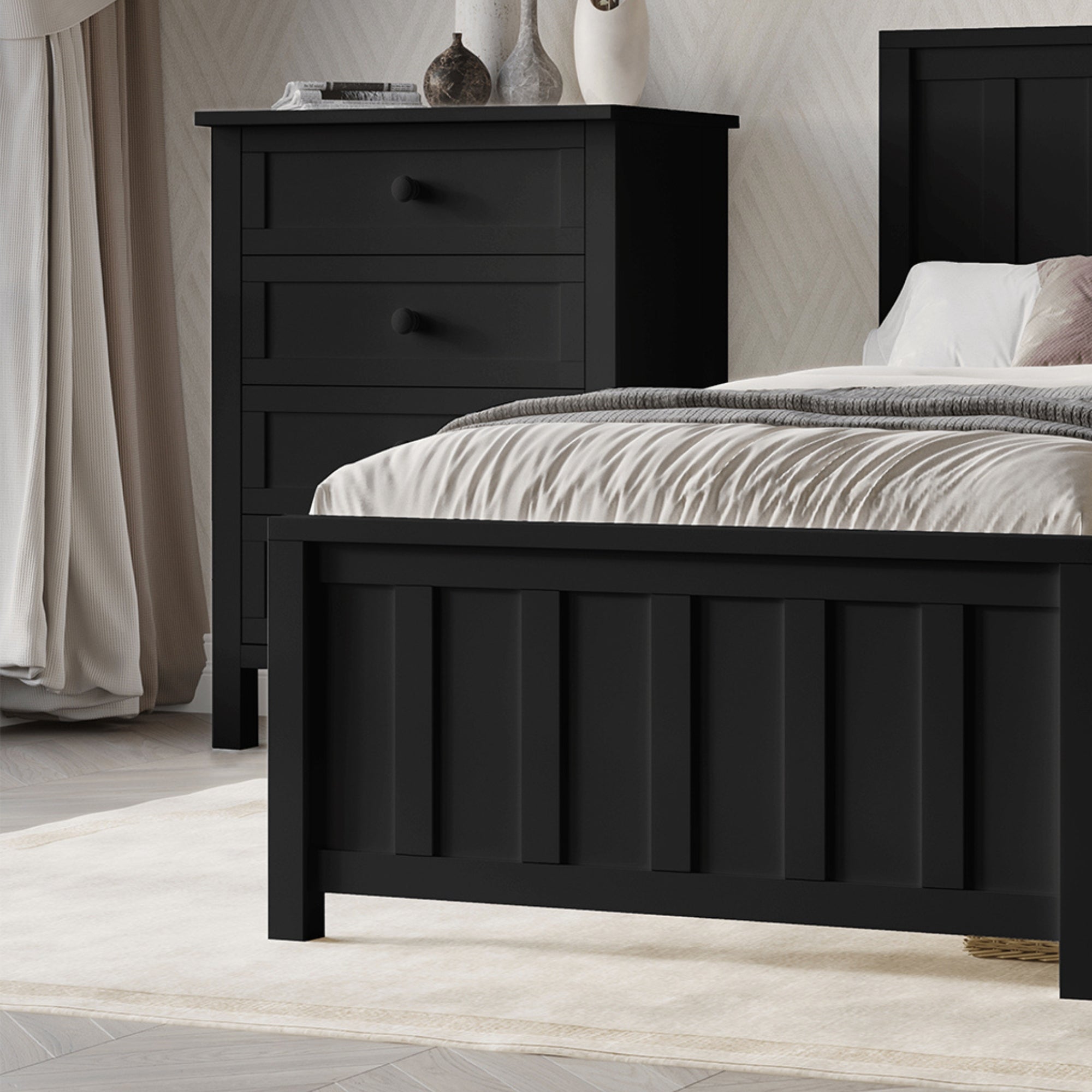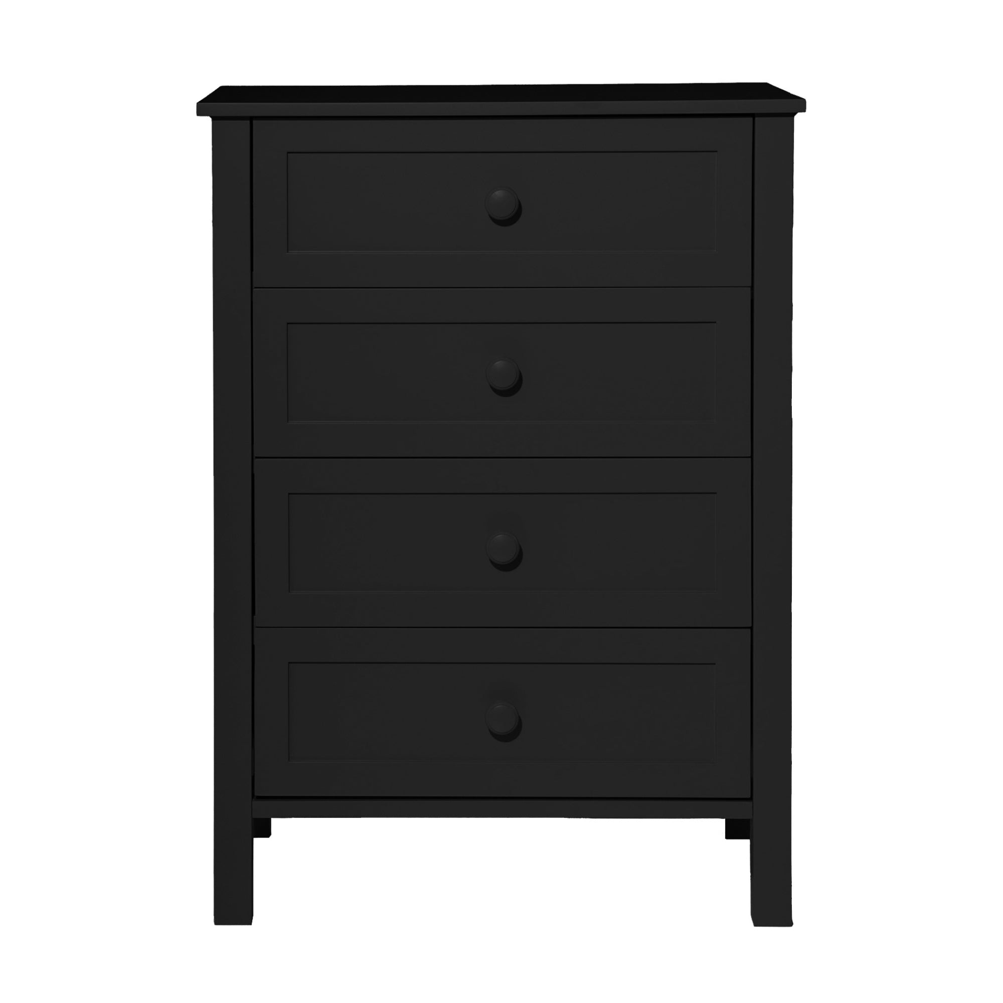 Designed in a coastal style, this 4-drawer tallboy gives an elegant look to your bedroom. The drawers have solid timber button handles and full extension metal runners. Its structural frame is made of sustainably harvested rubberwood and MDF. Standing strongly on solid wood legs, the fully assembled furniture in black goes well with a variety of interior decor styles, and it comes with a one-year warranty. It has dimensions of W71 x D45 x H98 CM.