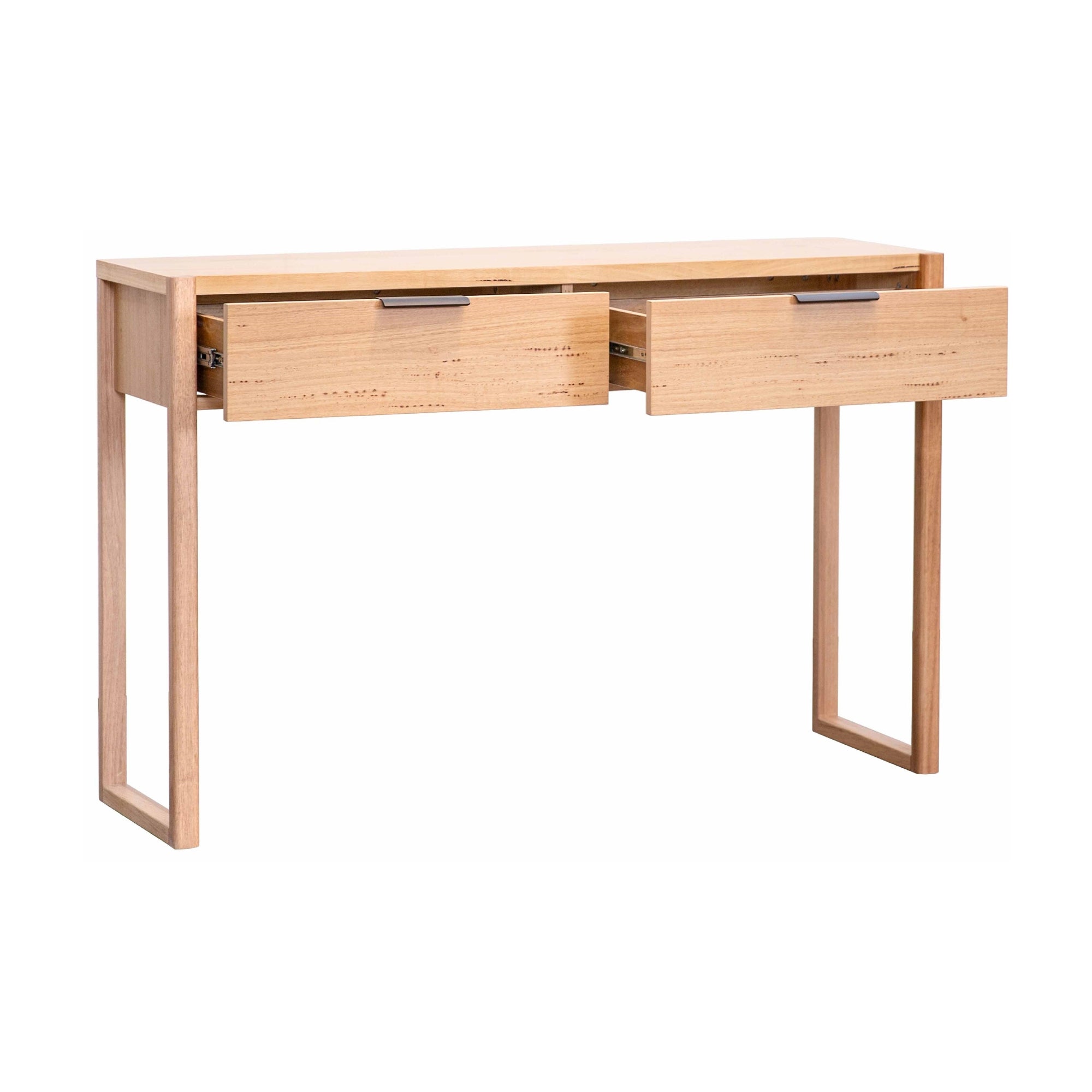 Elevate your hallway, living room, or dining area with the timeless beauty of this 2 Drawer 140cm Console Table in Natural Colour. Expertly crafted from solid and veneer Messmate timber, this piece showcases the wood's distinctive natural grain and warm tone, making each table uniquely elegant. Designed for both form and function, the console features two spacious drawers for discreet storage of everyday essentials, while the broad tabletop provides ample space for decorative items, plants, or lamps. The solid timber legs in a classic closed design ensure lasting strength and stability, perfectly balancing rustic charm with modern craftsmanship. Each drawer glides smoothly on full-extension metal runners, and the sleek black metal handles add a touch of sophistication to the natural timber finish. Whether placed in an entryway, behind a sofa, or as a statement piece in your dining room, this console table adds practical storage and enduring style to any home.