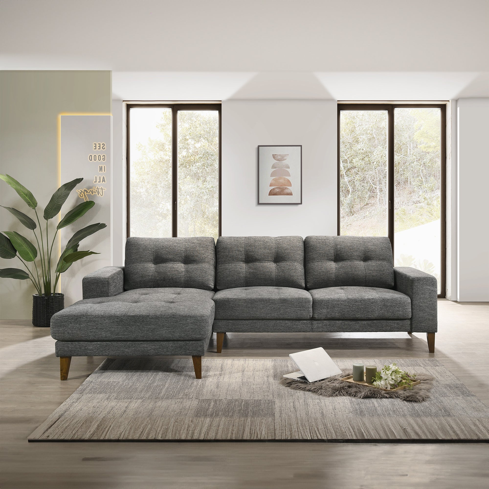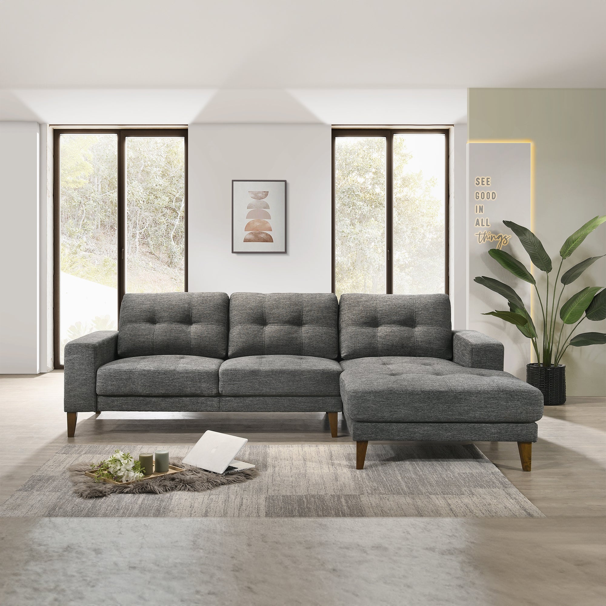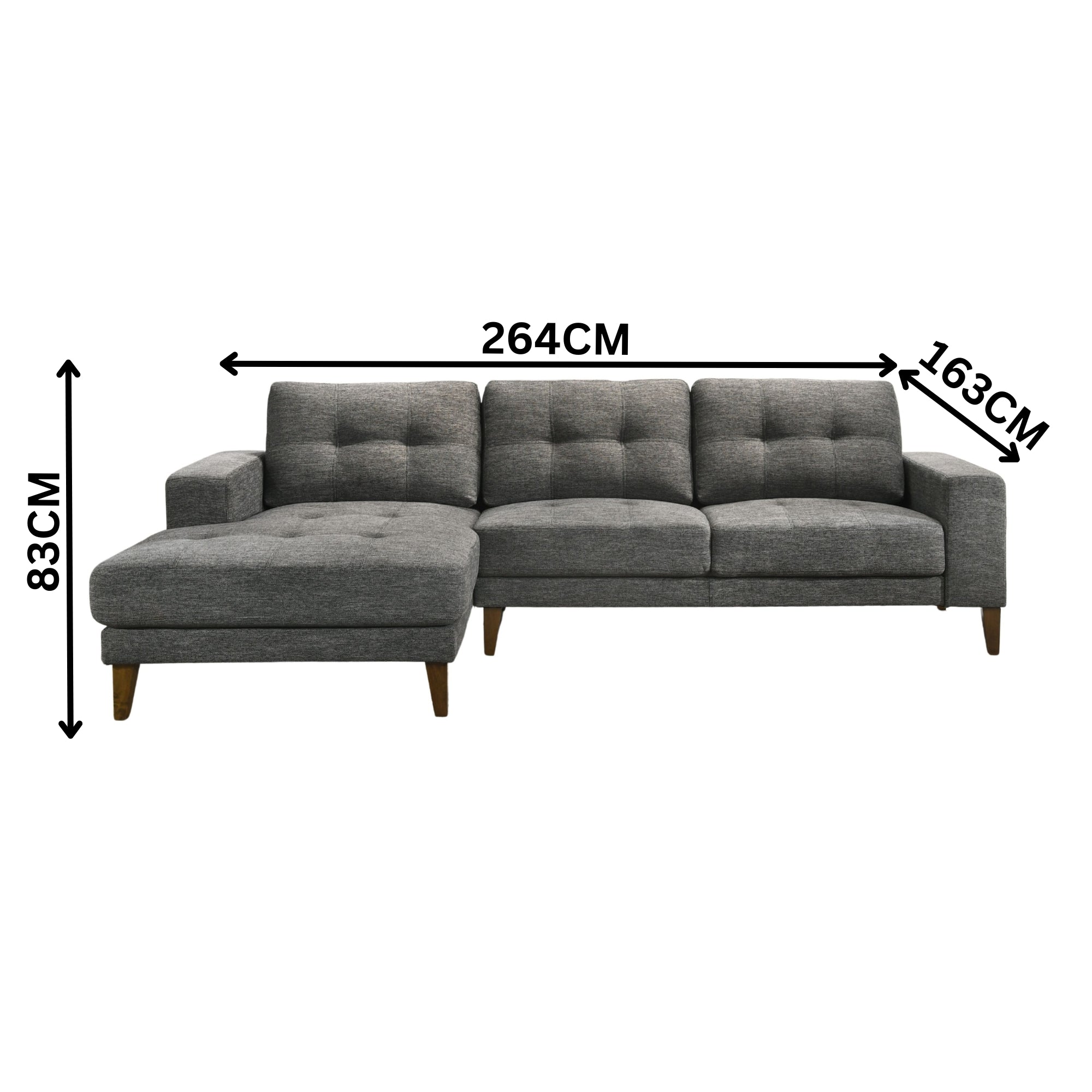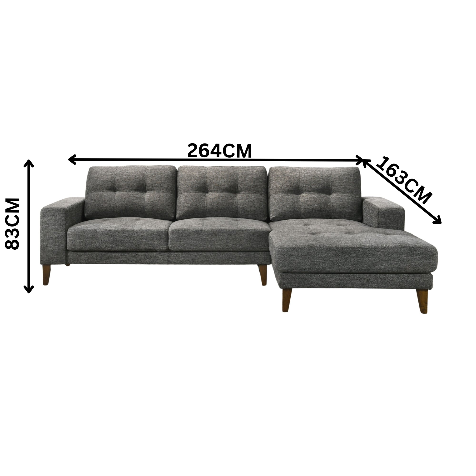 This good-looking and enormously comfy 2-seater sofa with a Right / Left Hand Chaise fills your space with cosiness. Designed in a Mid-Century style, the sofa has fine tufting details and a square frame for a modern touch. Fully upholstered in top-quality, 100% polyester fabric in Grey / Licorice Grey colour, the sofa looks gorgeous amid any interior decor theme. Its structural frame is made of sustainably harvested LVL and MDF, with a seating support that consists of dense foam and zig-zag springs. Rubberwood legs in walnut colour give a beautiful look to the sofa. Due to the high-performance material, the easy-to-assemble sofa becomes strong and durable. The frame has a five-year warranty; the foam and springs have a three-year warranty; the fabric and stitching have a one-year warranty; and all other parts have a one-year warranty. The sofa is just perfect for living areas, game rooms, family rooms, children's rooms, guest rooms, entertainment rooms, home theatre areas, and offices.
