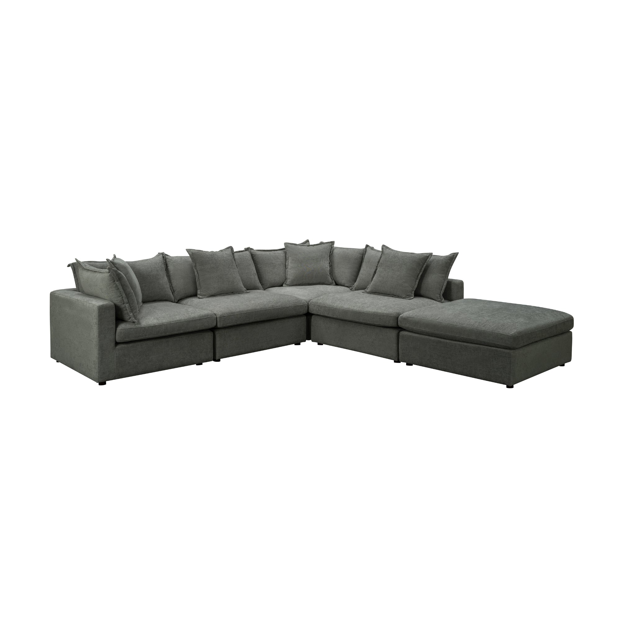 Bring comfort, versatility, and modern elegance to your living room with this Modular Lounge with Ottoman in Pewter colour. Designed for spacious relaxation, this modular suite includes 2 corner units, 2 armless chairs, and 1 ottoman, offering multiple configurations to perfectly fit your lifestyle and home layout. Upholstered in a luxurious soft-touch fabric blend of polyester, viscose, and linen, this lounge delivers a beautiful texture and refined finish. The deep, ultra-comfortable seating and loose flange-edged cushions enhance both style and coziness, making it an inviting centerpiece for any modern living space. Built on a durable pine and plywood frame with a premium support system of webbing, springs, foam, and feather filling, this modular set provides lasting comfort and stability. Whether you're entertaining guests, lounging with family, or stretching out on the ottoman, it's a blend of luxury, flexibility, and modern charm.