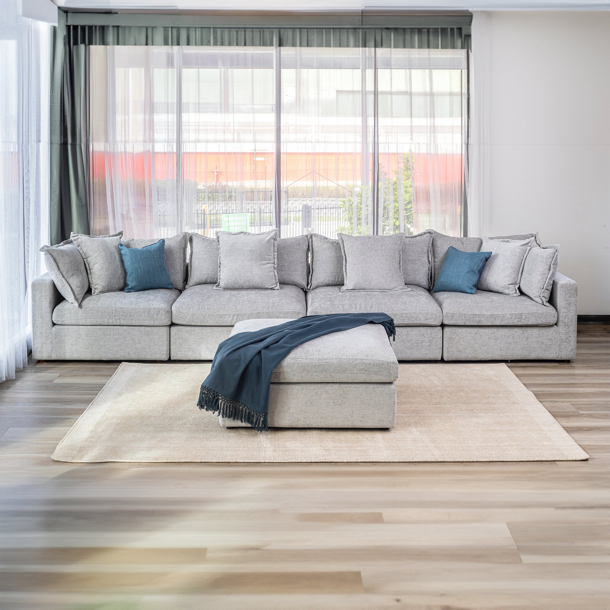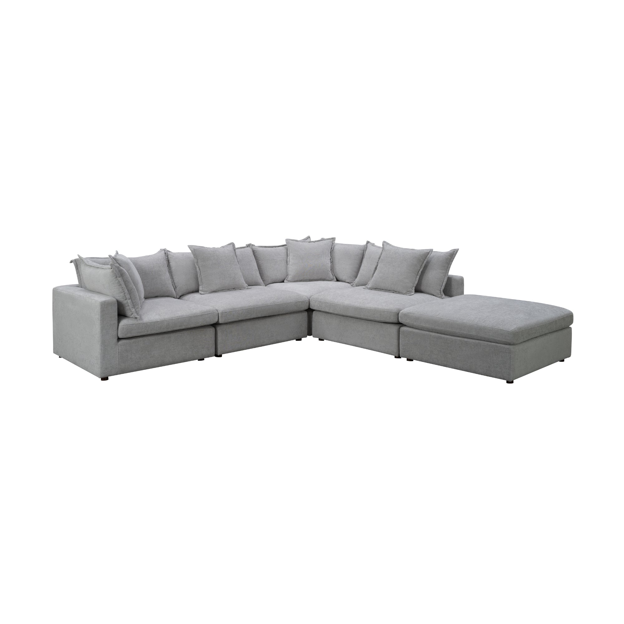 Bring comfort, versatility, and modern elegance to your living room with this Modular Lounge with Ottoman in Silver colour. Designed for spacious relaxation, this modular suite includes 2 corner units, 2 armless chairs, and 1 ottoman, offering multiple configurations to perfectly fit your lifestyle and home layout. Upholstered in a luxurious soft-touch fabric blend of polyester, viscose, and linen, this lounge delivers a beautiful texture and refined finish. The deep, ultra-comfortable seating and loose flange-edged cushions enhance both style and coziness, making it an inviting centerpiece for any modern living space. Built on a durable pine and plywood frame with a premium support system of webbing, springs, foam, and feather filling, this modular set provides lasting comfort and stability. Whether you're entertaining guests, lounging with family, or stretching out on the ottoman, it's a blend of luxury, flexibility, and modern charm.