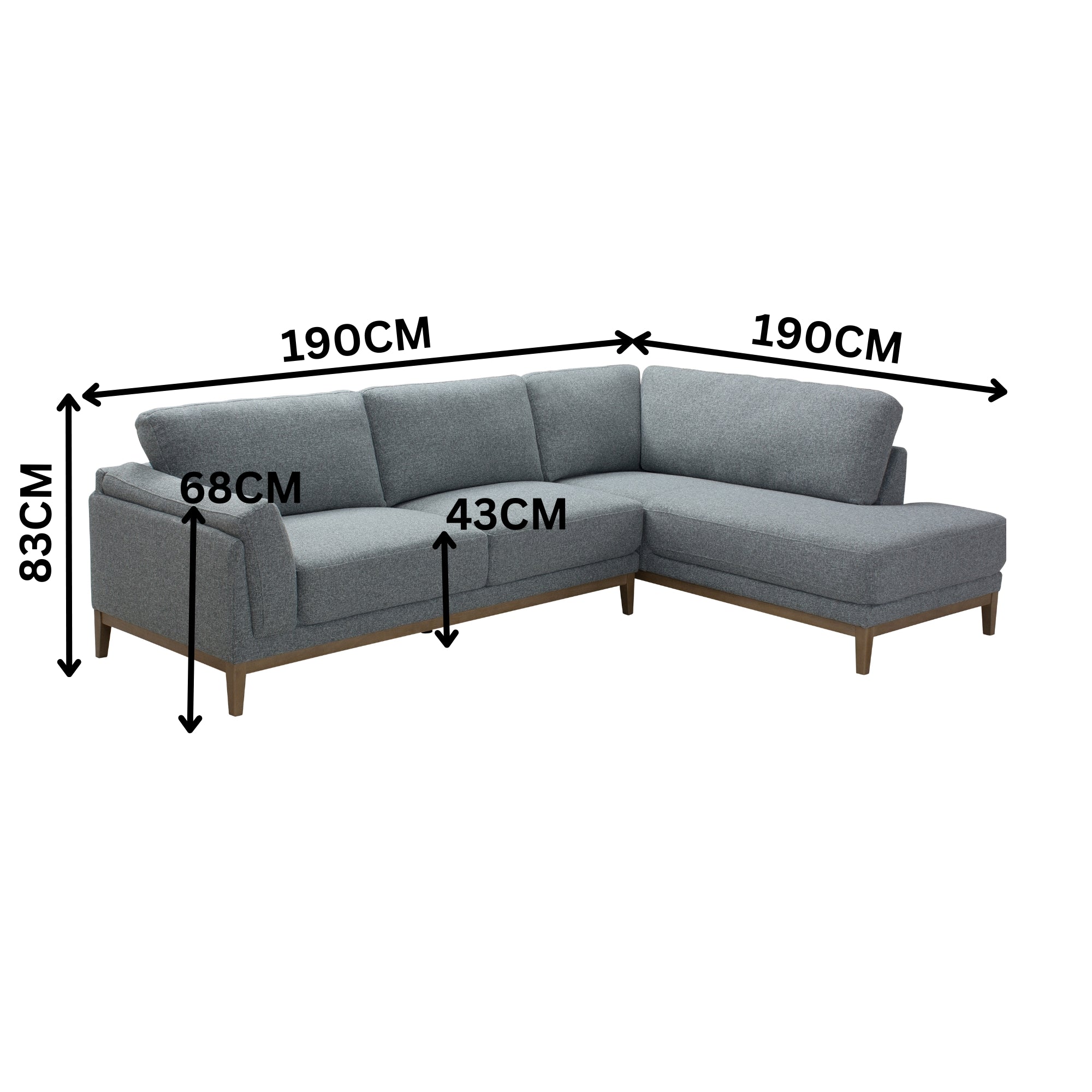 3 Seater with RHF Chaise: W190 x D190/88 x H83 (SH43/AH68) CM