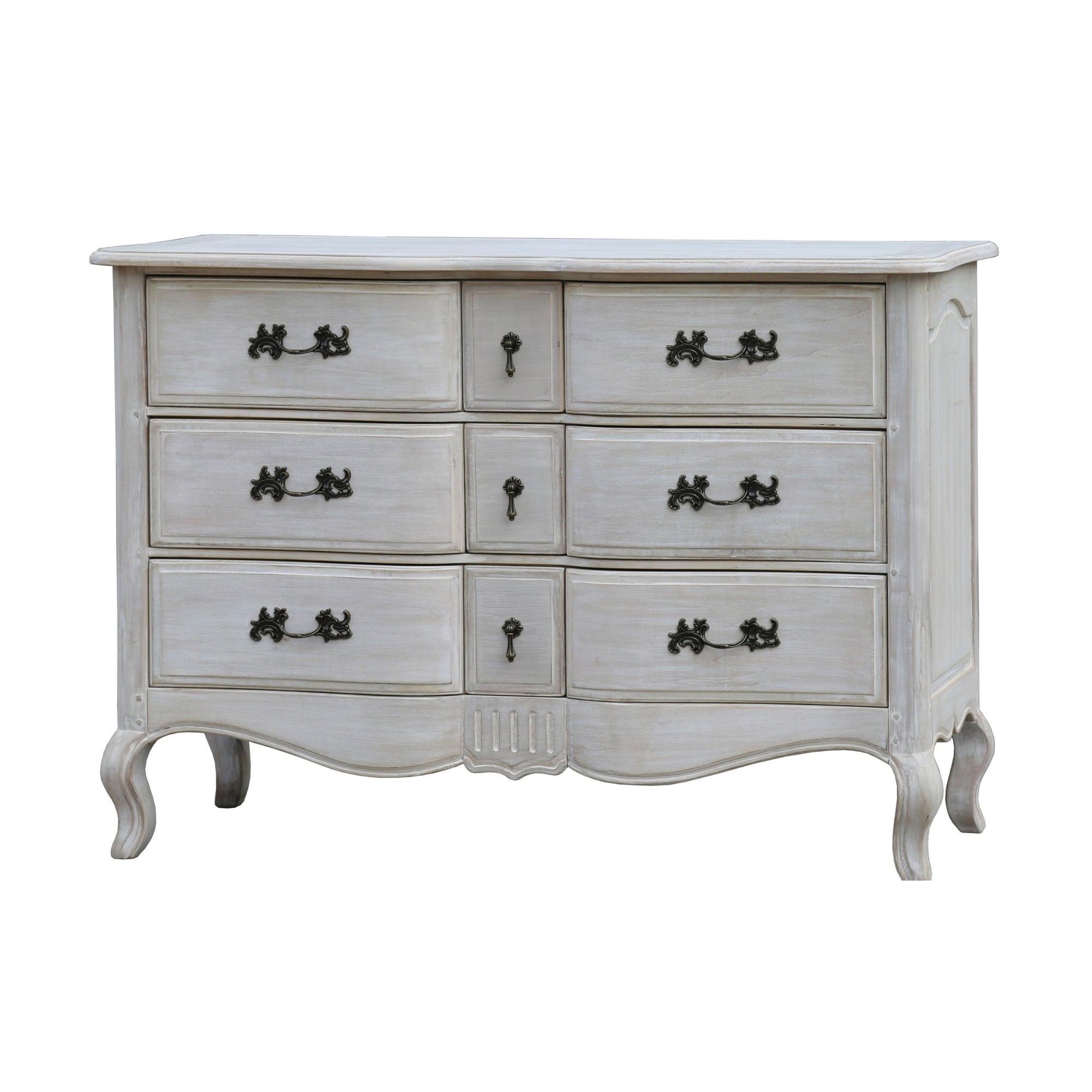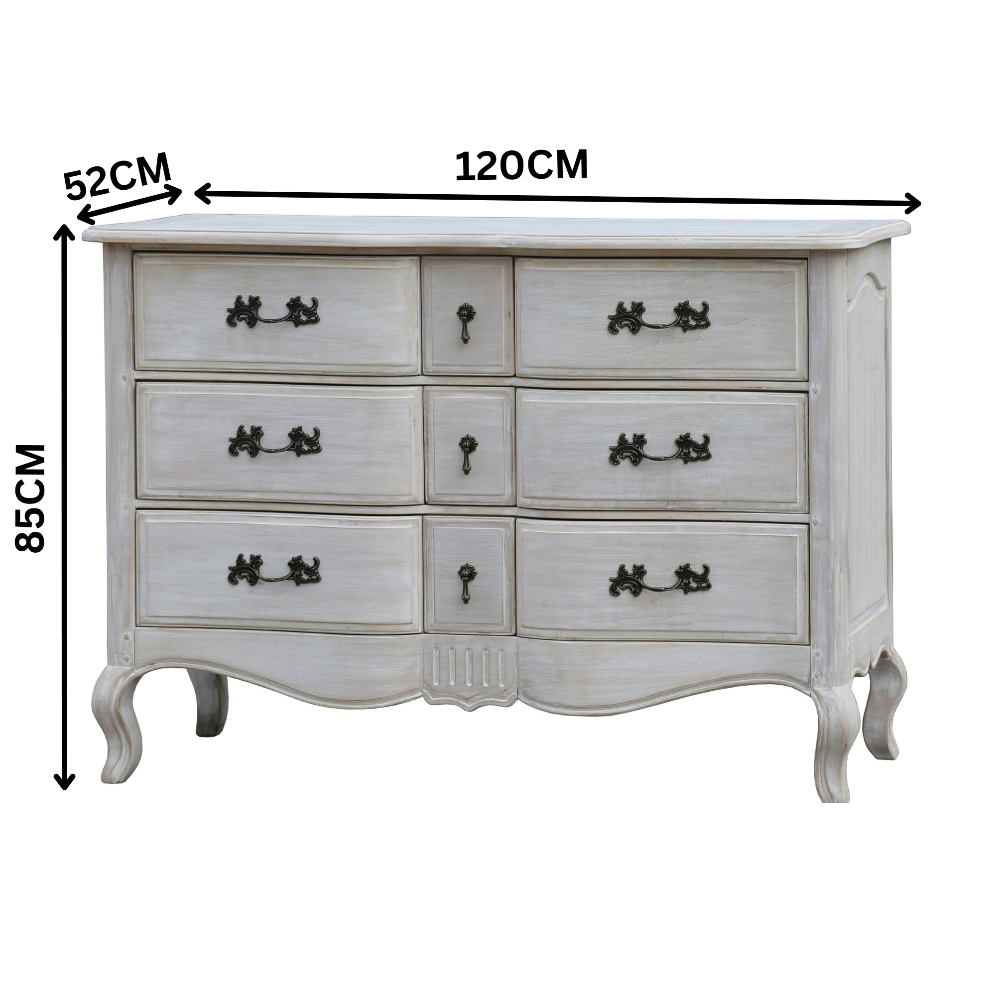 Add timeless sophistication to your bedroom with this 6 Drawer Dresser in Grey Wash Colour, a perfect blend of classic European design and practical storage. Crafted with meticulous attention to detail, this dresser features graceful cabriole legs and elegant contours that bring a refined touch to any interior setting. Constructed from solid birchwood and durable plywood, the dresser offers both lasting stability and aesthetic charm. The grey wash finish enhances the natural wood grain, giving it a soft, vintage appeal that complements both traditional and contemporary decors. With six spacious drawers, it provides ample storage for clothing, linens, or accessories, keeping your space organised and clutter-free. The Dresser 6 Drawers in Grey Wash is more than just furniture - it's a statement of style and craftsmanship, designed to elevate the beauty and functionality of your home for years to come.