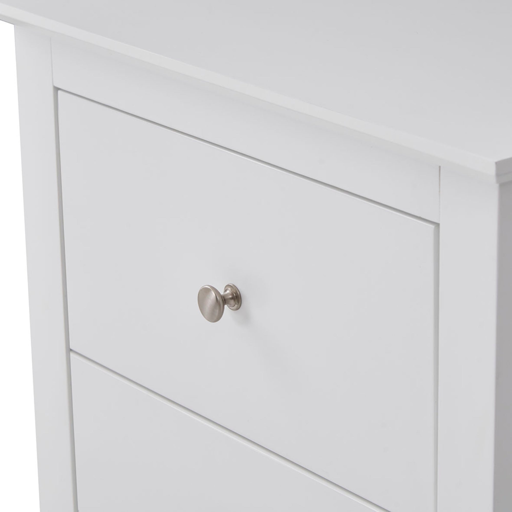 This 2-drawer bedside table designed in a coastal style adds timeless beauty to your bedroom. The drawers have side mounted full extension metal runners and round metal handles in complementary silver finish. Standing on strong, tapered legs, the beautiful furniture is made of sustainably harvested solid rubberwood and MDF. The wood is known for its durability, shock-resistance, and ease of maintenance. The fully assembled furniture in a white painted finish matches with a variety of interior decor styles and themes. A one-year warranty is included with the bedside, and it comes with dimensions of W53 x D38 x H54 CM.
