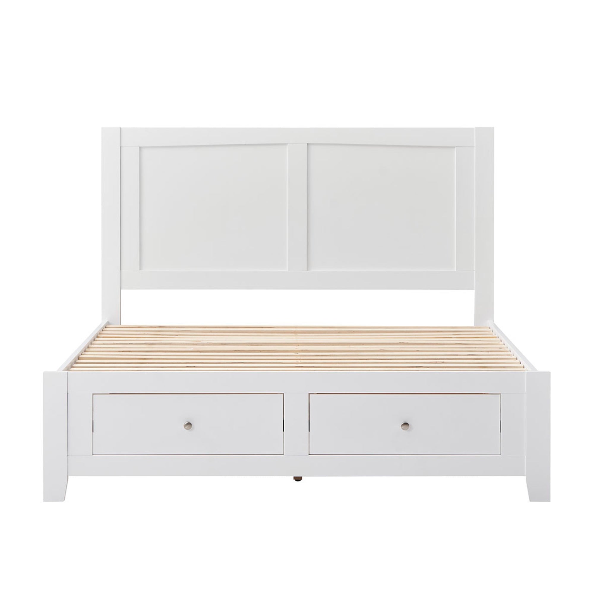 This double bed designed in a coastal style adds timeless beauty to your bedroom. The bed has a beautiful tall headboard and a slim-design footboard with 2 spacious drawers in it offering ample storage space. The drawers have side mounted full extension metal runners and round metal handles in complementary silver finish. A solid timber slat system with central support legs gives it extra strength. Standing on strong, tapered legs, the beautiful furniture is made of sustainably harvested solid rubberwood and MDF. The wood is known for its durability, shock-resistance, and ease of maintenance. The easy-to-assemble bed in a white painted finish matches with a variety of interior decor styles and themes. A one-year warranty is included with the bed and it comes with dimensions of W142 x D196 x H105 CM.