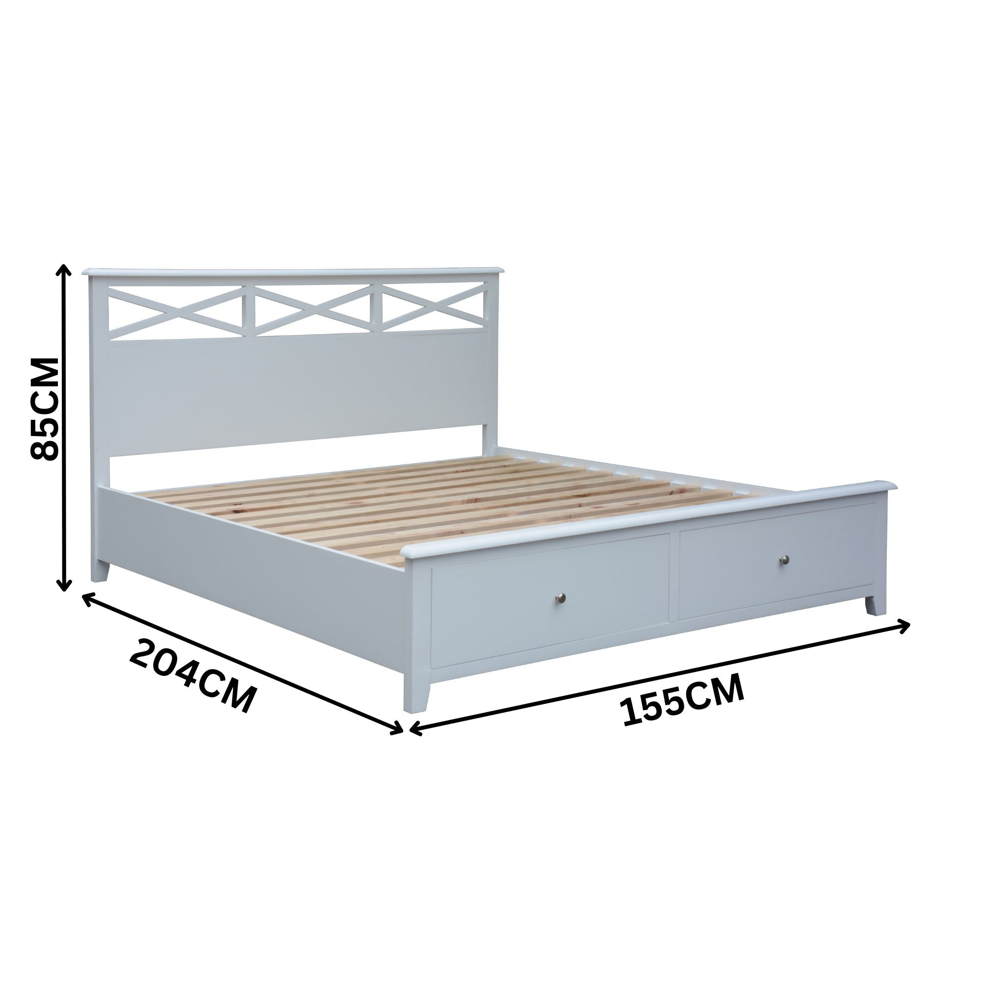 Add timeless coastal charm and practical storage to your bedroom with this 2 Drawer Double Storage Bed in White Colour. Inspired by the classic Hamptons design, this bed combines elegance, durability, and everyday functionality. Constructed from solid acacia wood and MDF, the frame showcases a smooth white painted finish that enhances the light, airy aesthetic - perfect for modern and coastal interiors alike. Designed for convenience, the bed features two spacious drawers built with full-extension metal runners for smooth operation and black felt-lined interiors to keep your belongings protected. The drawers are elegantly complemented by round silver metal handles, adding a touch of refined sophistication. Beyond its style, this bed offers sturdy construction, providing lasting comfort and strength for everyday use. Whether you're refreshing your bedroom or creating a serene coastal retreat, the 2 Drawer Double Storage Bed effortlessly balances classic design and functional storage, making it the perfect centrepiece for your home.