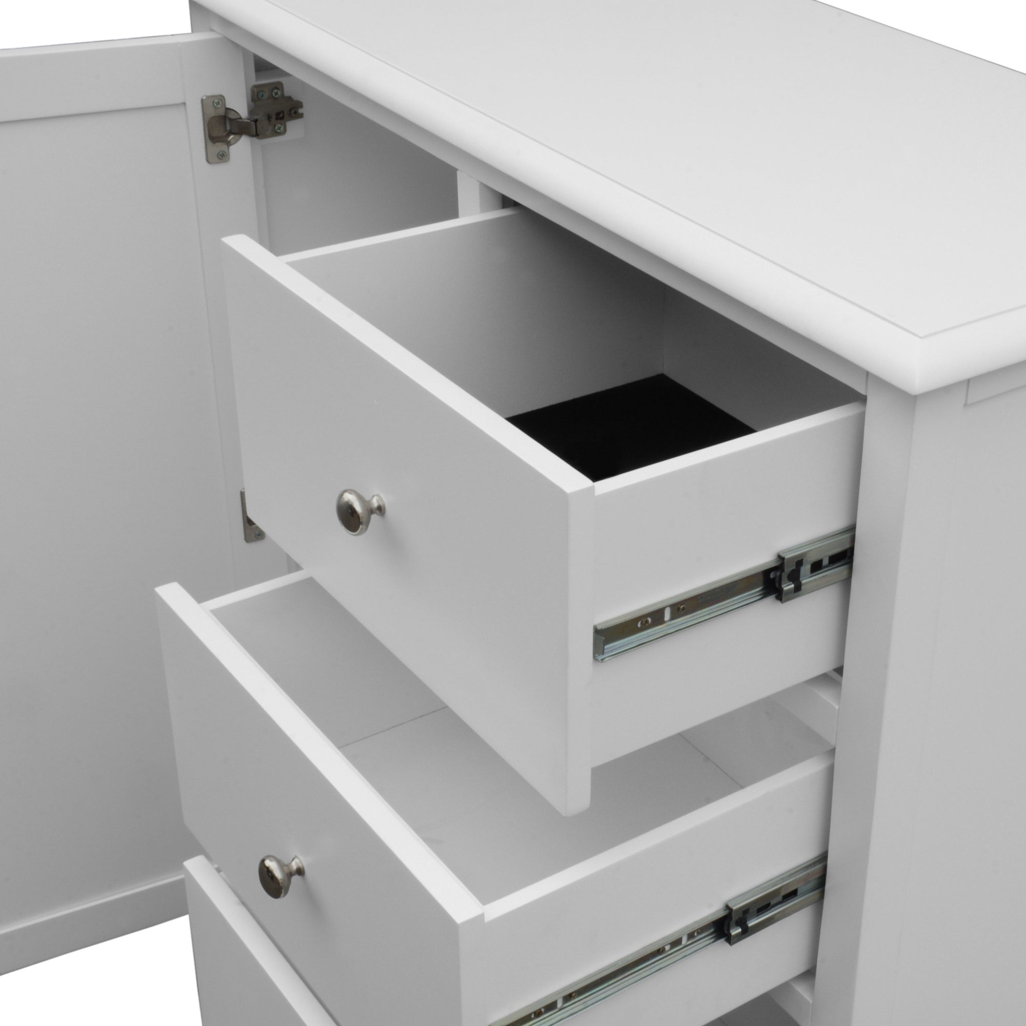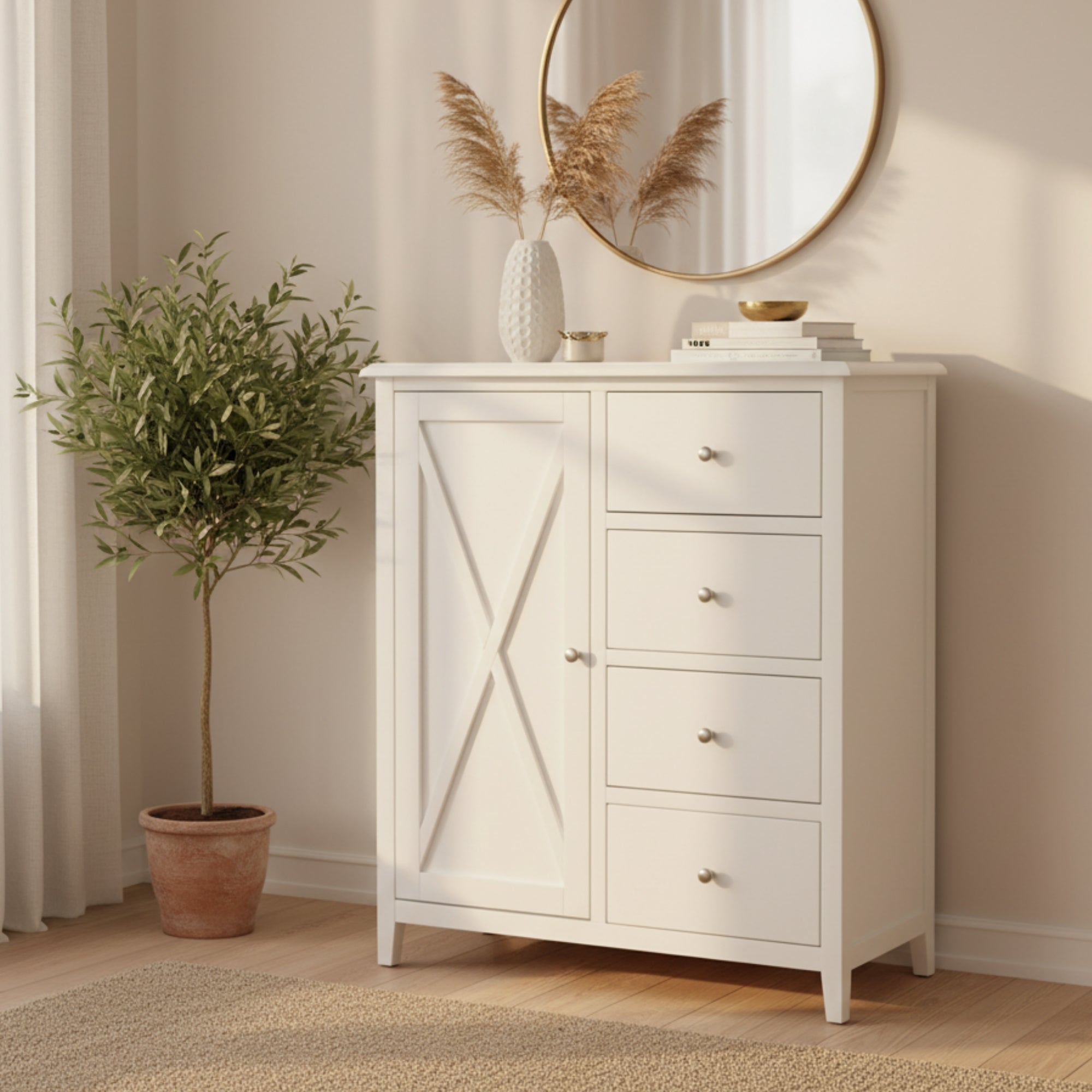 Elevate your bedroom with the timeless elegance from this 4 drawer and 1 timber door tallboy in white colour. Designed with a Hamptons-inspired aesthetic, this tallboy offers the perfect blend of charm and practicality. Crafted from Acacia and MDF timber in a crisp white painted finish, it features four spacious drawers with full-extension metal runners and black felt lining, ensuring smooth operation and a premium touch. A matching timber door with X-pattern detail adds style while concealing additional storage. Completed with round silver metal handles and tempered legs for stability, this tallboy arrives fully assembled, making it a hassle-free addition to your home.