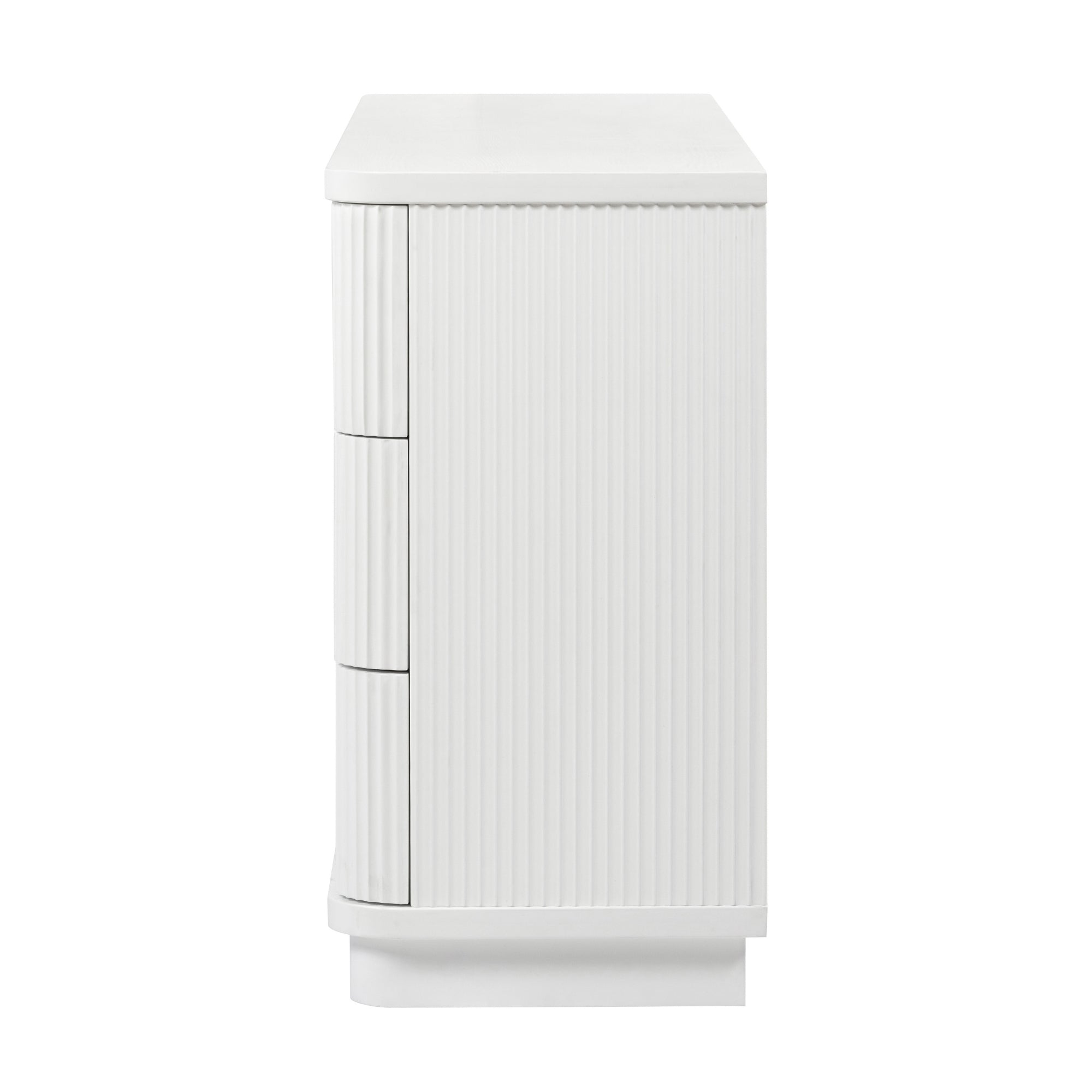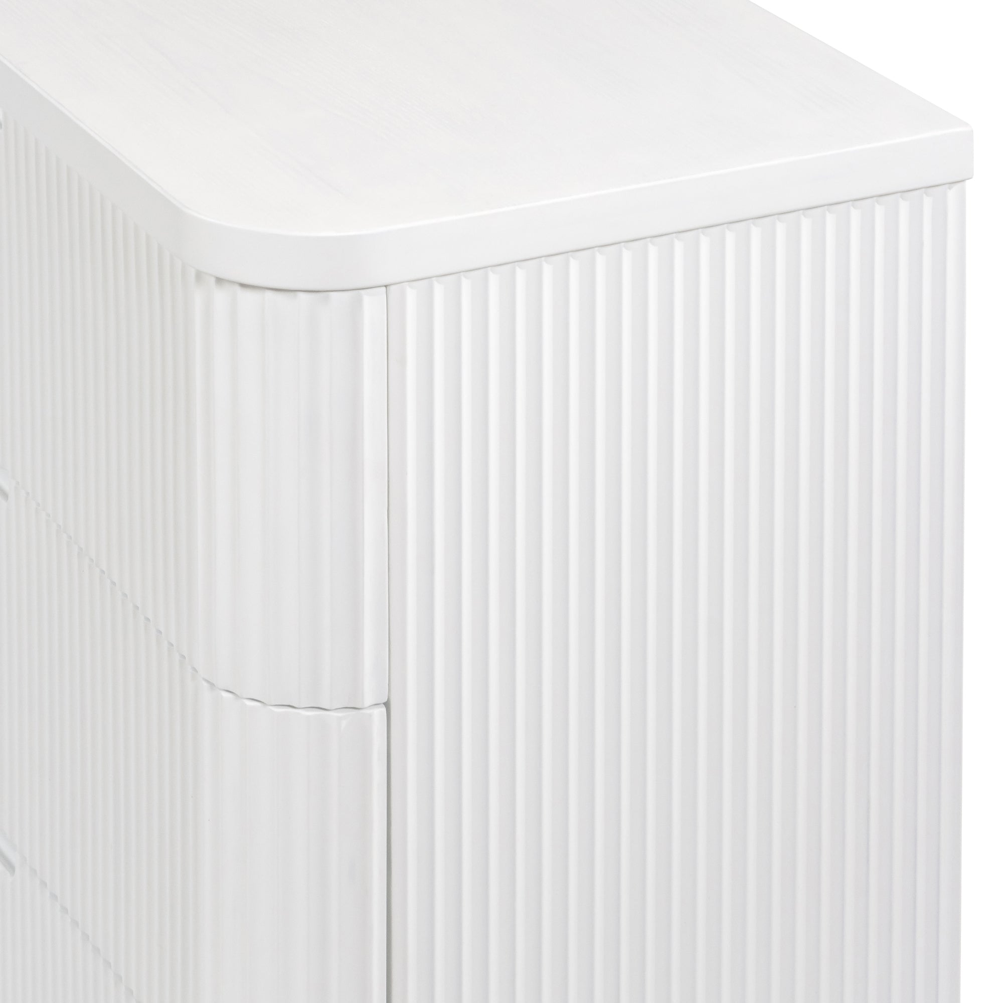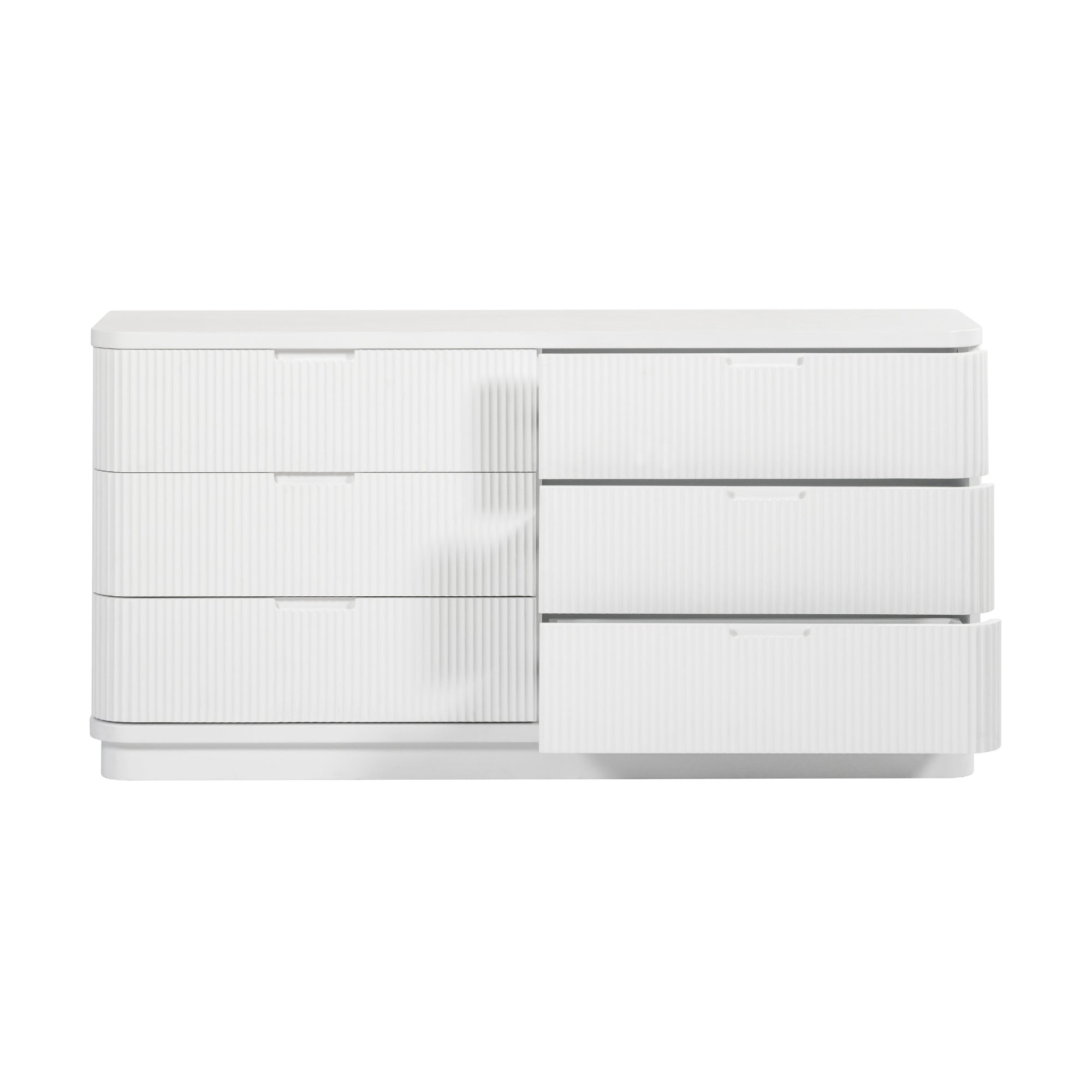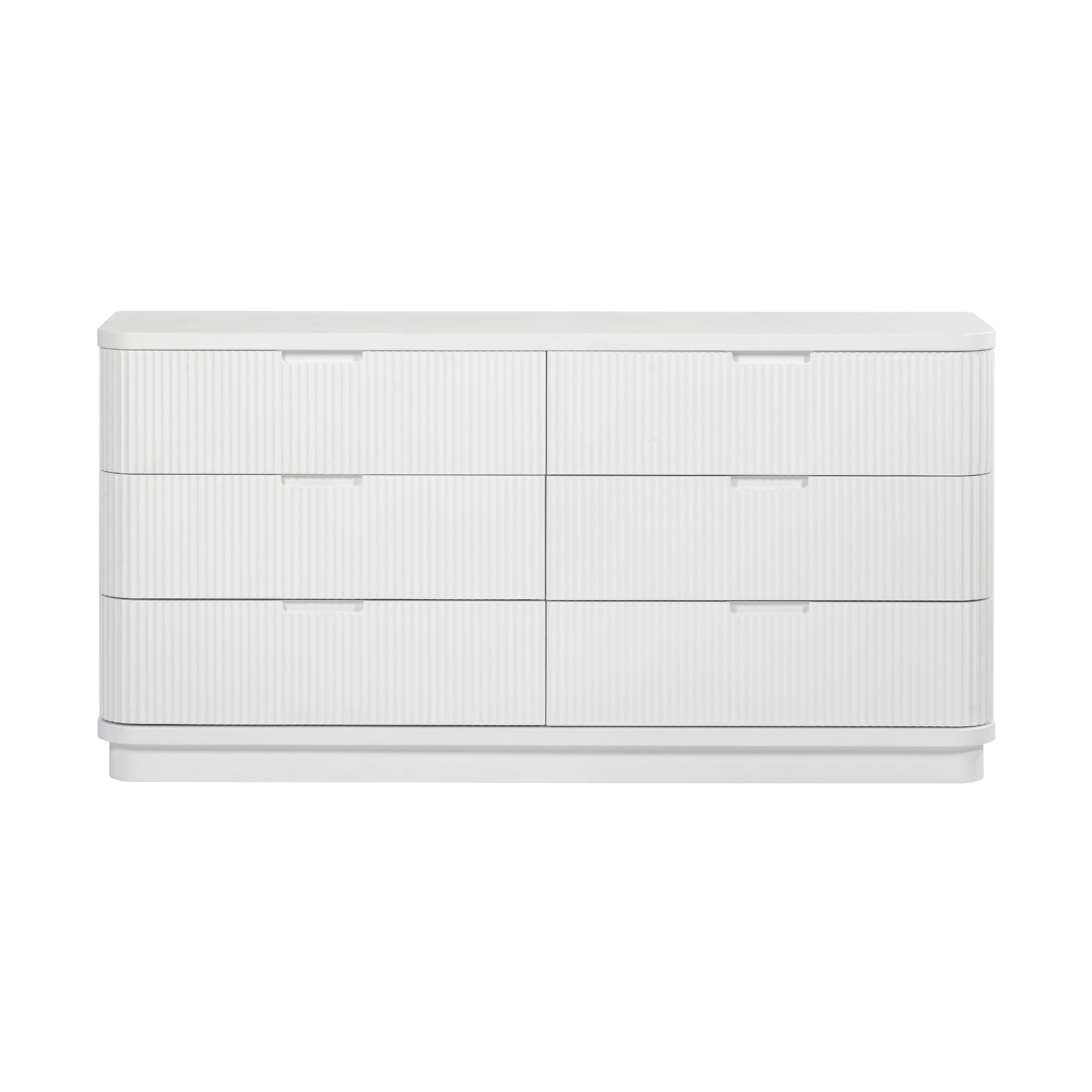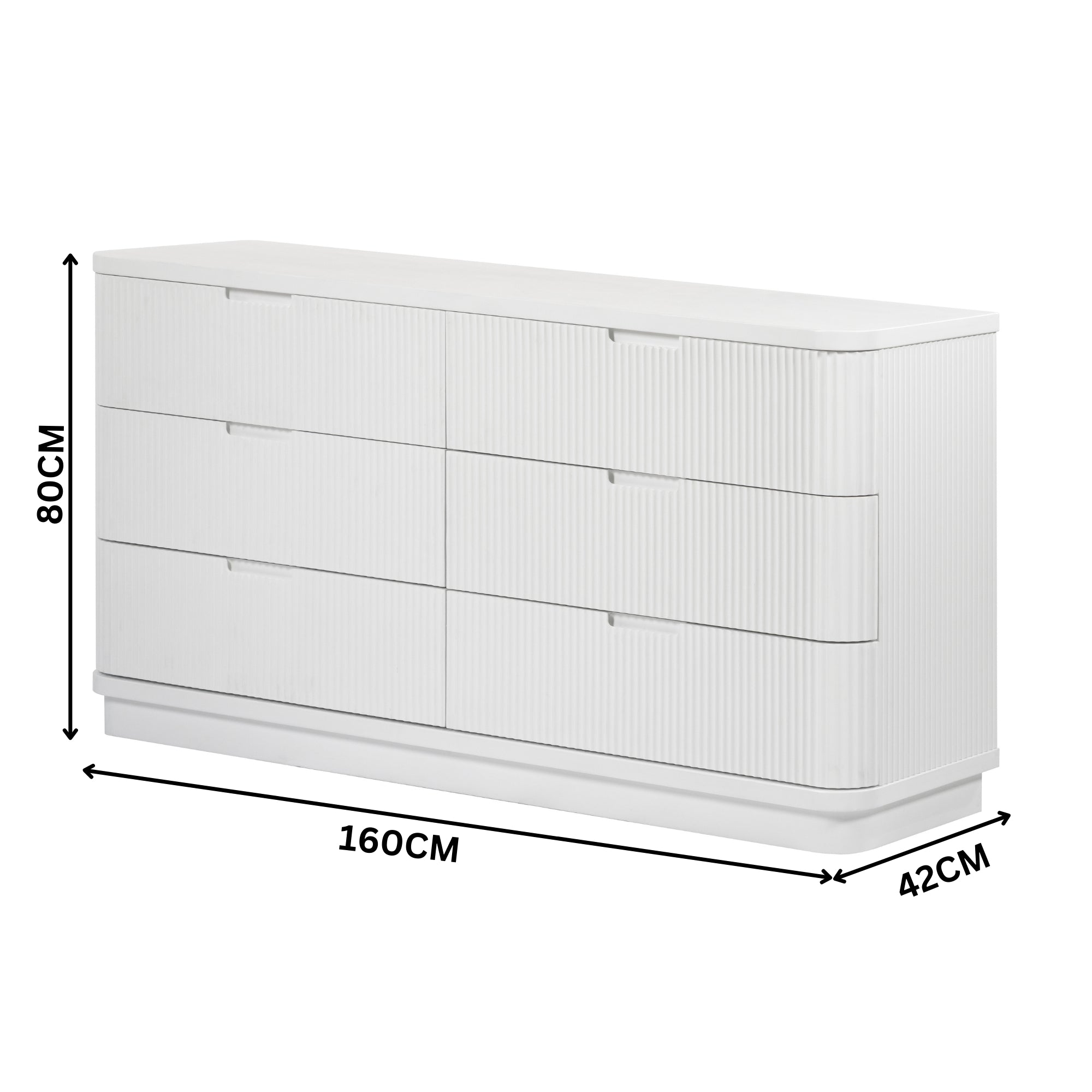 Introduce timeless elegance and practical storage to your bedroom with this 6 Drawer Dresser in White Colour - a perfect blend of contemporary design and everyday functionality. Crafted with a smooth MDF structure and a durable wood veneer top, this dresser offers long-lasting strength while maintaining a clean and refined aesthetic. The dresser features six spacious drawers, providing generous room for clothing, accessories, and bedroom essentials. Each drawer showcases beautifully crafted vertical grooves on the front and sides, adding subtle texture and enhancing its modern appeal. Finished in a crisp white colour, this dresser effortlessly brightens any space and complements a wide variety of bedroom interiors - from minimalistic and coastal to modern and classic. Thoughtfully designed to keep your room organised and visually serene, it's the perfect statement piece for both style and utility.