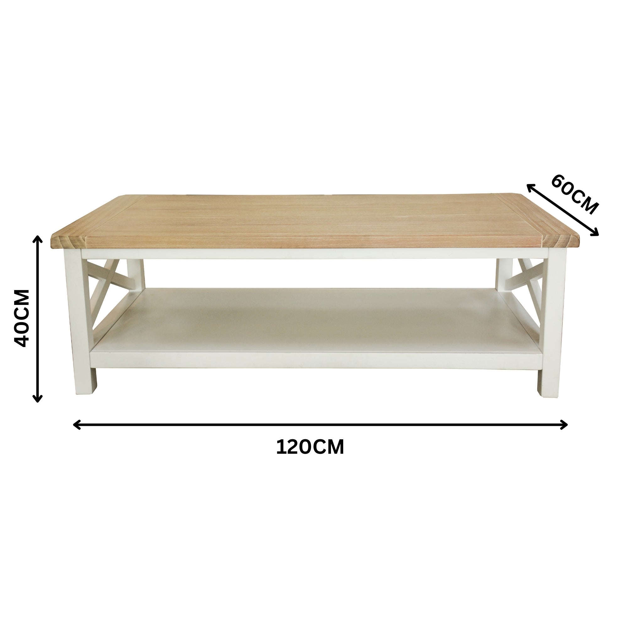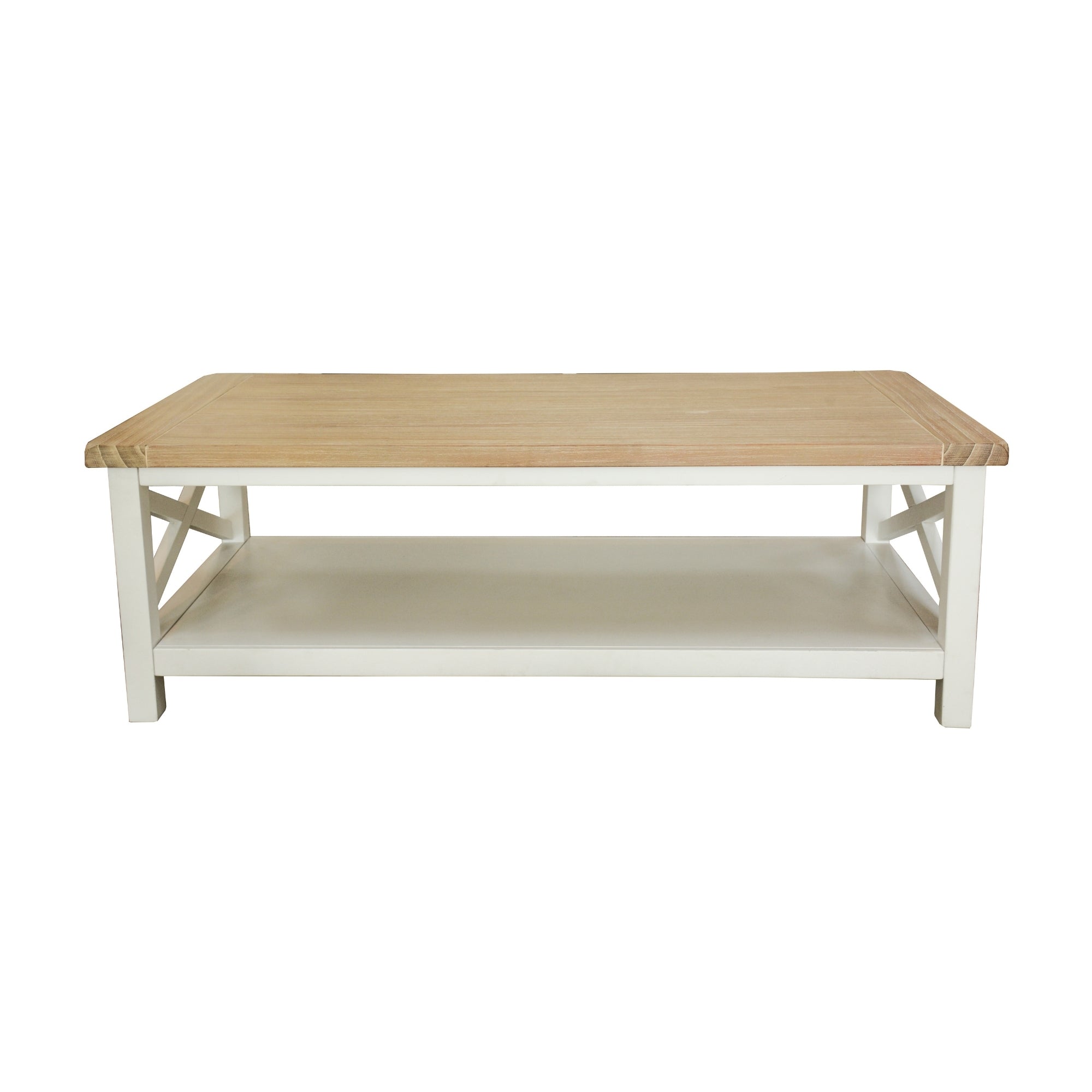 This gorgeous coffee table designed in a Hampton style gives a pleasing personality to living area. The table with a white painted base and contrast natural top in light oak looks great with chairs and lounges of any style. An X-shaped pattern gives it a unique look. The table is made of sustainably harvested solid acacia wood. The wood is known for its amazing strength, durability, shock-resistance, and ease of maintenance. A light oak wash finish enhances the natural grain of the acacia timber, and it matches effortlessly with a variety of interior decor styles and themes. A one-year warranty is included with the easy-to-assemble furniture piece.
