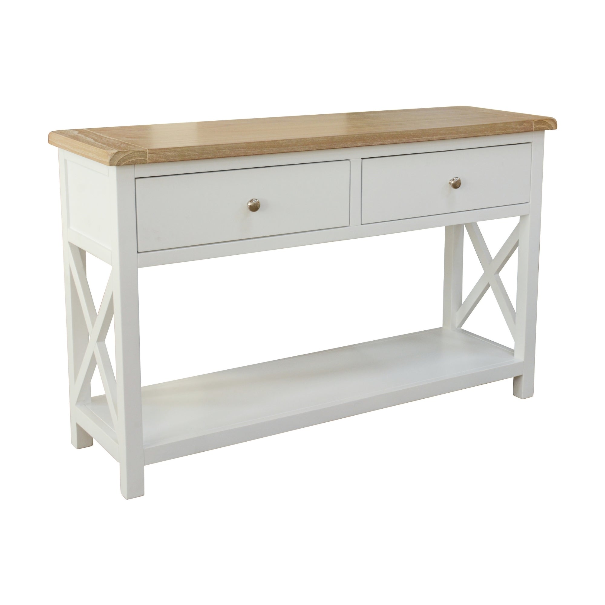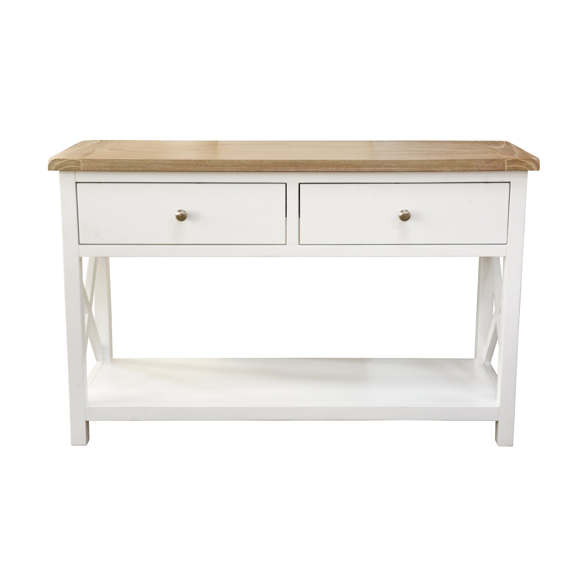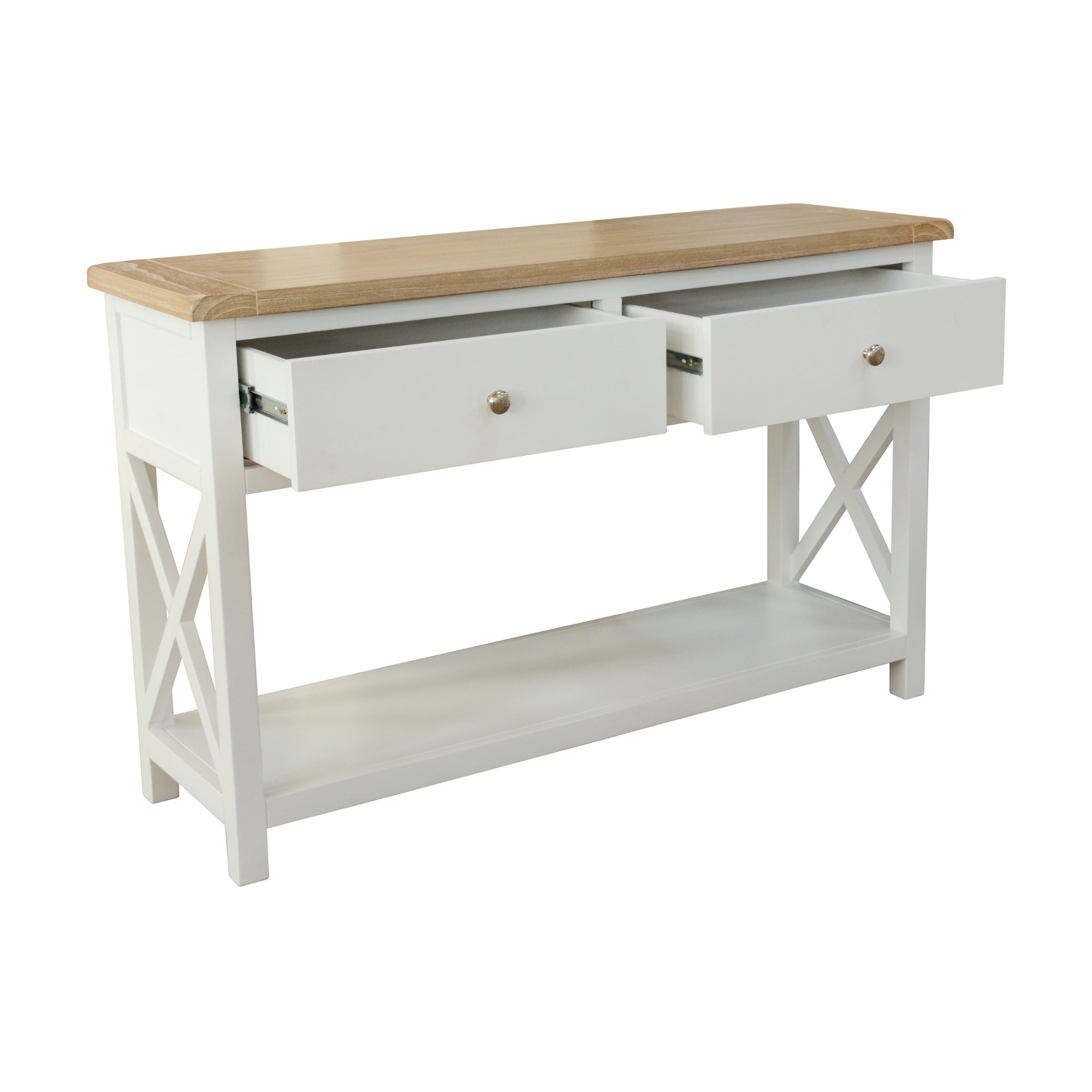 This charming console table designed in a Hampton style gives a pleasing personality to your living and dining area. The table has 2 spacious drawers The drawers have full metal extension runners and round metal handles in silver colour. An X-shaped pattern gives it a unique look. The furniture is made of sustainably harvested solid acacia wood. The wood is known for its amazing strength, durability, shock-resistance, and ease of maintenance. A light oak wash finish enhances the natural grain of the acacia timber. The table in light oak top and white base matches effortlessly with a variety of interior decor styles and themes, and a one-year warranty is included with the easy-to-assemble furniture piece.