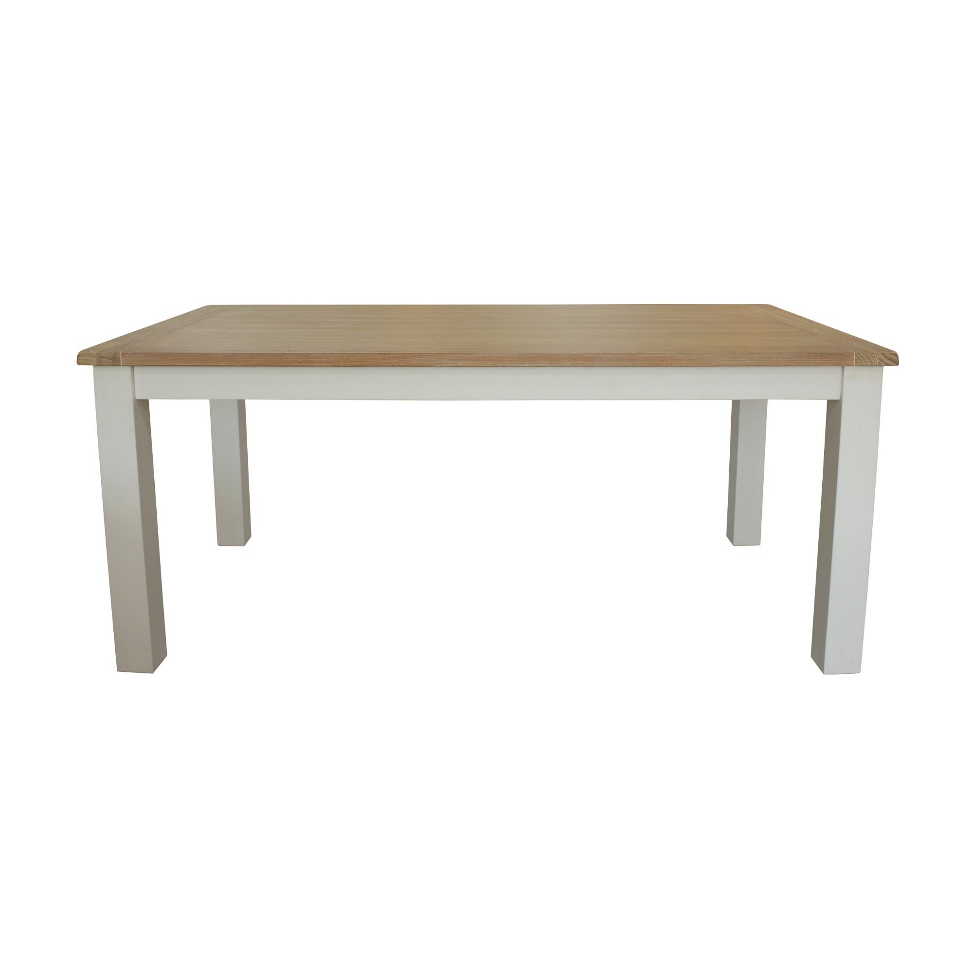 This 6-seater dining table designed in a Hampton style gives a pleasing personality to dining area.The table with a white painted base and contrast natural top in light oak looks great with dining chairs of any style. The table is made of sustainably harvested solid acacia wood. The wood is known for its amazing strength, durability, shock-resistance, and ease of maintenance. A light oak wash finish enhances the natural grain of the acacia timber, and it matches effortlessly with a variety of interior decor styles and themes. A one-year warranty is included with the easy-to-assemble furniture piece.