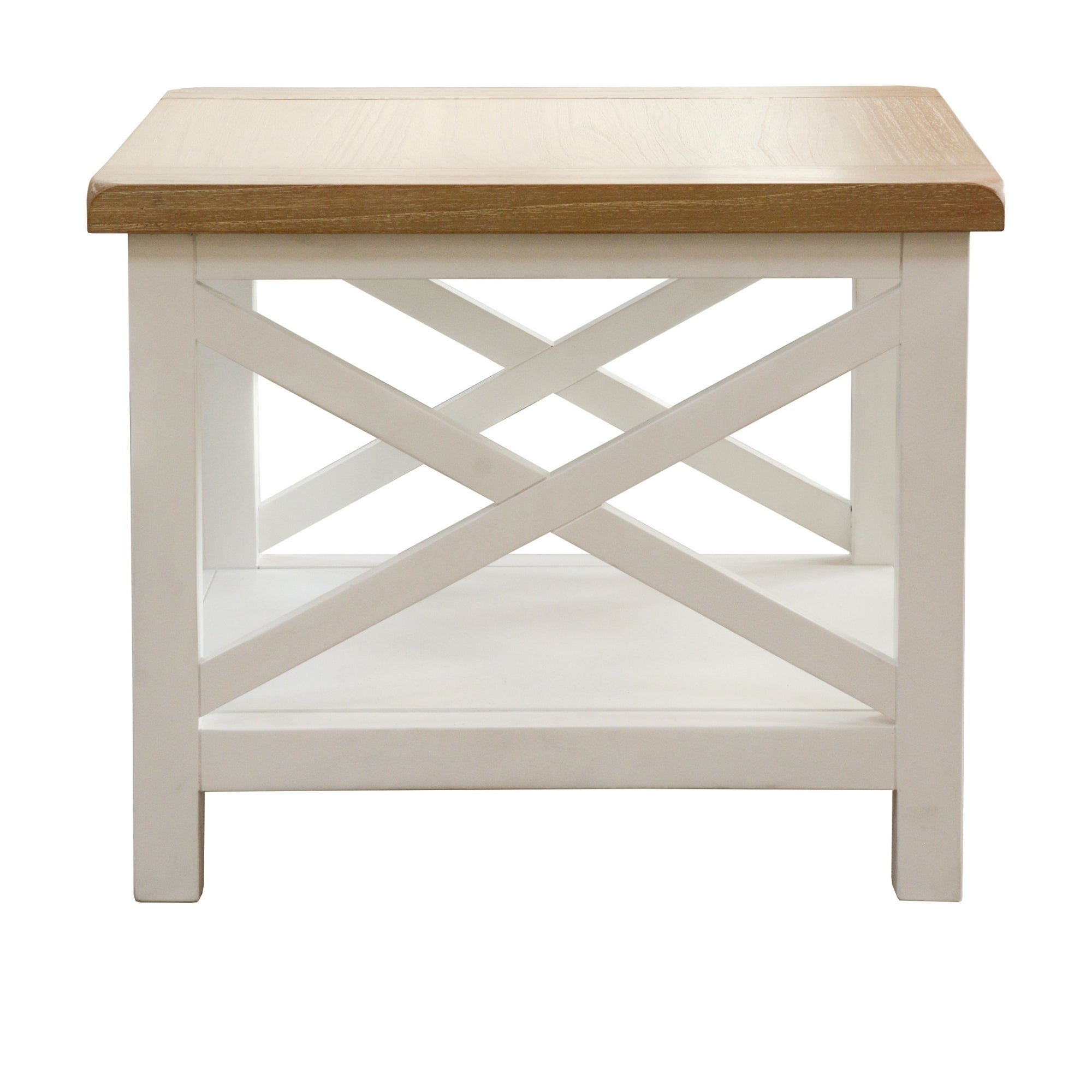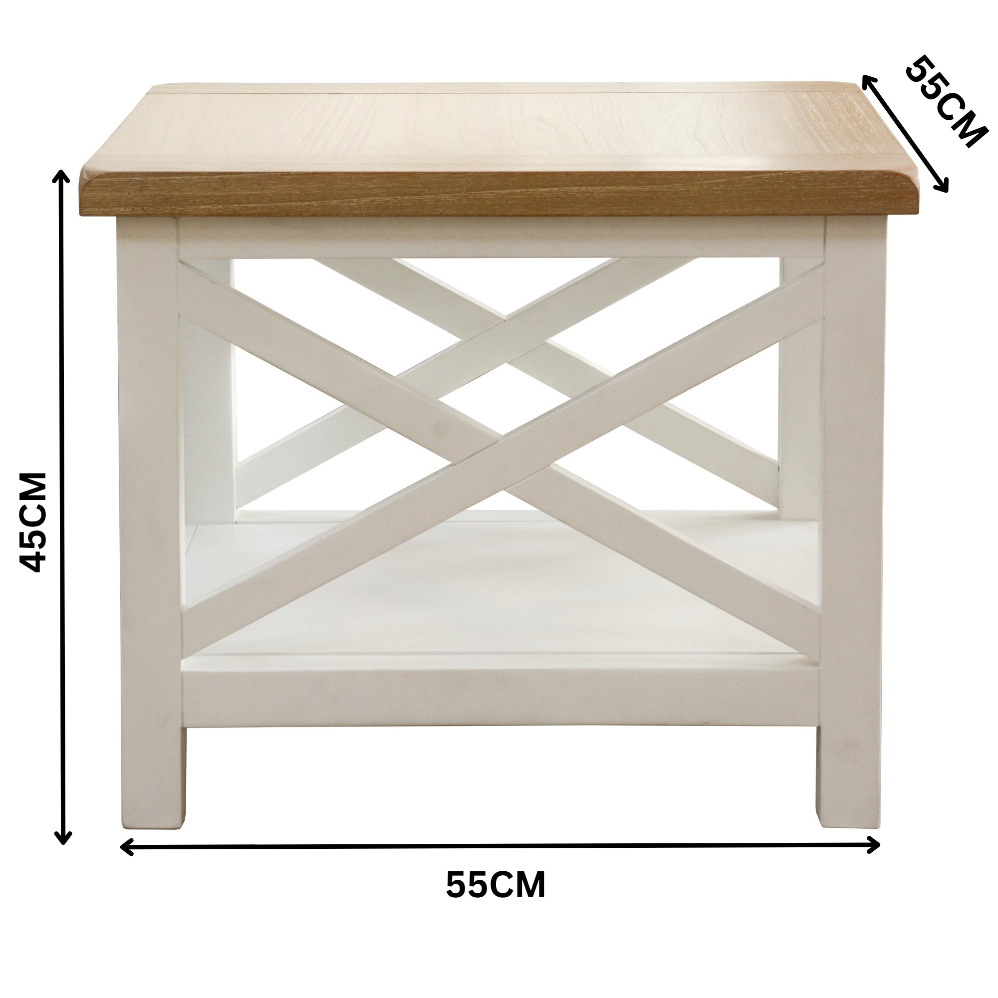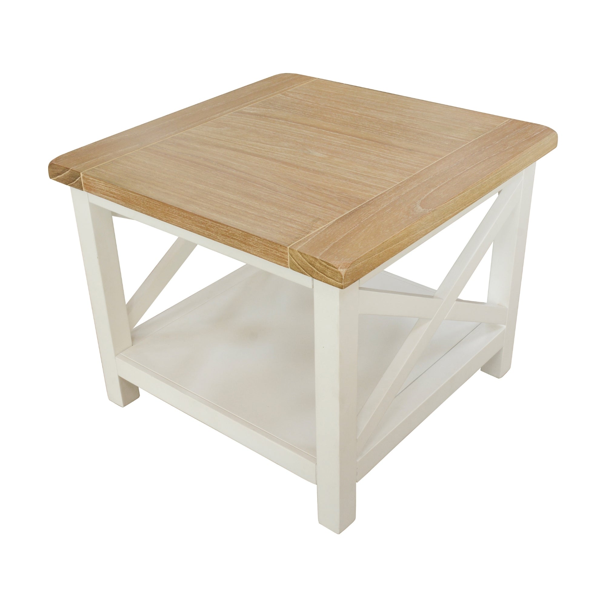 This gorgeous lamp table designed in a Hampton style gives a pleasing personality to living area. The table with a white painted base and contrast natural top in light oak looks great with furniture pieces of any style. An X-shaped pattern gives it a unique look. The table is made of sustainably harvested solid acacia wood. The wood is known for its amazing strength, durability, shock-resistance, and ease of maintenance. A light oak wash finish enhances the natural grain of the acacia timber, and it matches effortlessly with a variety of interior decor styles and themes. A one-year warranty is included with the easy-to-assemble furniture piece.