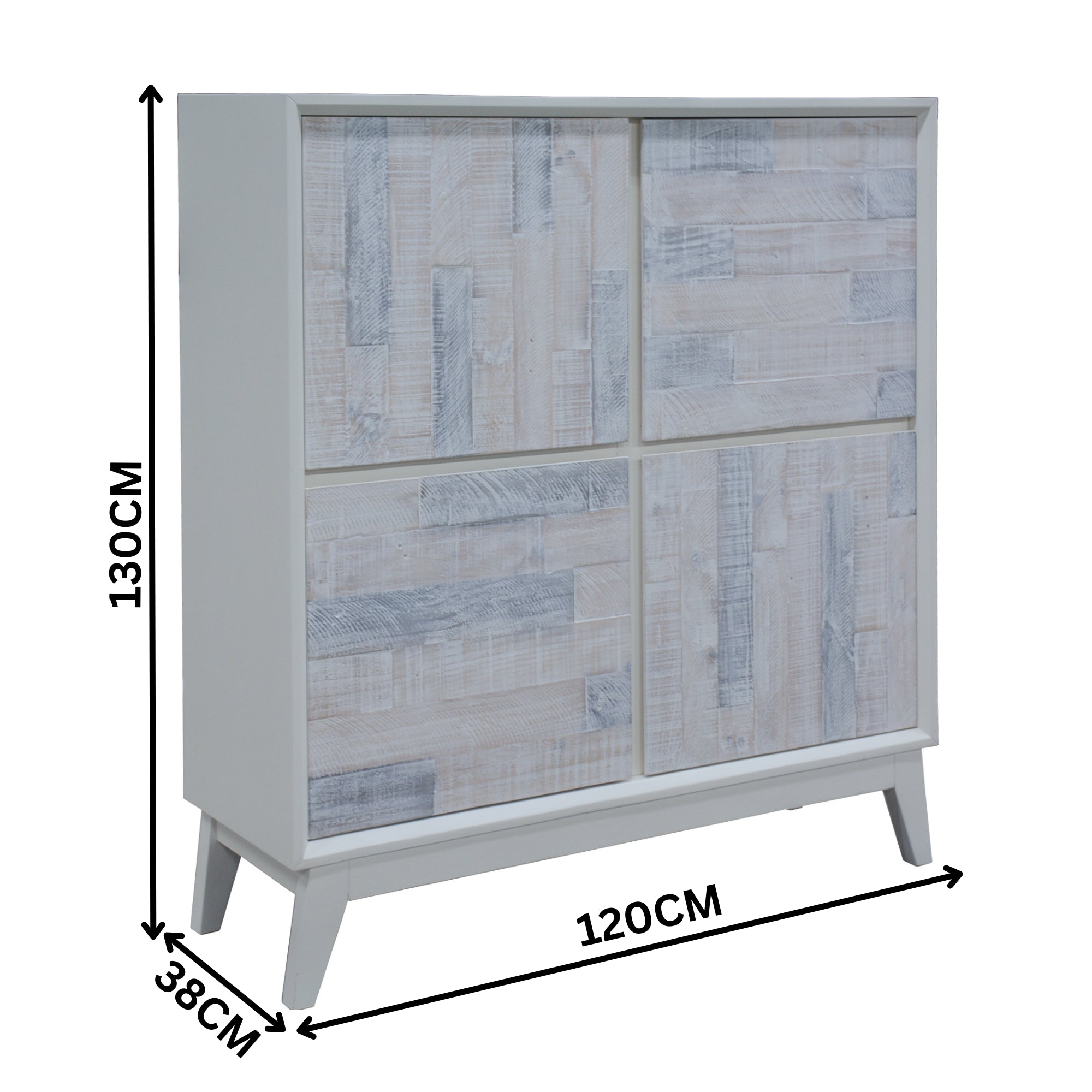 Add coastal warmth and mid-century charm to your home with this 120cm 4-Door Cabinet from the Mexican Collection. Inspired by the relaxed elegance of 1960s Mexican coastal design, this cabinet blends handcrafted artistry with timeless durability, making it a perfect addition to contemporary, rustic, or beachside interiors. Crafted from solid recycled pine, each cabinet showcases the beauty of naturally weathered timber - complete with unique nail holes, knots, and grain variations that give every piece a story of its own. The hand-applied whitewash finish undergoes a meticulous multi-step distressing process, offering a distinctive, aged look that enhances the collection's nostalgic charm. To ensure lasting strength, each piece is sealed with a clear lacquer coating for added protection and durability. Designed with everyday practicality in mind, this 4-door cabinet includes soft-close adjustable hinges for quiet operation and full-extension side-mounted metal runners that make access effortless. The spacious internal storage provides ample room for tableware, linens, or personal items - ideal for living, dining, or hallway settings.