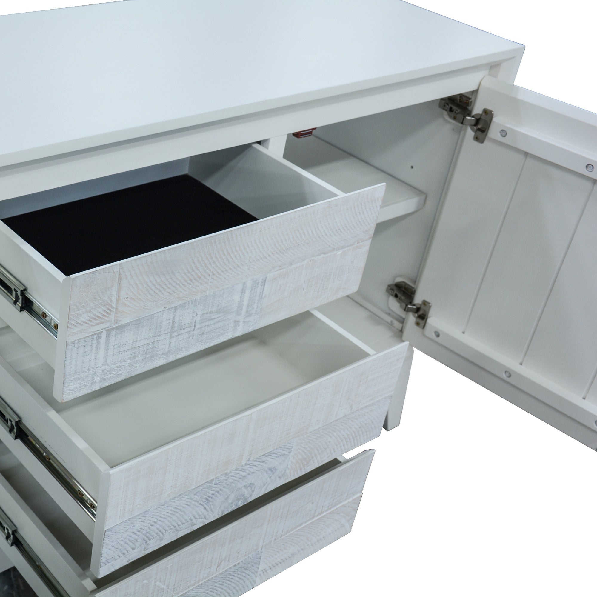 Bring home the timeless beauty of mid-century coastal design with this Buffet from the Mexican Collection, inspired by the effortless charm of the 1960s seaside aesthetic. Crafted from solid recycled pine, this buffet is a true statement of craftsmanship and sustainability. Every piece carries the marks of its history - visible nail holes, screw impressions, and distinctive wood grain patterns - ensuring that no two pieces are ever alike. The buffet features a hand-applied whitewash finish, meticulously distressed through a multi-step artisanal process, and sealed with a clear lacquer for lasting protection. Its solid pine structure guarantees durability, while full-extension metal drawer runners and soft-close adjustable door hinges enhance functionality and everyday convenience. Perfect for both modern coastal and rustic interiors, this buffet offers ample storage for dinnerware, glassware, or decorative pieces, making it a versatile and stylish addition to your dining or living area.