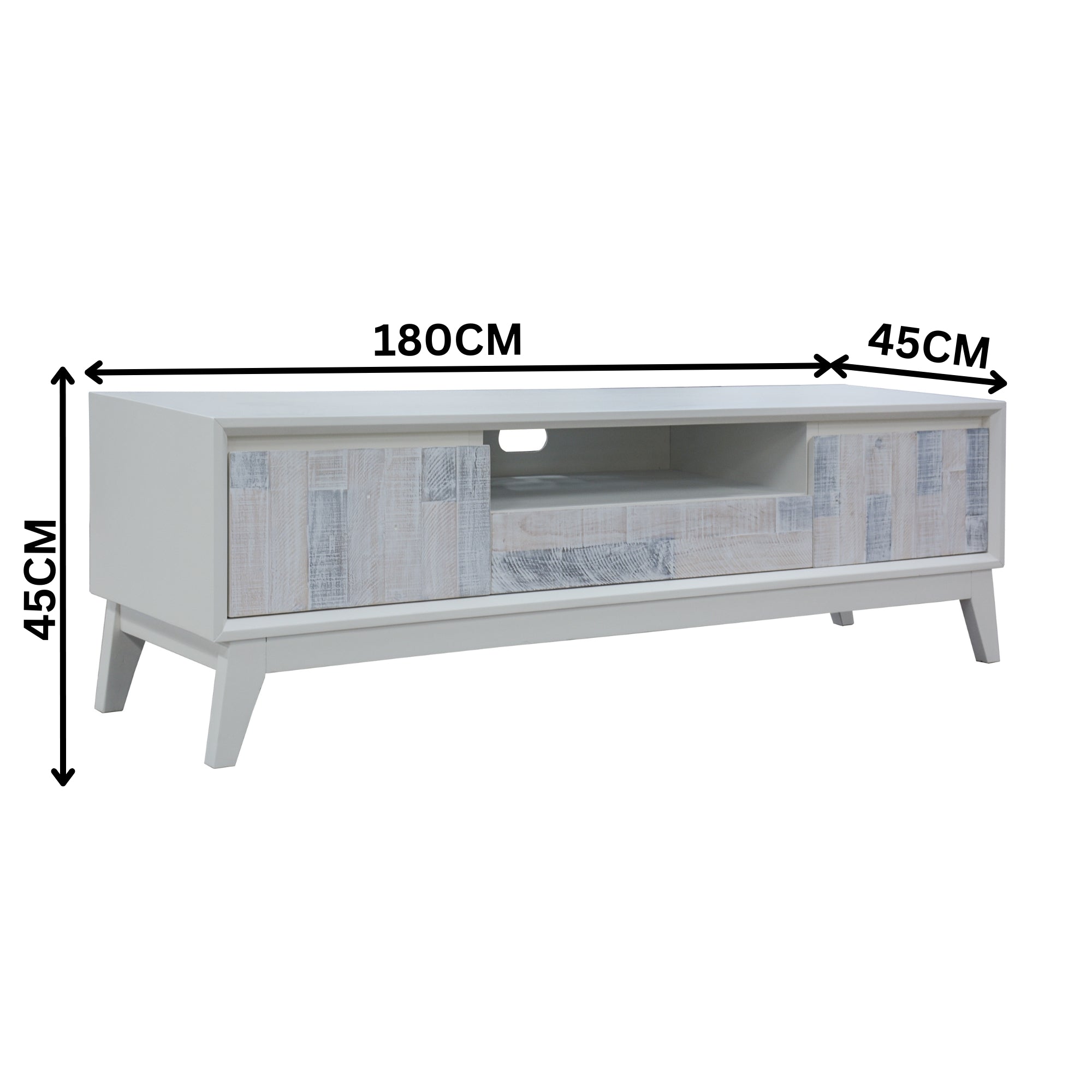 Bring timeless mid-century style into your living room with this ETU from the Mexican Collection & a stunning blend of coastal charm, rustic craftsmanship, and modern functionality. Inspired by the effortless aesthetics of 1960s coastal Mexico, this entertainment unit showcases authentic hand-finished details and thoughtful design made to elevate your home decor. Crafted from solid recycled pine, each piece tells its own story - featuring old nail and screw holes, natural grain variations, and rich textures that celebrate the beauty of reclaimed timber. The hand-applied whitewash finish undergoes a meticulous multi-step distressing process, creating a soft, weathered look that radiates warmth and character. A clear lacquer coating adds a layer of durability and protection, ensuring longevity while maintaining its natural charm. Designed for both aesthetics and practicality, the ETU includes full extension side-mounted metal drawer runners, soft-close door hinges, and adjustable fittings to maintain perfect alignment. Ideal for contemporary coastal interiors or rustic spaces, this entertainment unit provides ample storage for media essentials while serving as a striking focal point in your living area.