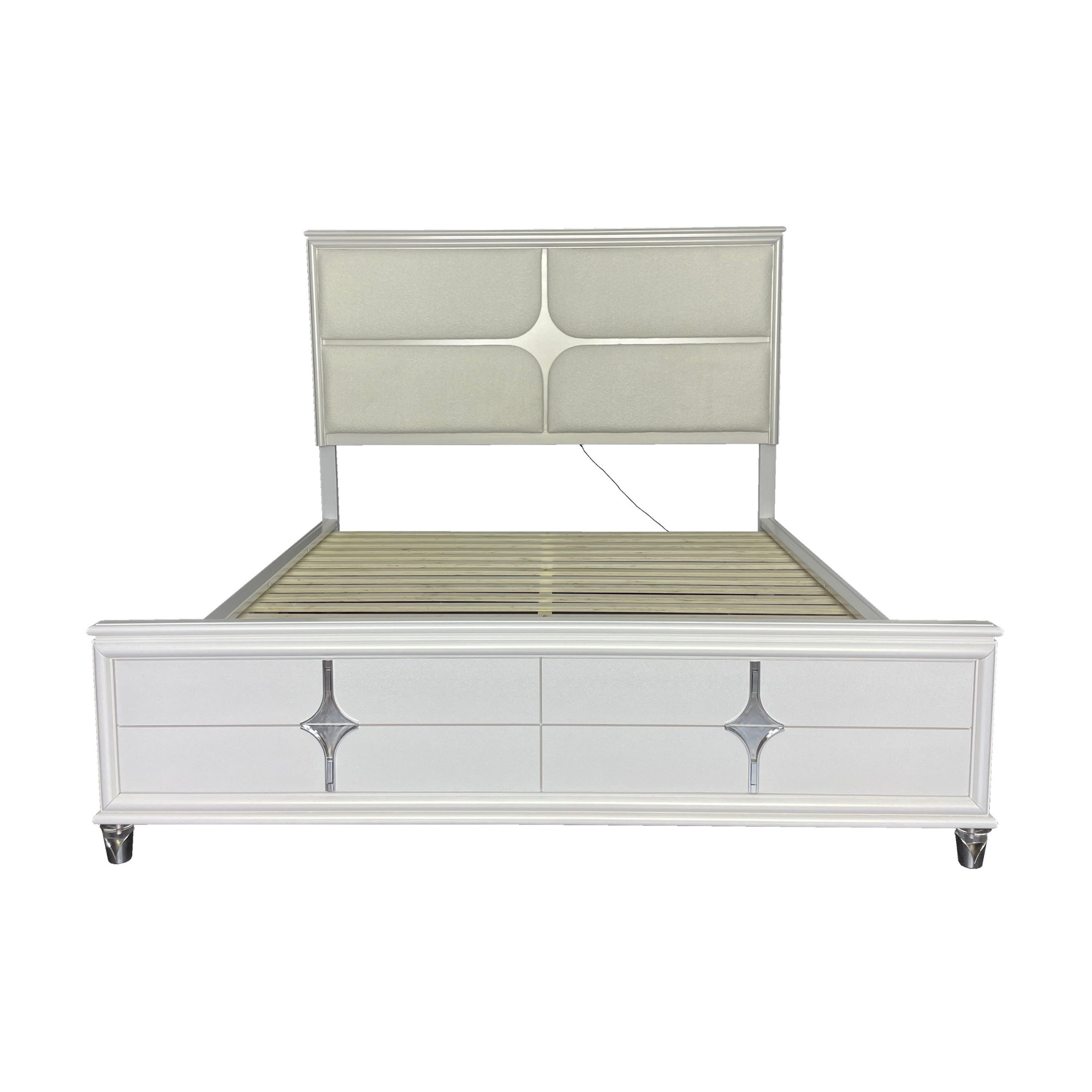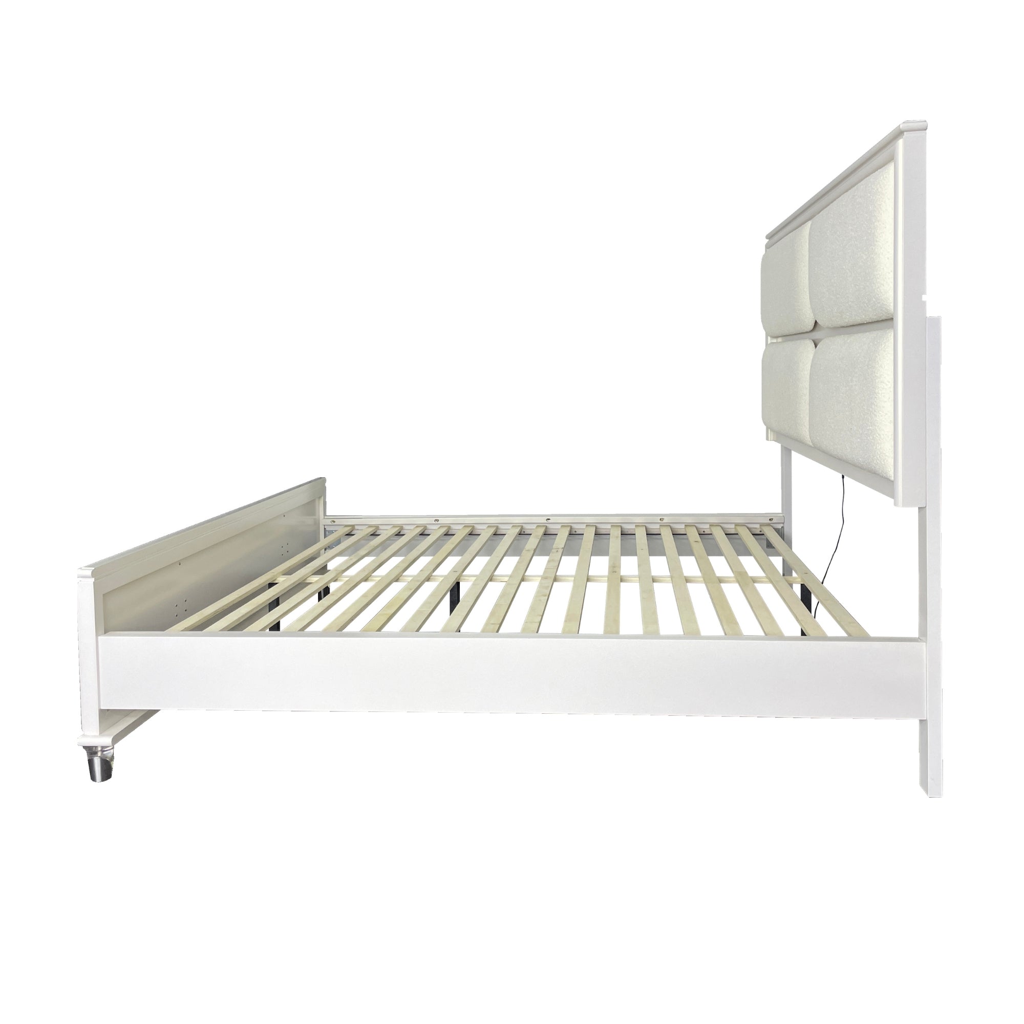 Experience the perfect blend of luxury and functionality with our Queen Bed with Light. This glamorous piece showcases a tall, upholstered headboard in a soft gold finish, enhanced by warm LED lighting for a cozy ambiance. Thoughtfully designed with USB and Type-C chargers on both sides, it seamlessly integrates modern convenience. Durable rubberwood construction, chrome-accented Perspex feet, and central support ensure lasting quality and style. A true centerpiece for any elegant bedroom.