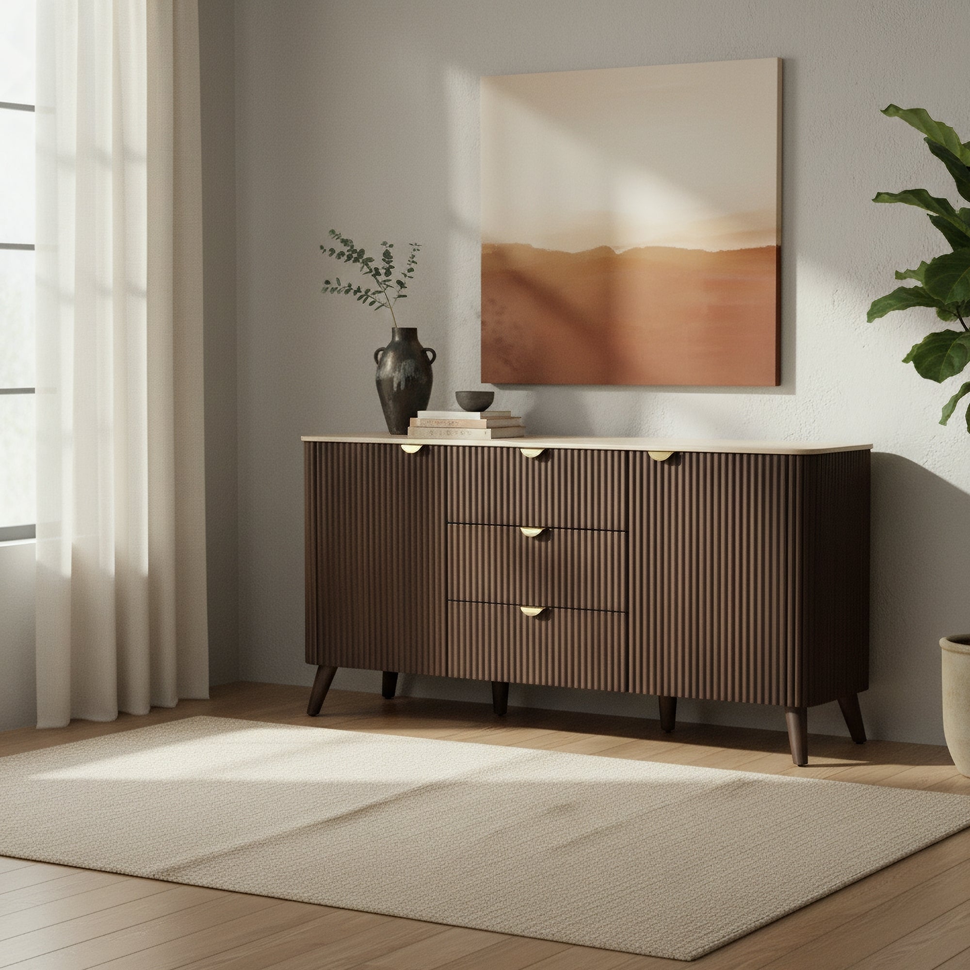 Add a touch of elegance and functionality to your dining area with our 3 Drawer / 2 Door 160cm buffet that combines elegance, durability, and functionality in one timeless piece. Designed with a sintered stone travertine top that is both scratch- and stain-resistant, this buffet is built for everyday living with minimal maintenance. The walnut-finished solid and veneer Malaysian hardwood base offers warmth and strength, while the gold metal handles bring a touch of luxury. With soft-closing doors, adjustable shelves, and full extension metal runners on solid timber drawers, this buffet provides ample storage while maintaining a sleek, contemporary look. Perfect for dining, living, or entertaining spaces.