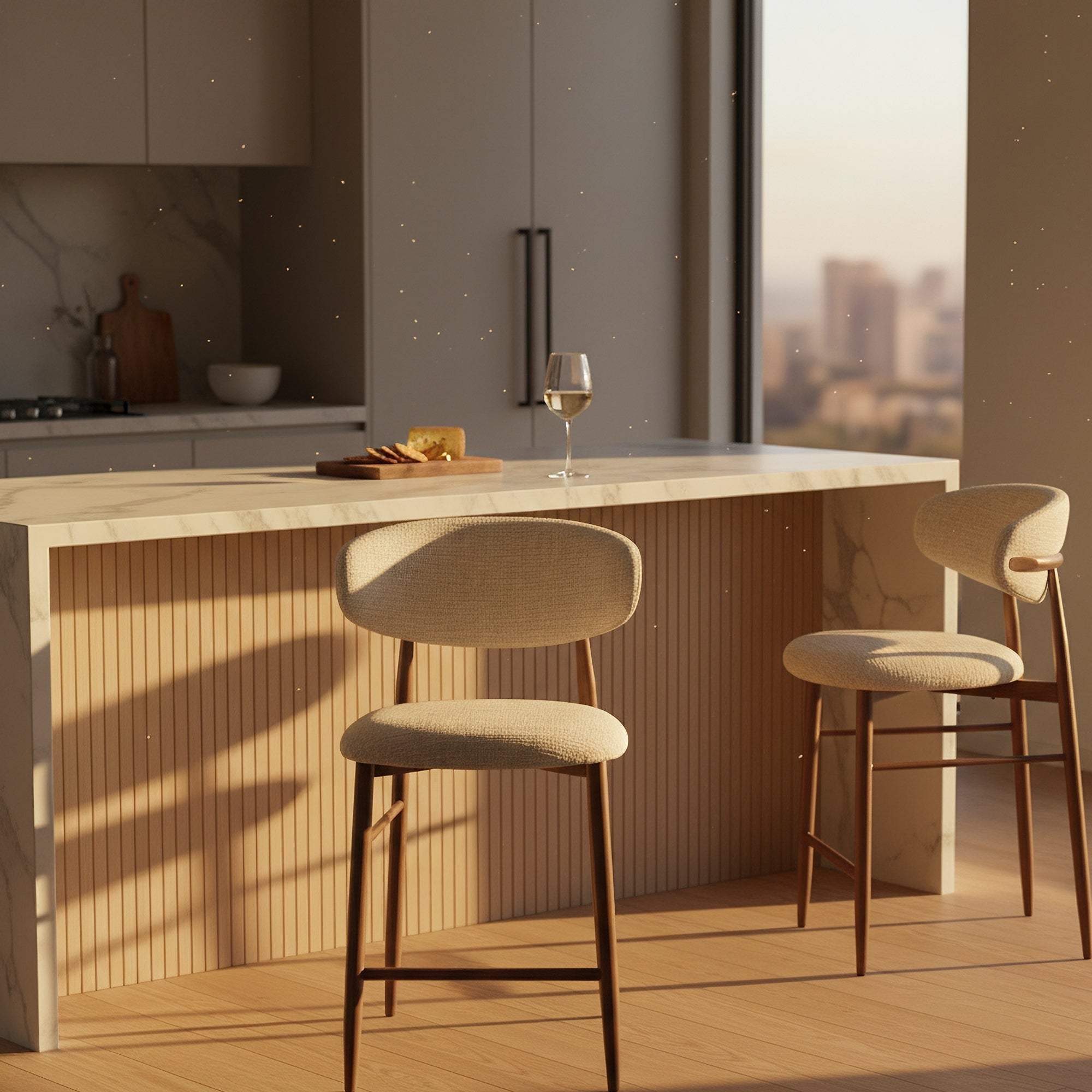This set of 2 pc bar chair in beige colour is the perfect blend of modern comfort and timeless style. Upholstered in 100% polyester texture fabric in a soft beige tone, it adds warmth and elegance to any dining or bar space. Supported by walnut-coloured metal legs, this chair offers both stability and a sleek contemporary look. Its versatile design makes it easy to pair with a variety of bar tables, while the cushioned seat ensures a comfortable dining experience for everyday use or special occasions.