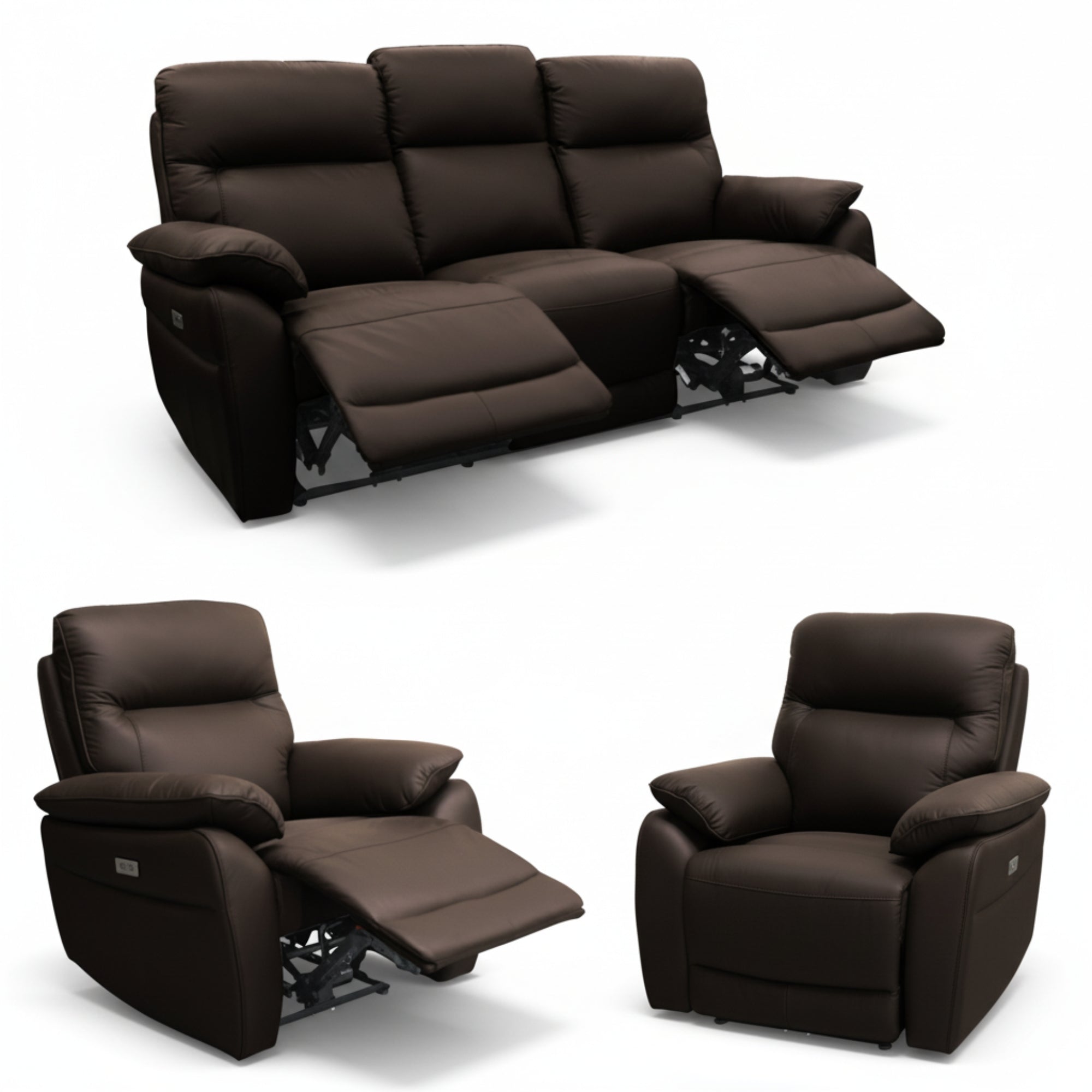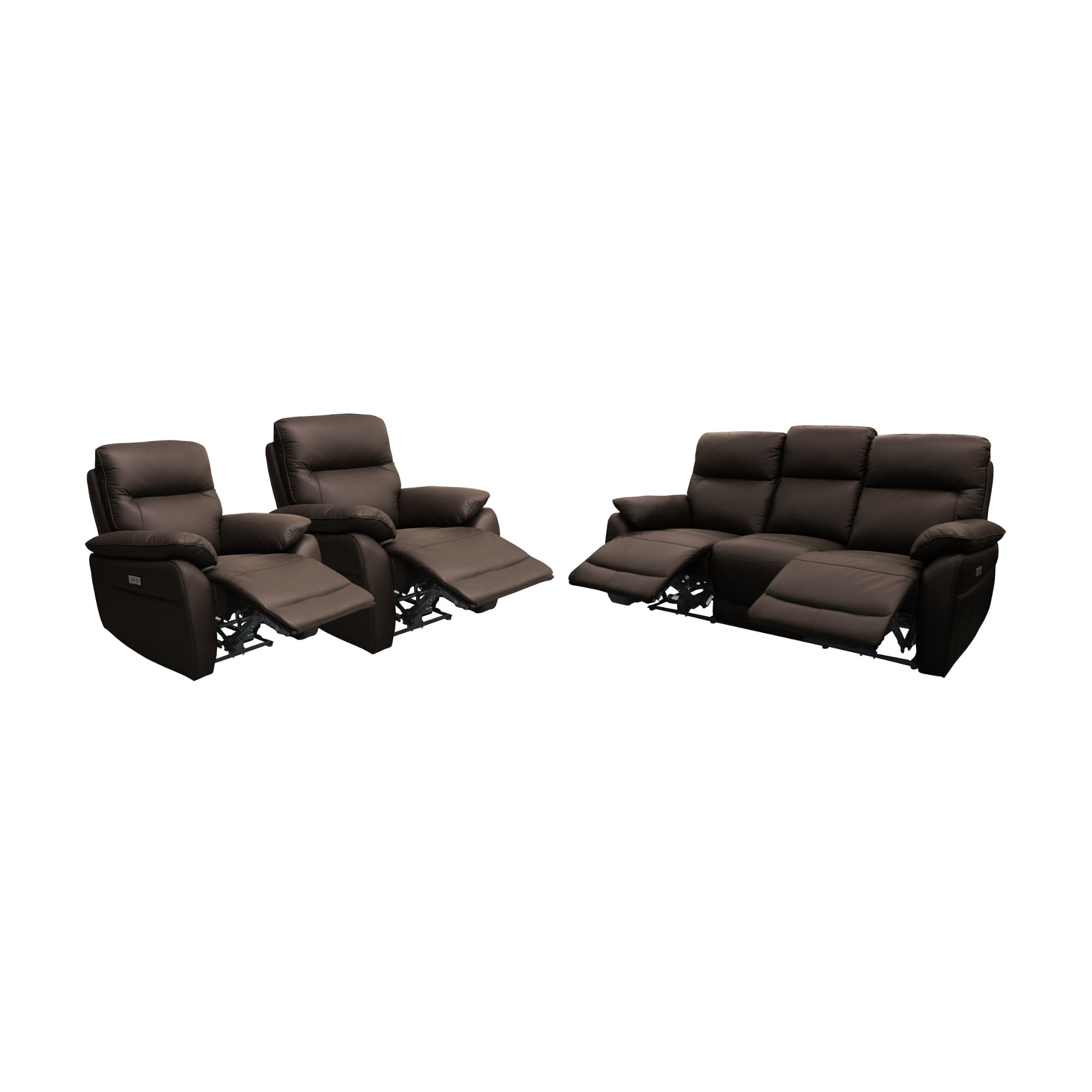 Relax in ultimate style and comfort with 3ERER+ER+ER Recliner Set, designed for modern homes. Crafted with a hardwood and plywood frame, this set features plush full leather upholstery in a sophisticated chocolate color. Each seat is equipped with an electric recliner mechanism with a USB charging port, allowing you to unwind while keeping your devices powered. The padded armrests, headrests, and additional lumbar support ensure luxurious seating, while the durable S spring and pocket spring system with 32D foam density provide exceptional support and durability.
