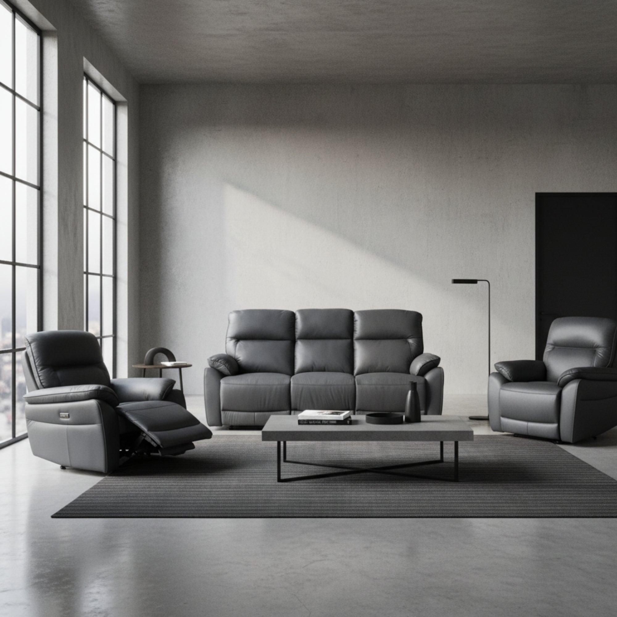 Relax in ultimate style and comfort with 3ERER+ER+ER Recliner Set, designed for modern homes. Crafted with a hardwood and plywood frame, this set features plush full leather upholstery in a sophisticated graphite color. Each seat is equipped with an electric recliner mechanism with a USB charging port, allowing you to unwind while keeping your devices powered. The padded armrests, headrests, and additional lumbar support ensure luxurious seating, while the durable S spring and pocket spring system with 32D foam density provide exceptional support and durability.