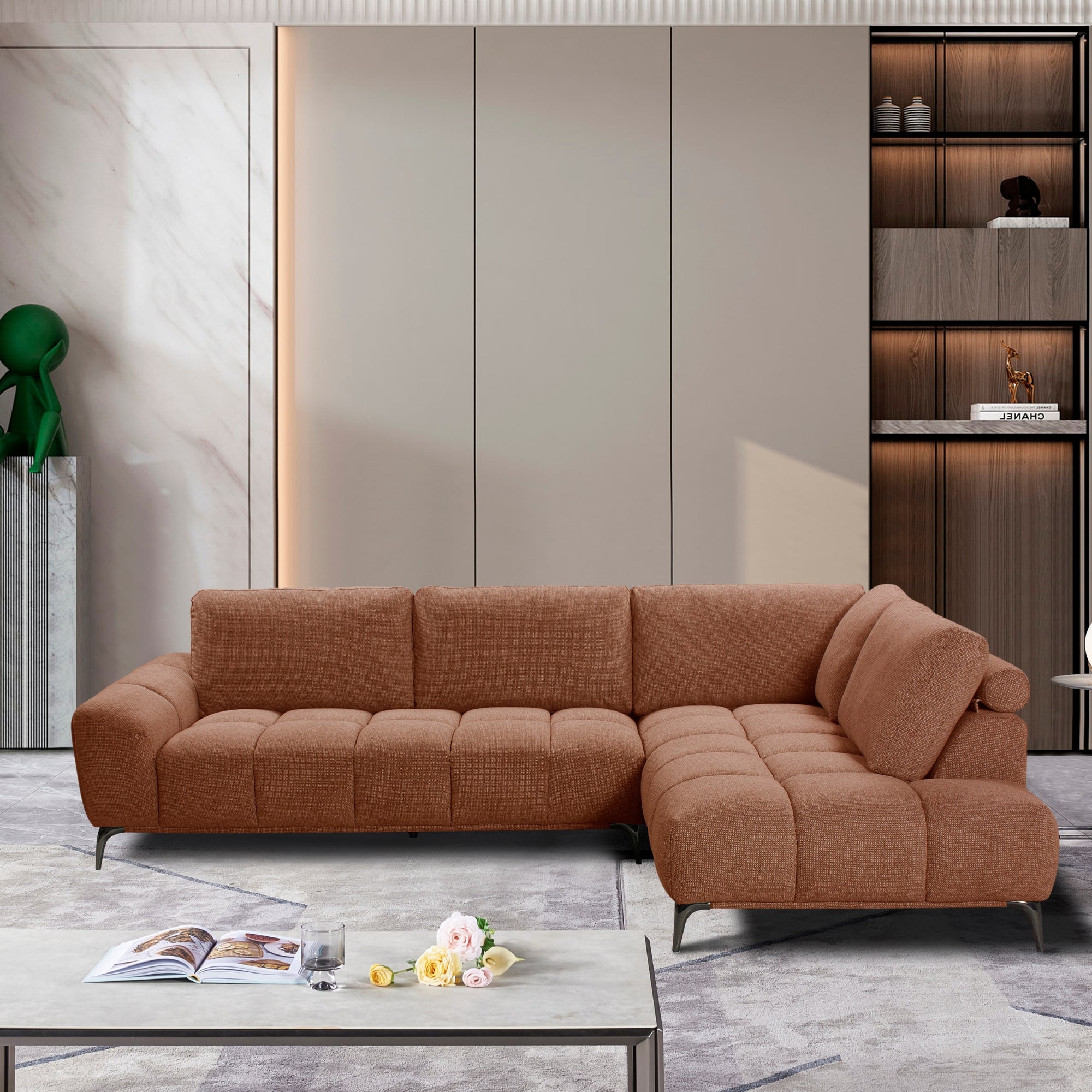 Transform your living space with this Corner Sofa in Rust colour, a statement piece that blends modern elegance with luxurious comfort. Designed with a 3-seater and RHF chaise, this sofa offers ample space for family lounging, entertaining guests, or relaxing after a long day. The wide channel-tufted seat design and plush back cushions provide both visual appeal and superior comfort, while the sleek black metal legs add a contemporary touch. Upholstered in soft yet durable 100% polyester fabric, the rust colour palette creates a versatile and inviting atmosphere suitable for any decor style. Built on a sturdy plywood and eucalyptus frame, the sofa's structure ensures lasting strength and durability. The combination of foam, S-spring, pocket spring, and webbing support offers excellent seating comfort and resilience. Perfectly balanced between comfort and style, the Corner Sofa - rust brings a modern, cozy touch to your home.