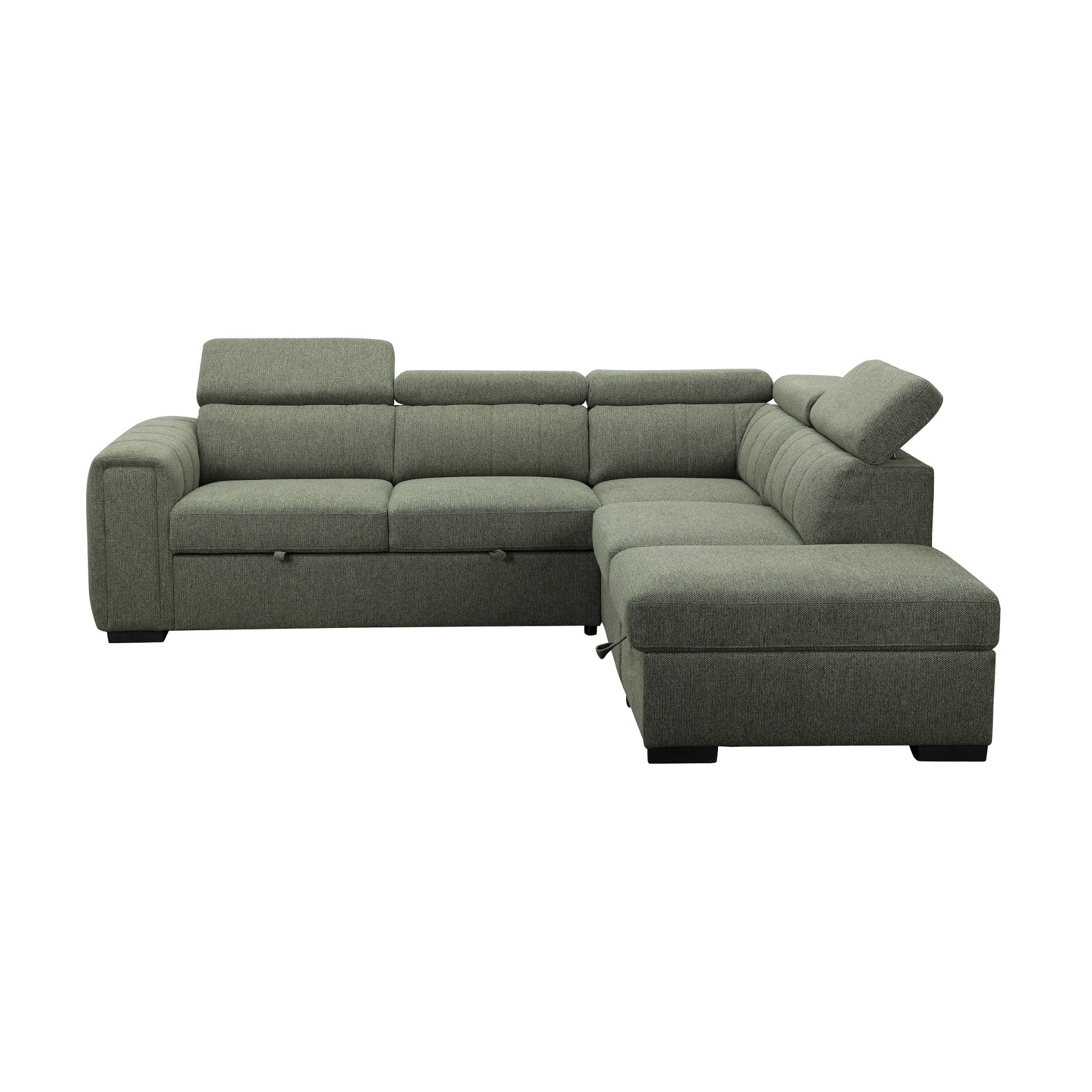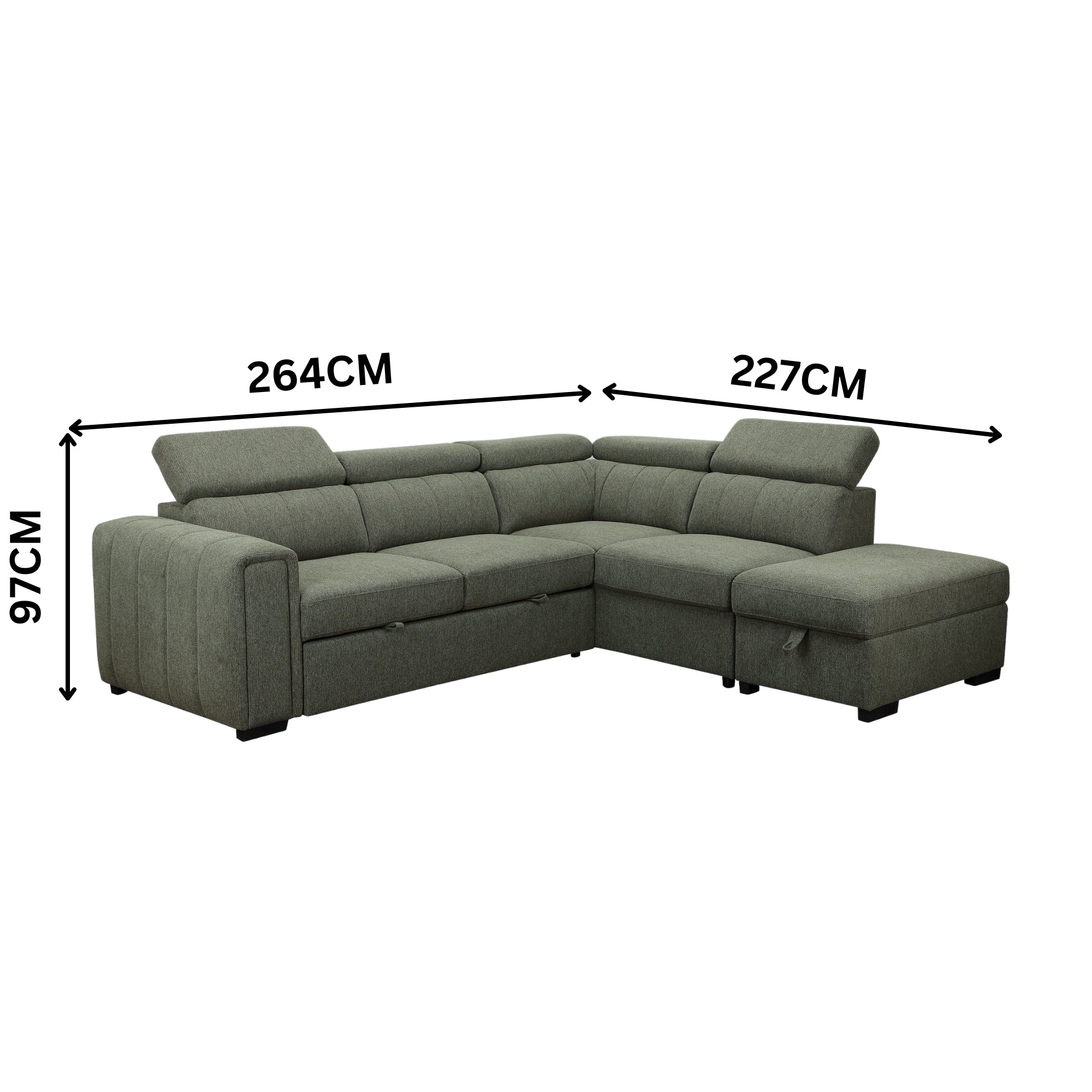 Maximize your living space with the versatile Corner Sofabed with RHF Storage Ottoman. This multifunctional piece features a convertible sectional design that transforms into a pull-out sofabed, ideal for overnight guests. Upholstered in durable green polyester fabric, it combines style and practicality with manual adjustable headrests, plush high-density foam seating, and a lift-top storage ottoman for added convenience. Perfect for compact spaces, this sofa blends comfort, functionality, and modern aesthetics.